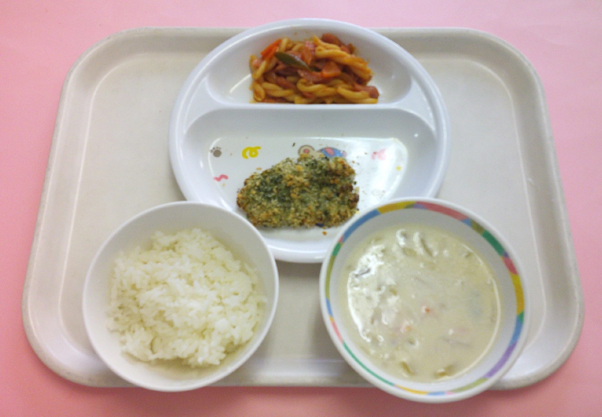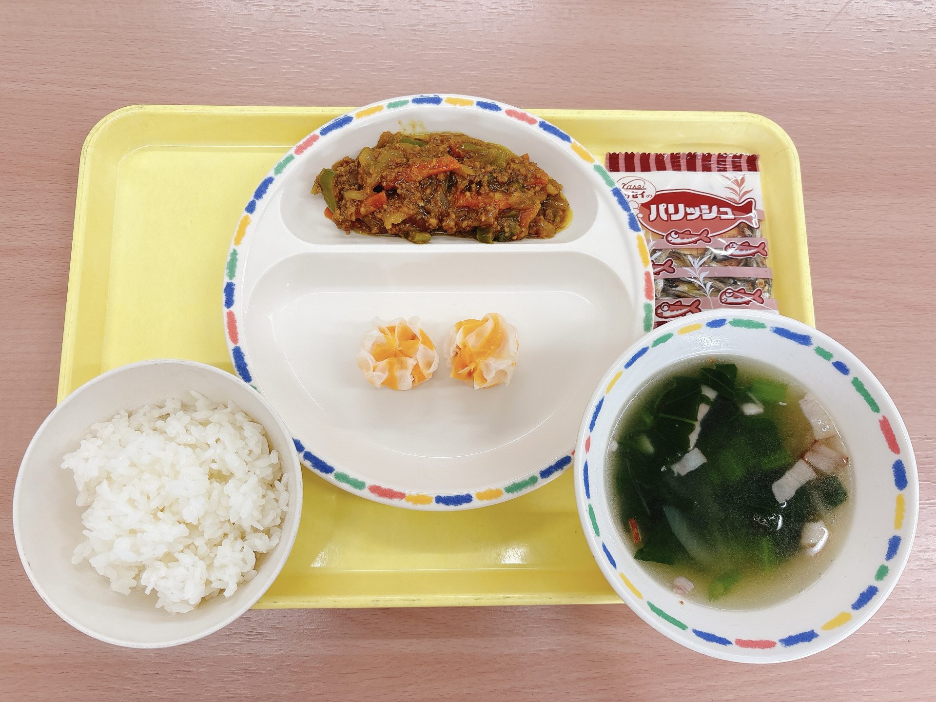 ・ご飯・にんじんしゅうまい・小松菜のスープ・ドライカレー・パリッシュ