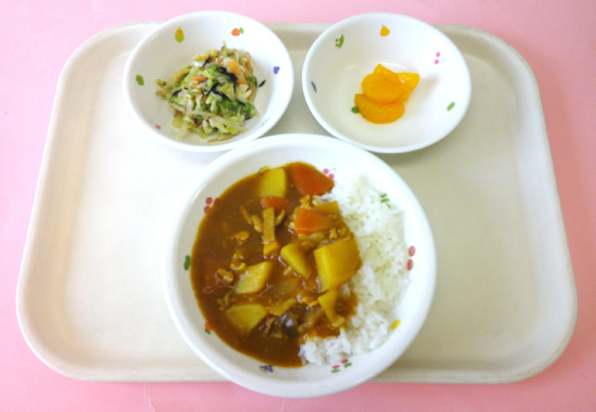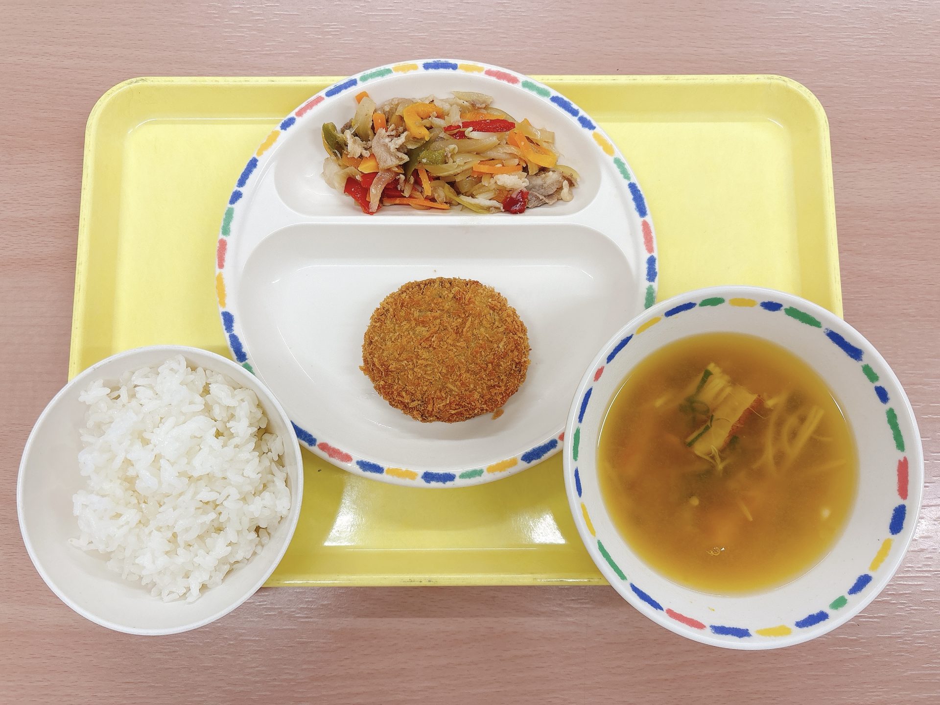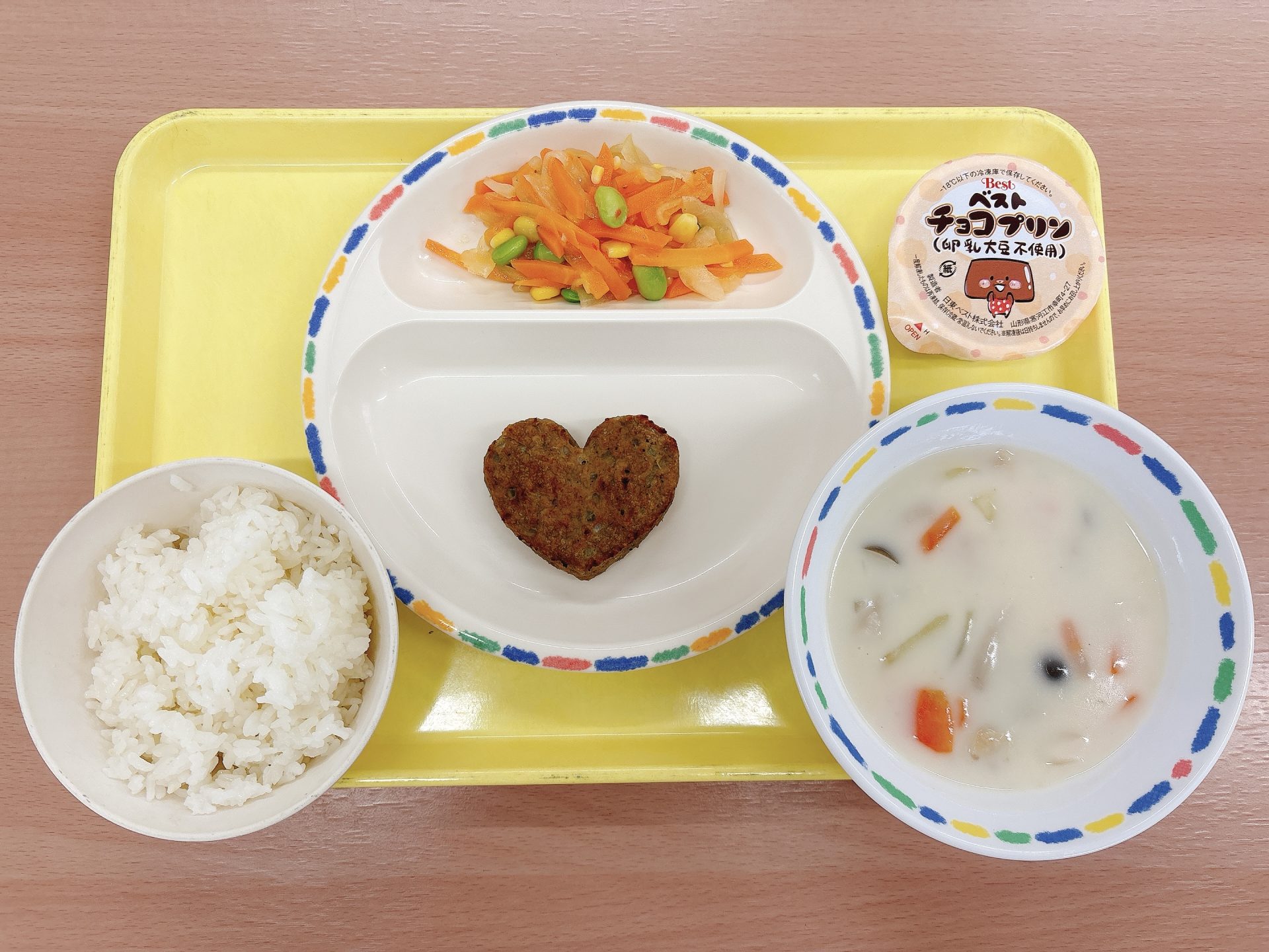 2026年02月13日 本日の給食 ・ご飯・ハートのハンバーグ・シチュー・キャロットサラダ・チョコプリン 今日の鳥取県産食材:米、にんじんバレンタインメニュー:明日はバレンタインなのでハートのハンバーグです❤️