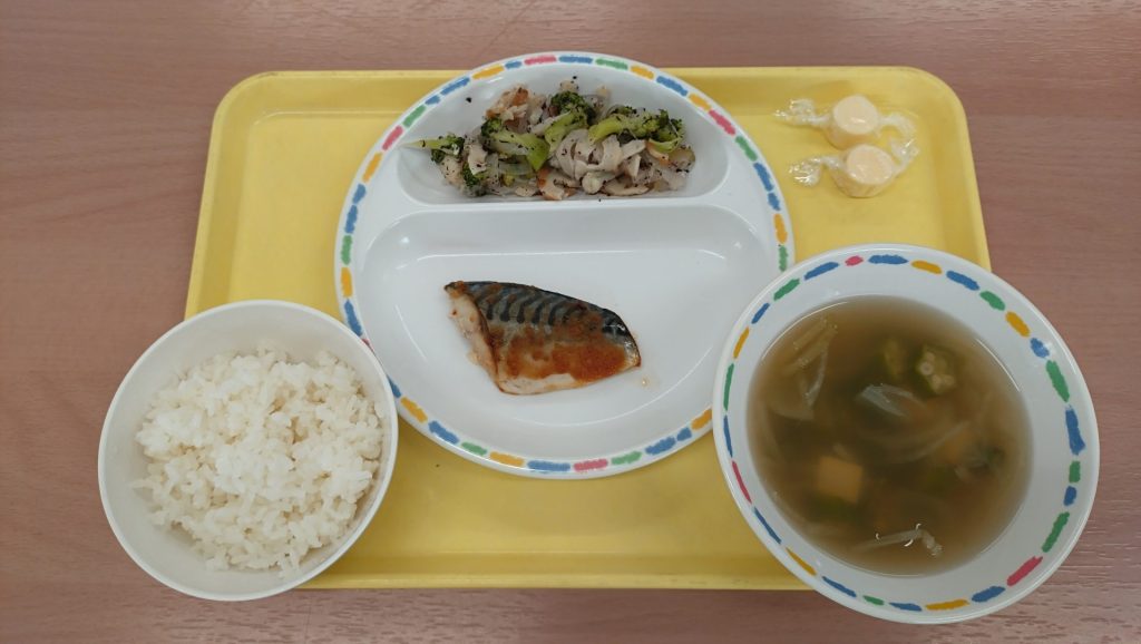 ・ご飯・さばの西京焼き・オクラのすまし汁・カリフラワーのゆかり和え・チーズ