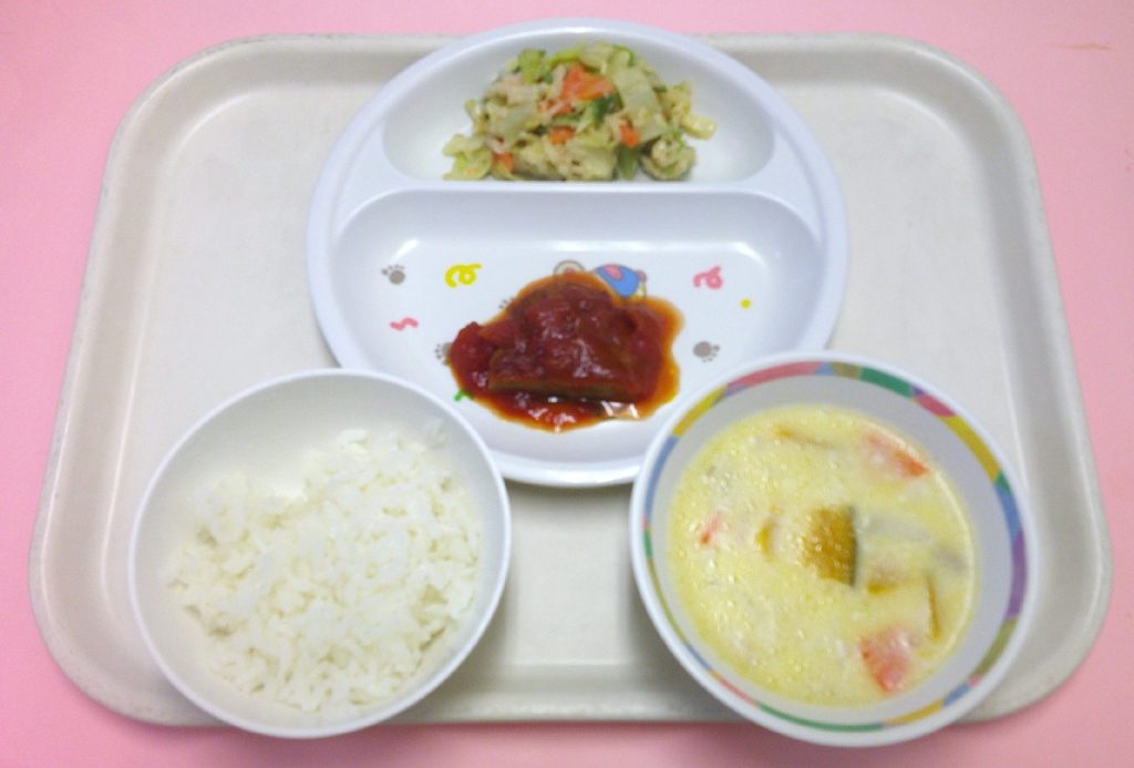 ・ご飯・赤魚のソテー・かぼちゃのポタージュ・アスパラサラダ・おさかなふりかけ