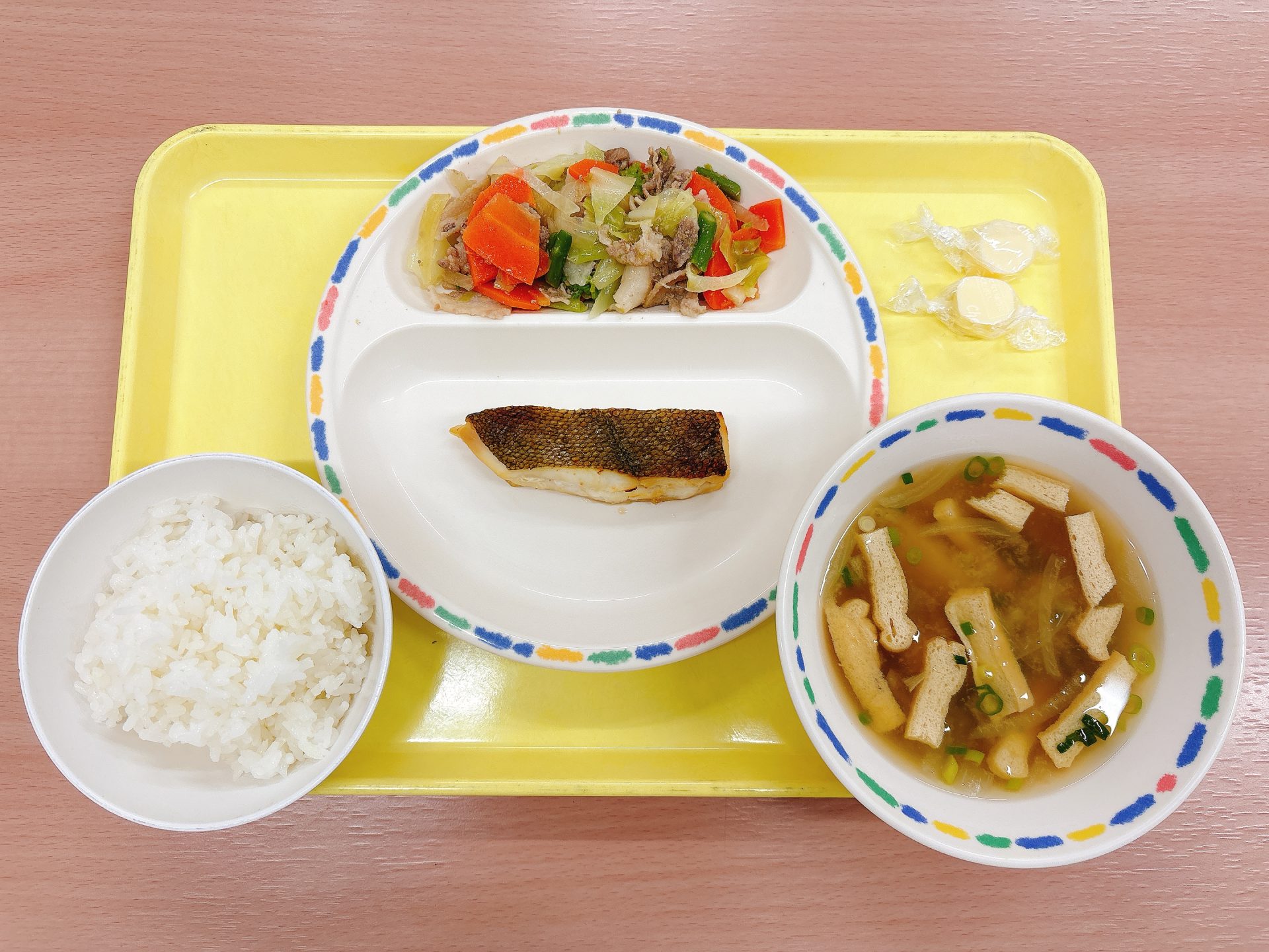 ・ご飯・かれいのしょうが焼き・さといものみそ汁・キャベツの塩だれ炒め・チーズ