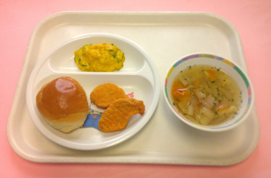 ・スフレブレッド・赤魚のトマト焼き・じゃがいものクリーム煮・アスパラベーコン・牛乳