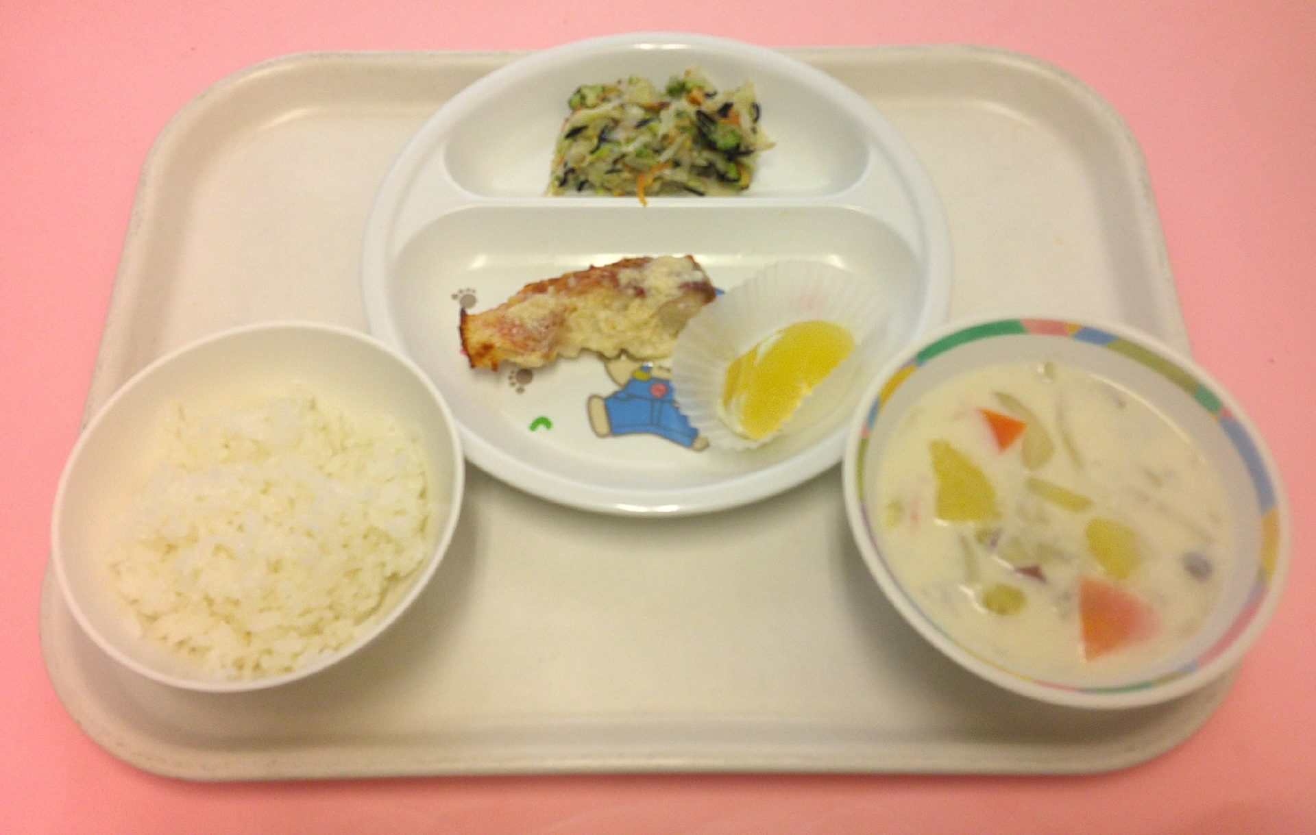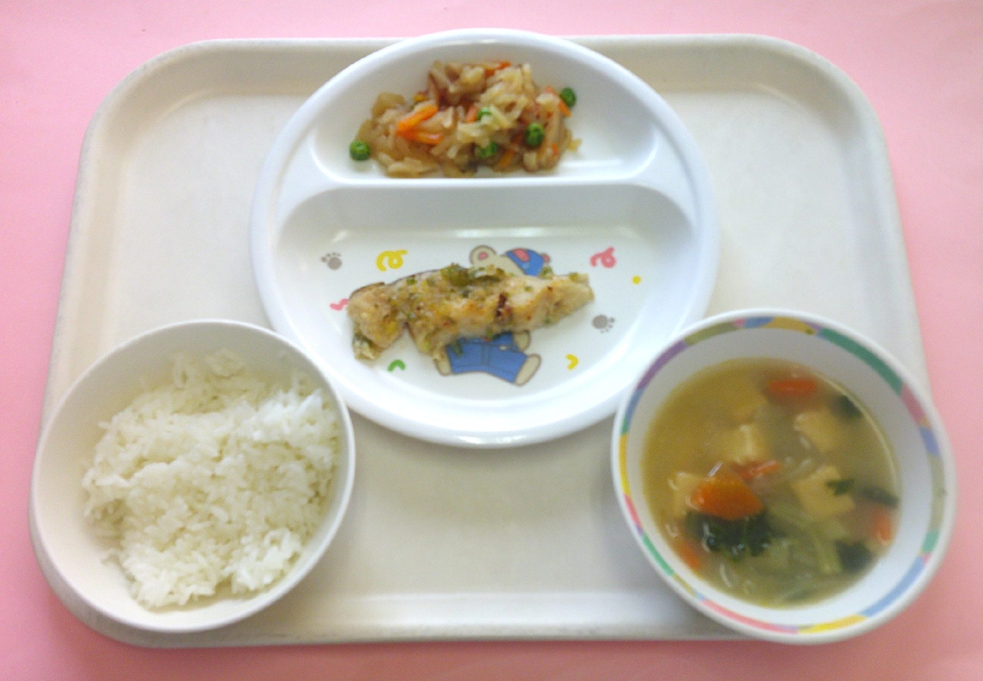 ・ご飯・チキンカツ・うどん汁・ほうれん草のもえぎ和え・おさかなふりかけ