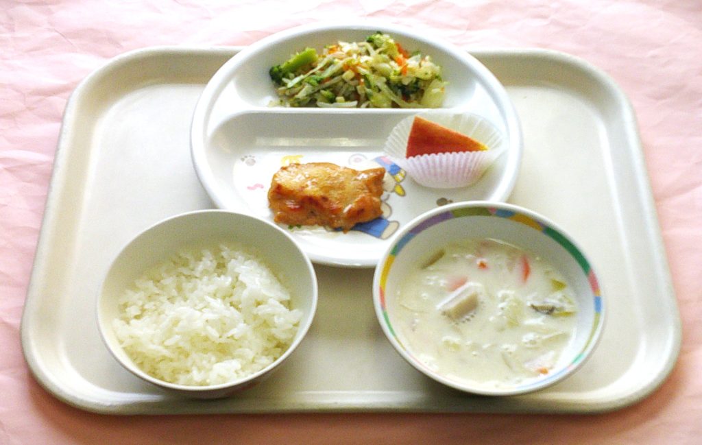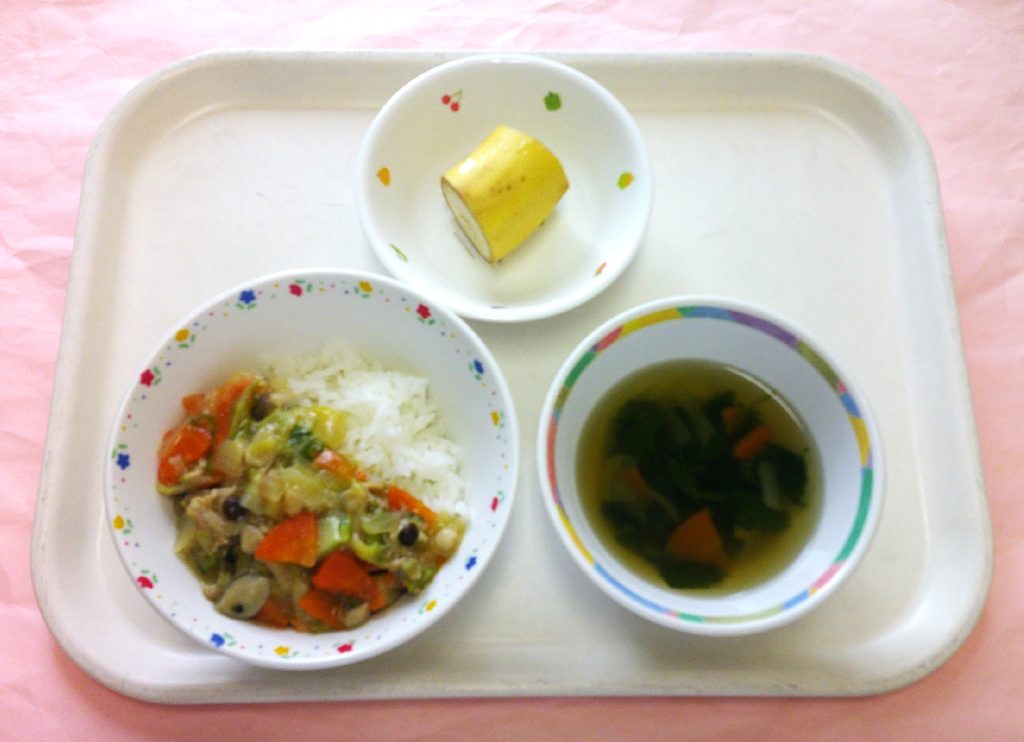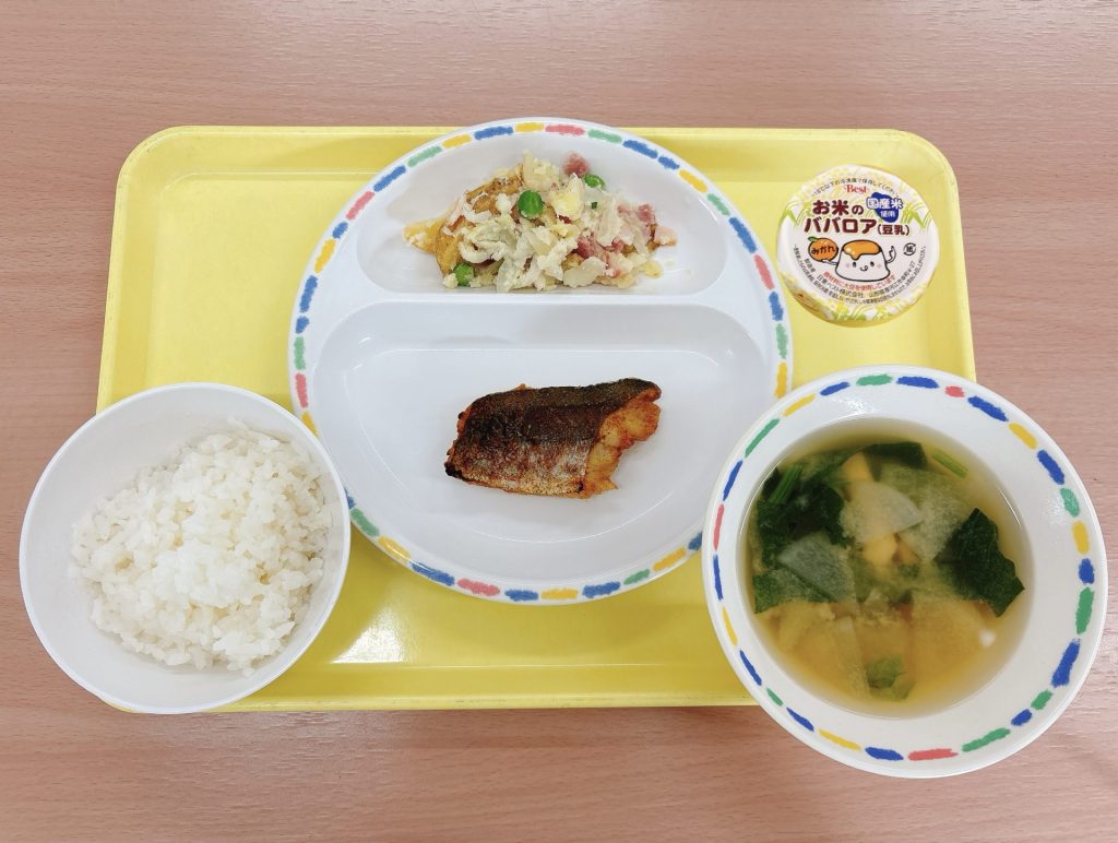 ・ご飯・たらのカレー風味焼き・大根のみそ汁・ジャーマンポテト・お米のみかんババロア(誕生会デザート)