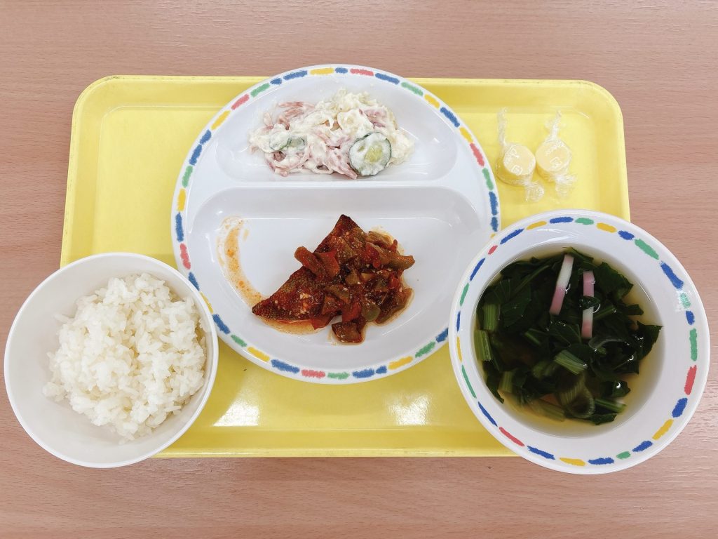 2025年10月10日 本日の給食 ・ご飯・かれいのトマト焼き・小松菜のすまし汁・ポテトサラダ・チーズ 今日の鳥取県産食材:小松菜、きゅうりトマトの日メニュー:今日はトマトの日なので、トマトソースで味付けをしたかれいです🐟🍅