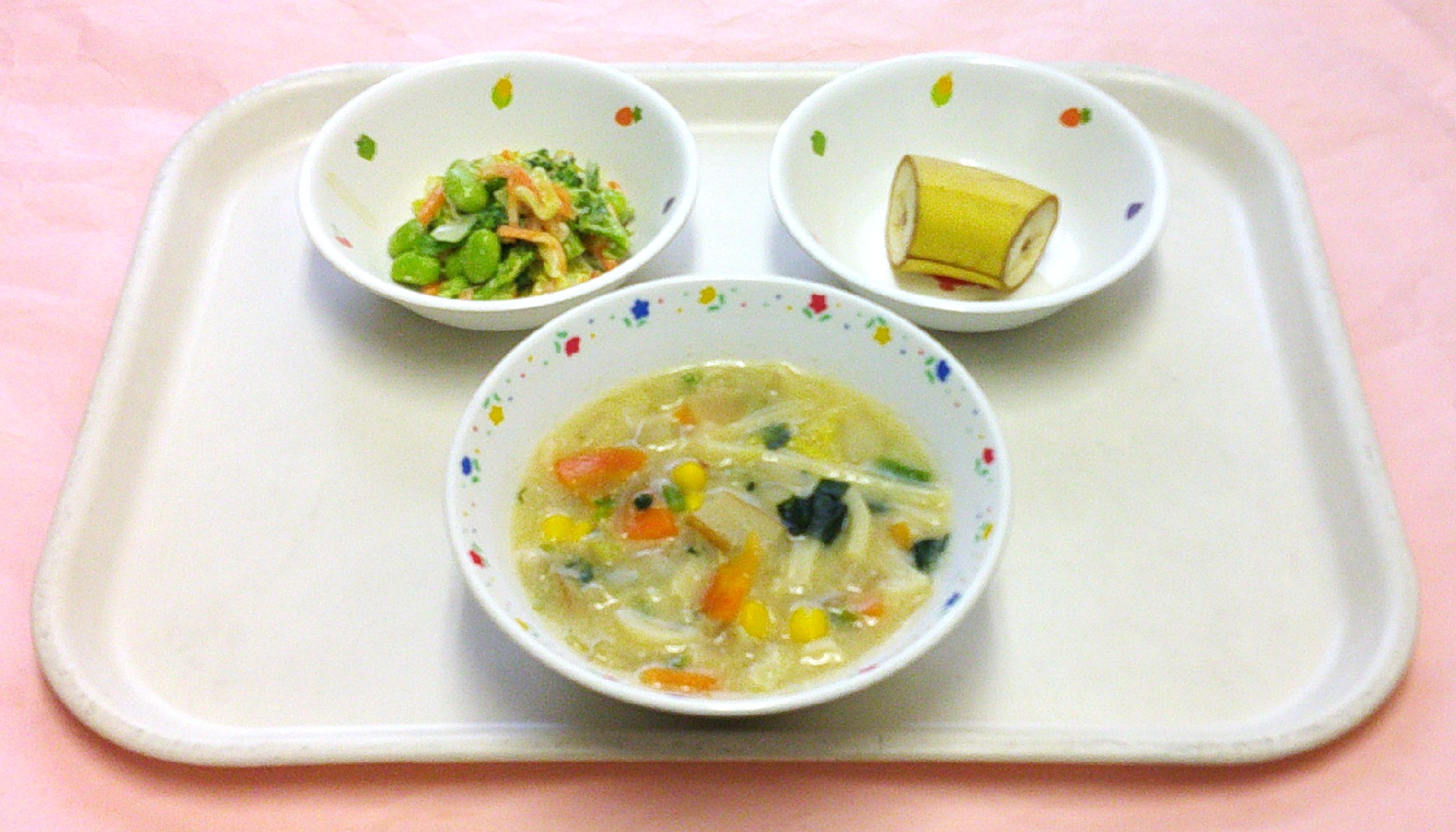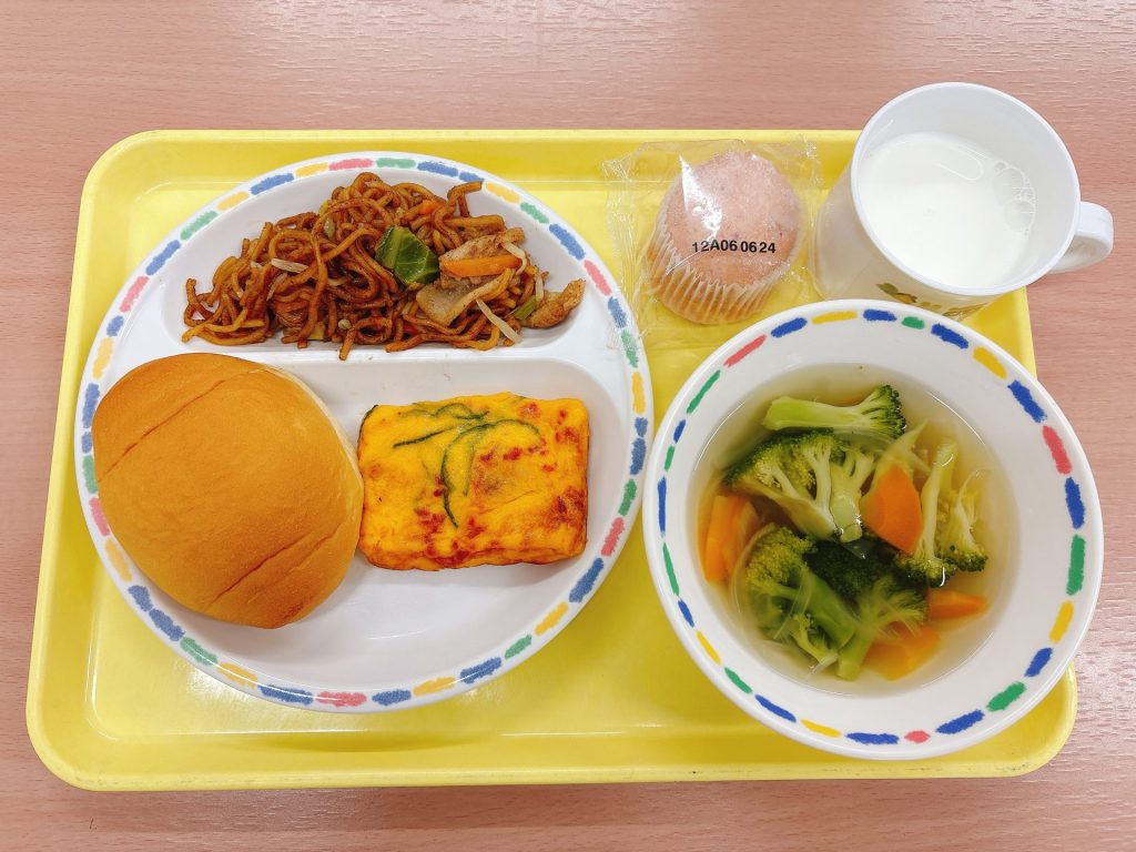 ・スフレブレッド・具入りオムレツ・ブロッコリーの洋風スープ・焼きそば・牛乳・いちご蒸しパン(誕生会デザート)