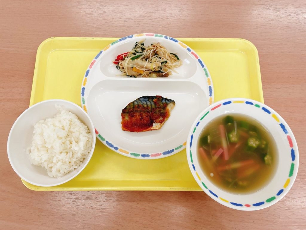 ・ご飯・さばの西京焼き・オクラのすまし汁・ビーフンの炒め物