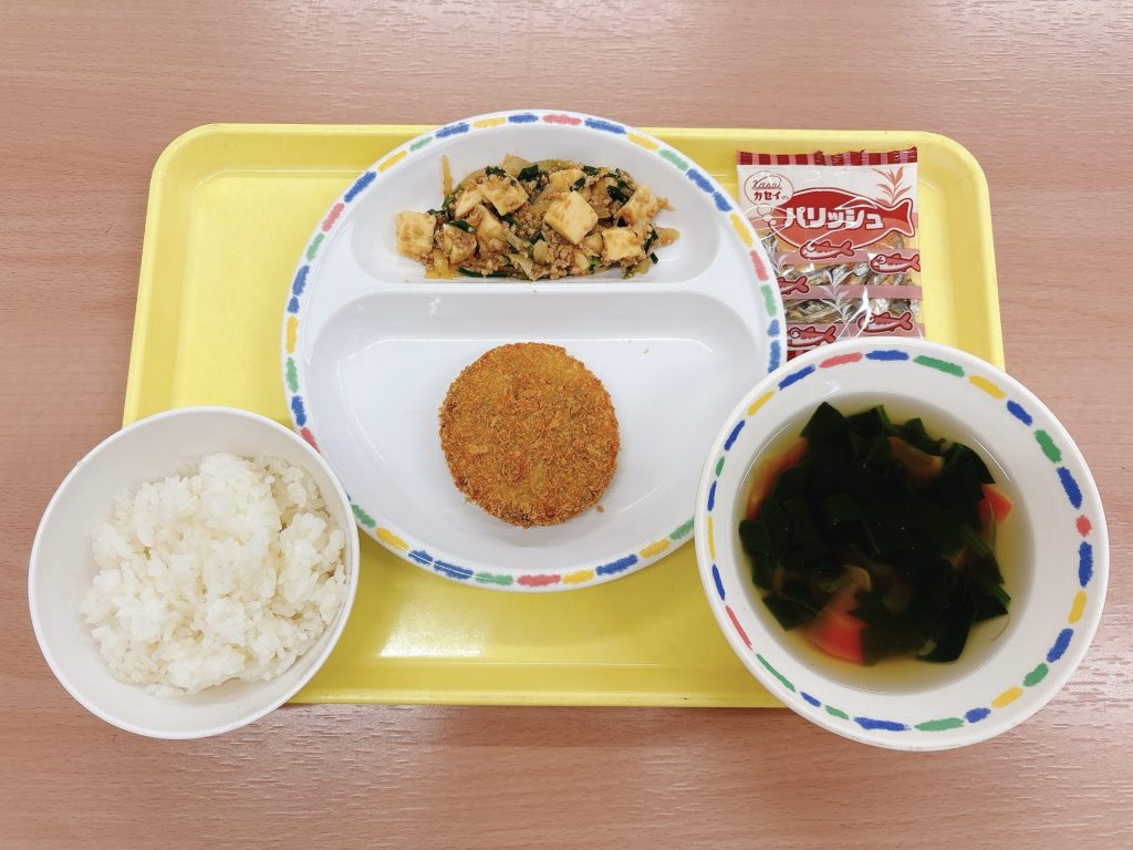 ・ご飯・カレーレバーメンチカツ・ほうれん草のスープ・マーボー豆腐・パリッシュ