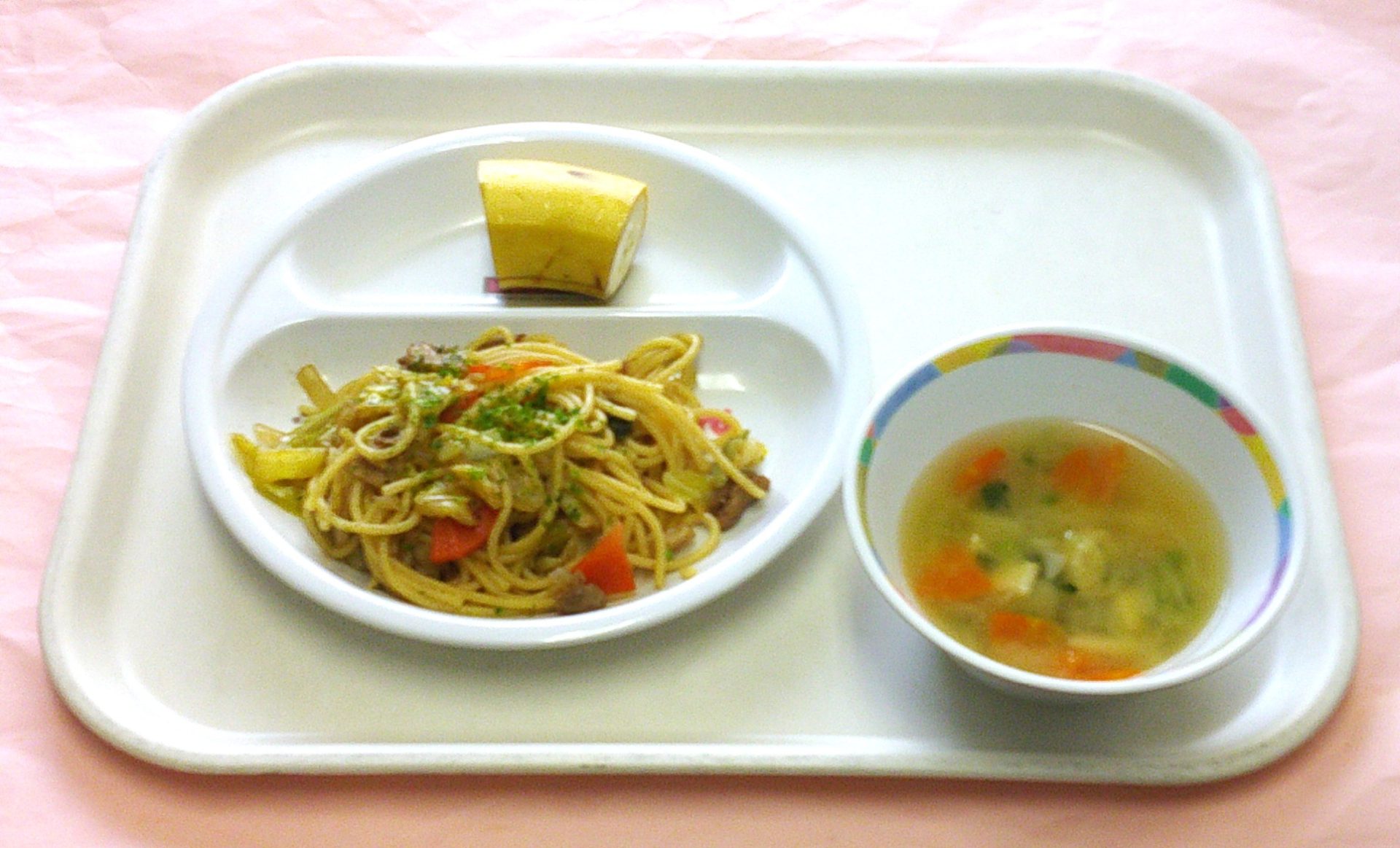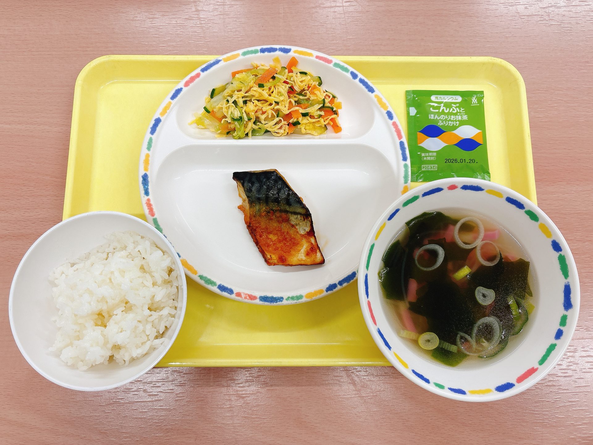 ・ご飯・さばの西京焼き・かまぼこの中華スープ・白菜のサラダ・こんぶふりかけ