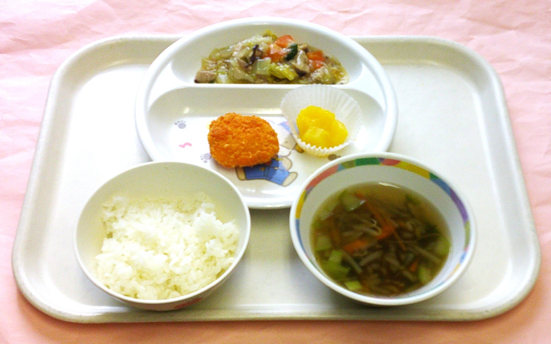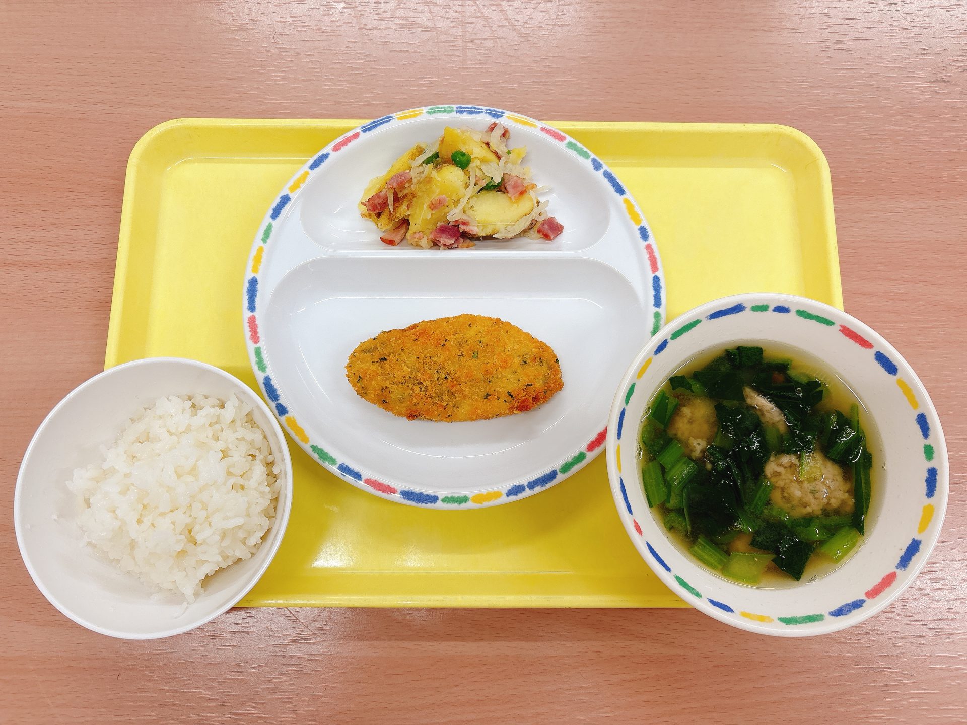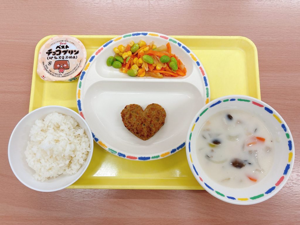 2025年02月14日 本日の給食 ・ご飯・ハートのハンバーグ・シチュー・キャロットサラダ・チョコプリン 今日の鳥取県産食材:しめじバレンタインデーメニュー:今日はバレンタインデーなので、ハートのハンバーグとチョコプリン(卵、乳、大豆不使用)がついています🍫❤️