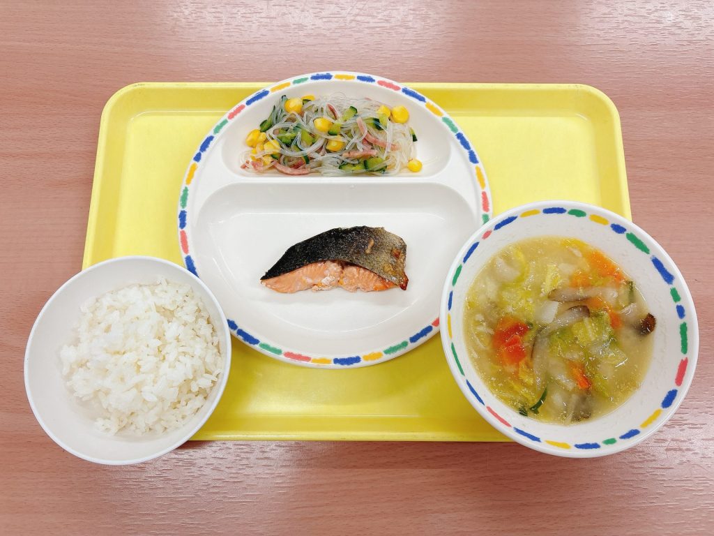 ・ご飯・鮭の塩焼き・豆乳鍋・春雨サラダ
