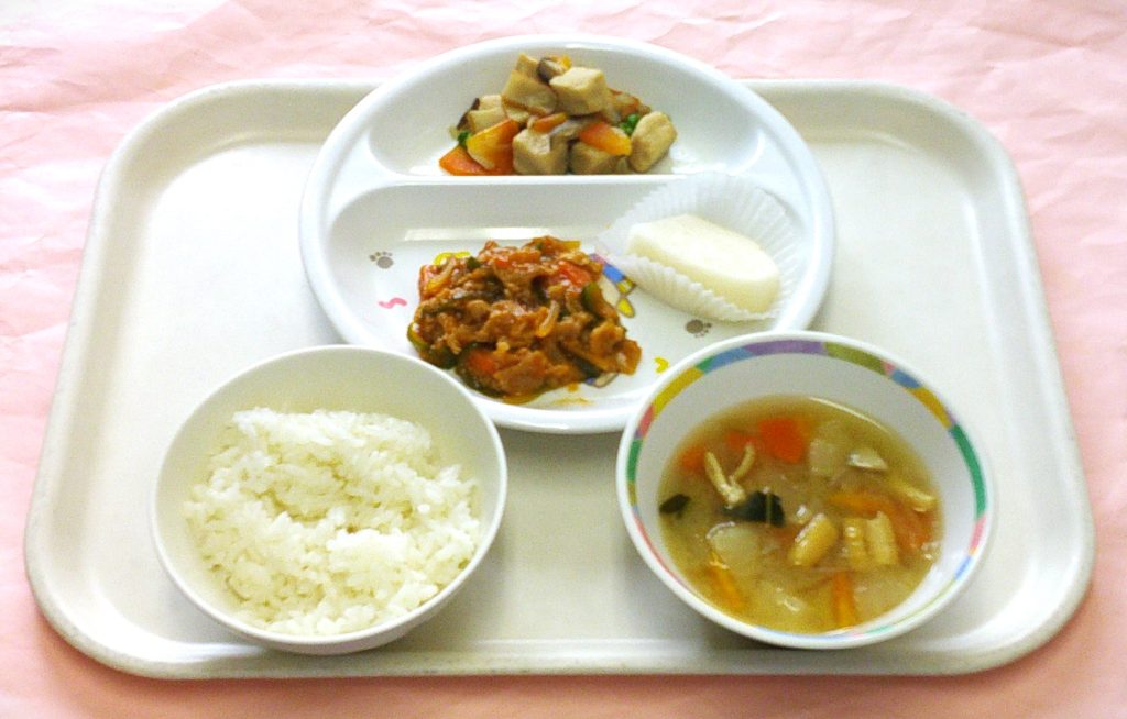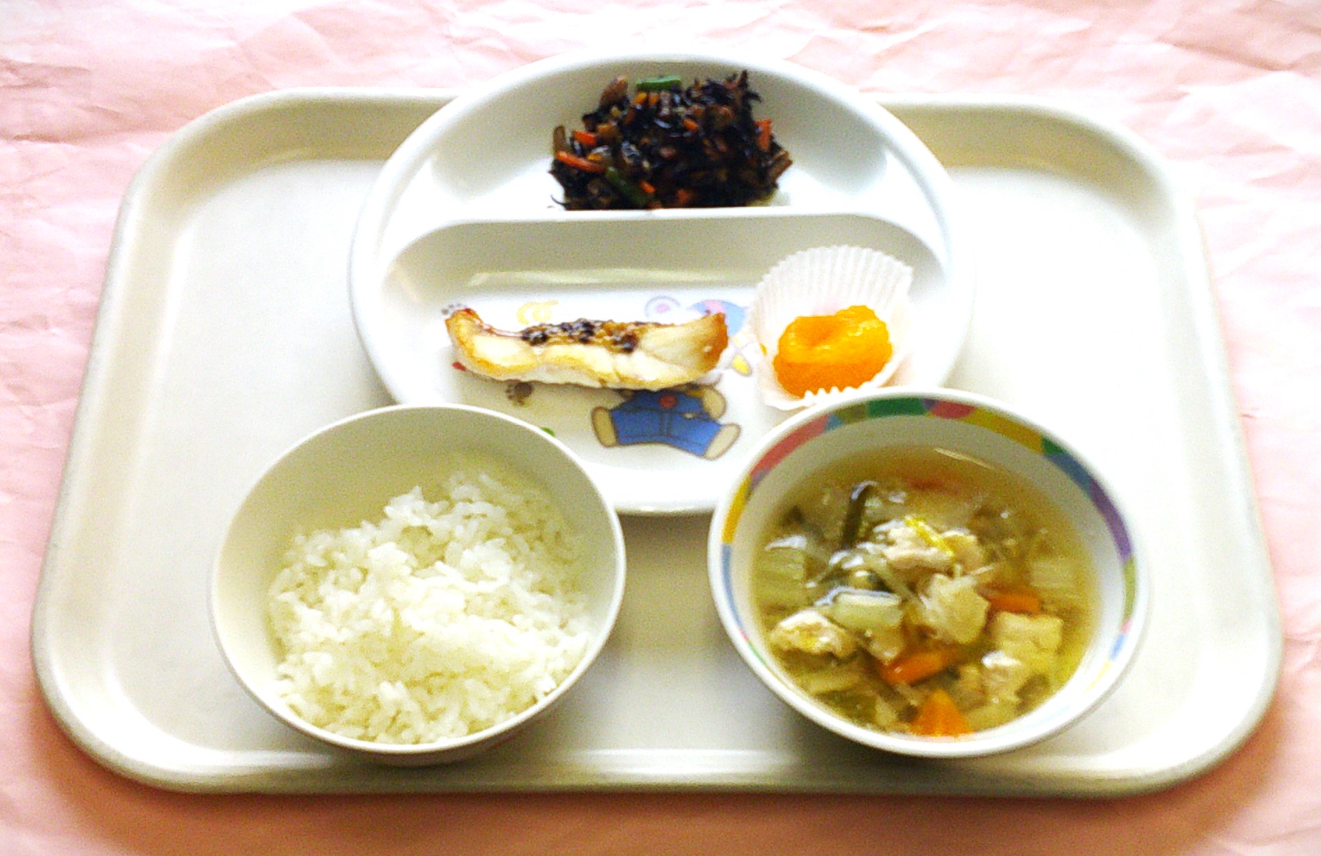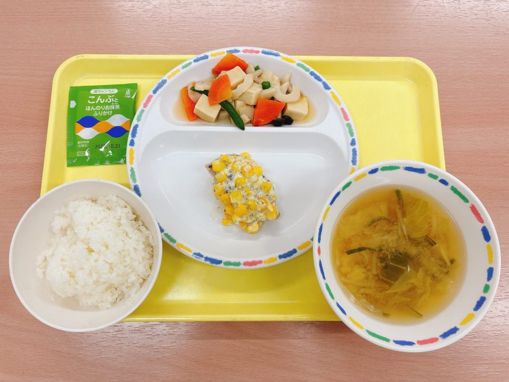 ・ご飯・たらのマヨコーン焼き・キャベツのみそ汁・高野豆腐の含め煮・こんぶふりかけ