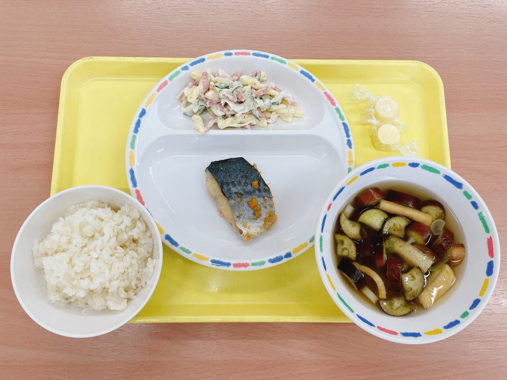 ・ご飯・さわらのしょうが焼き・なすのみそ汁・マカロニサラダ・チーズ