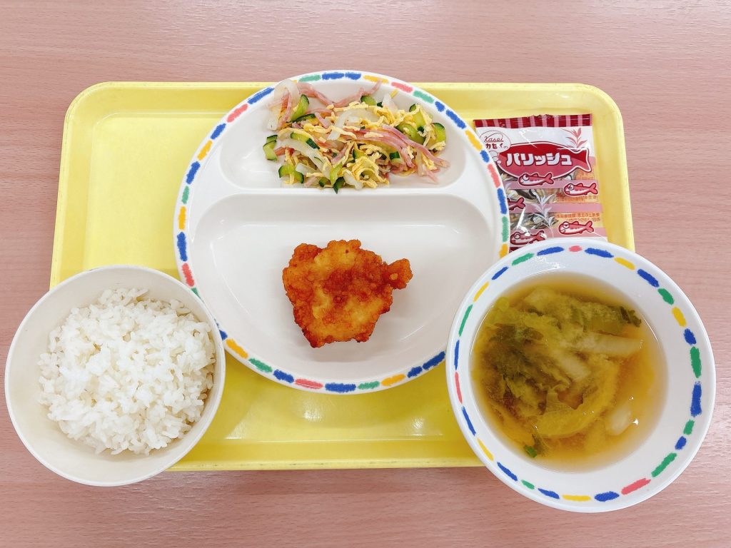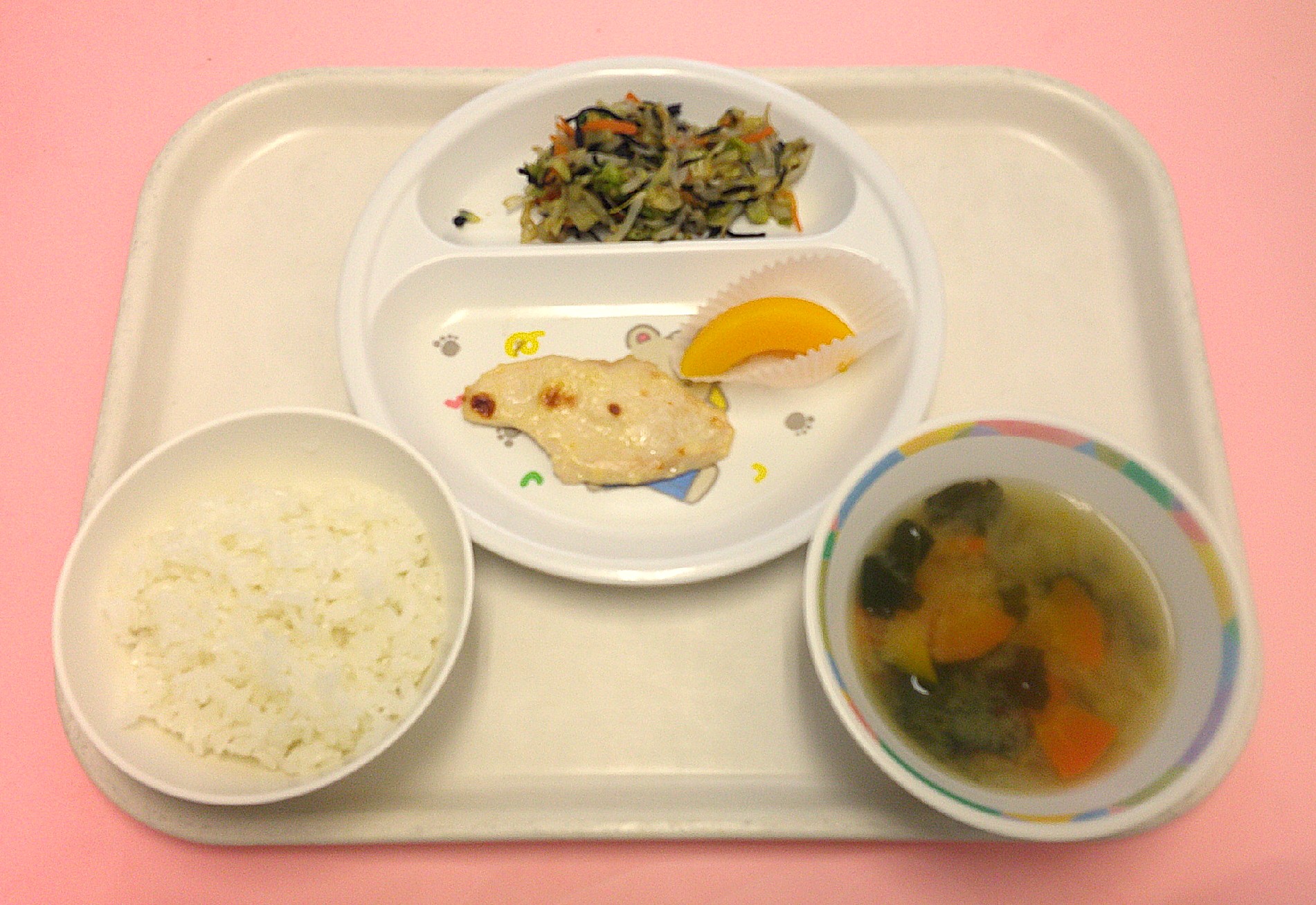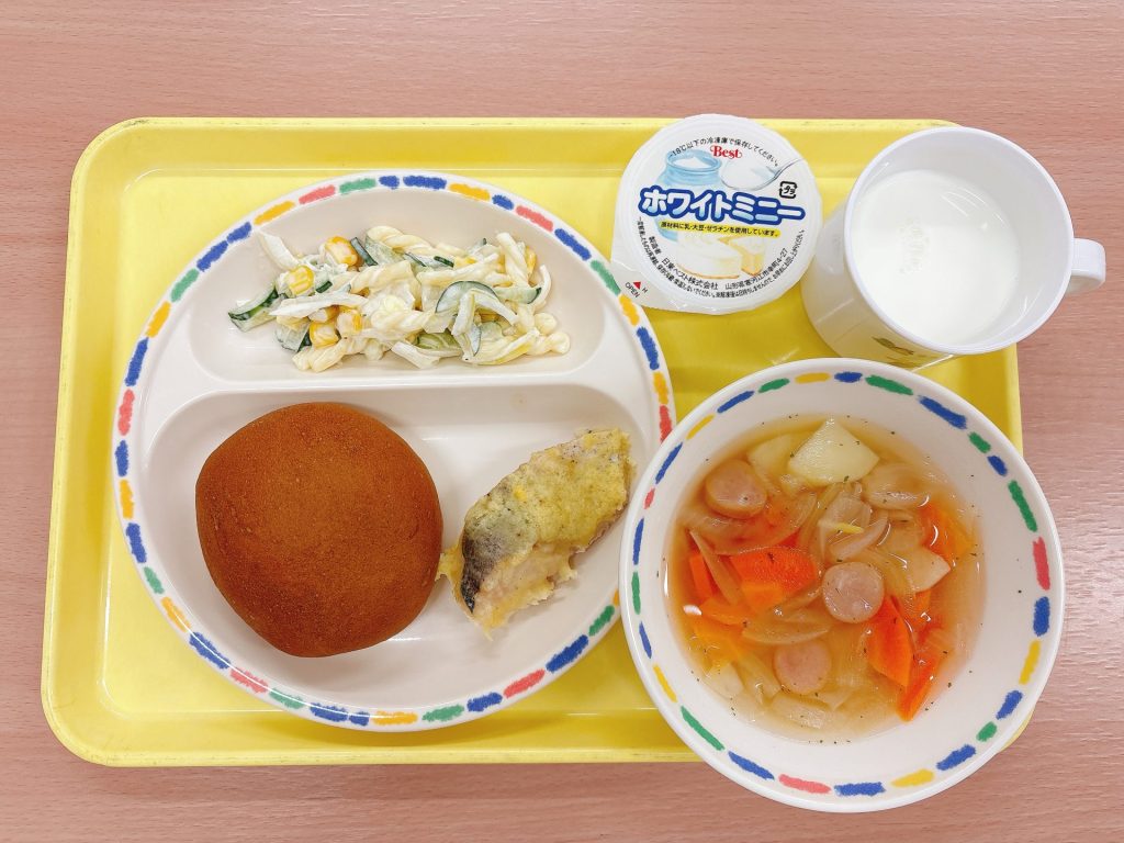 ・黒糖パン・たらのチーズ焼き・ポトフ・マカロニサラダ・牛乳・ホワトミニー(誕生会デザート)