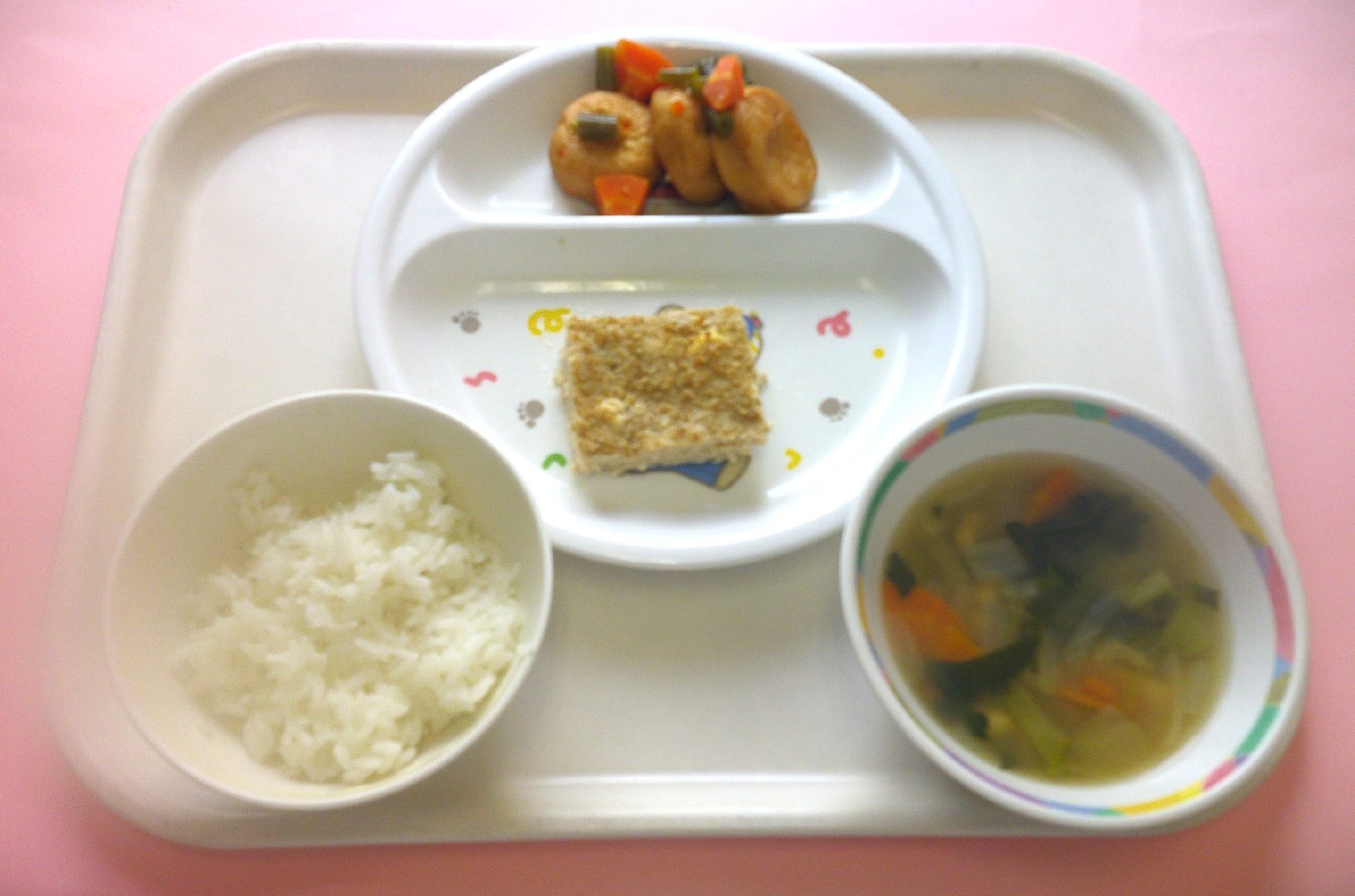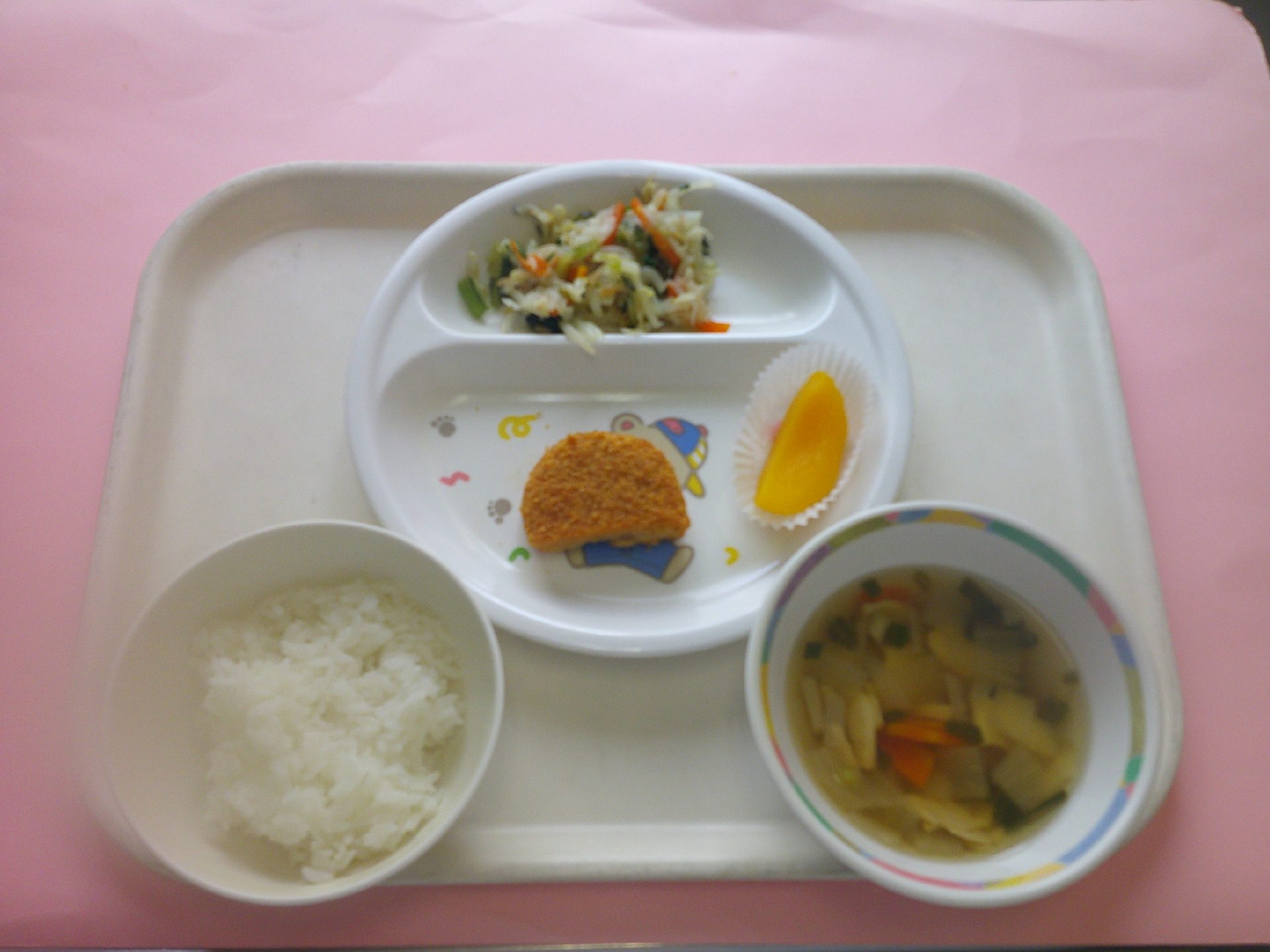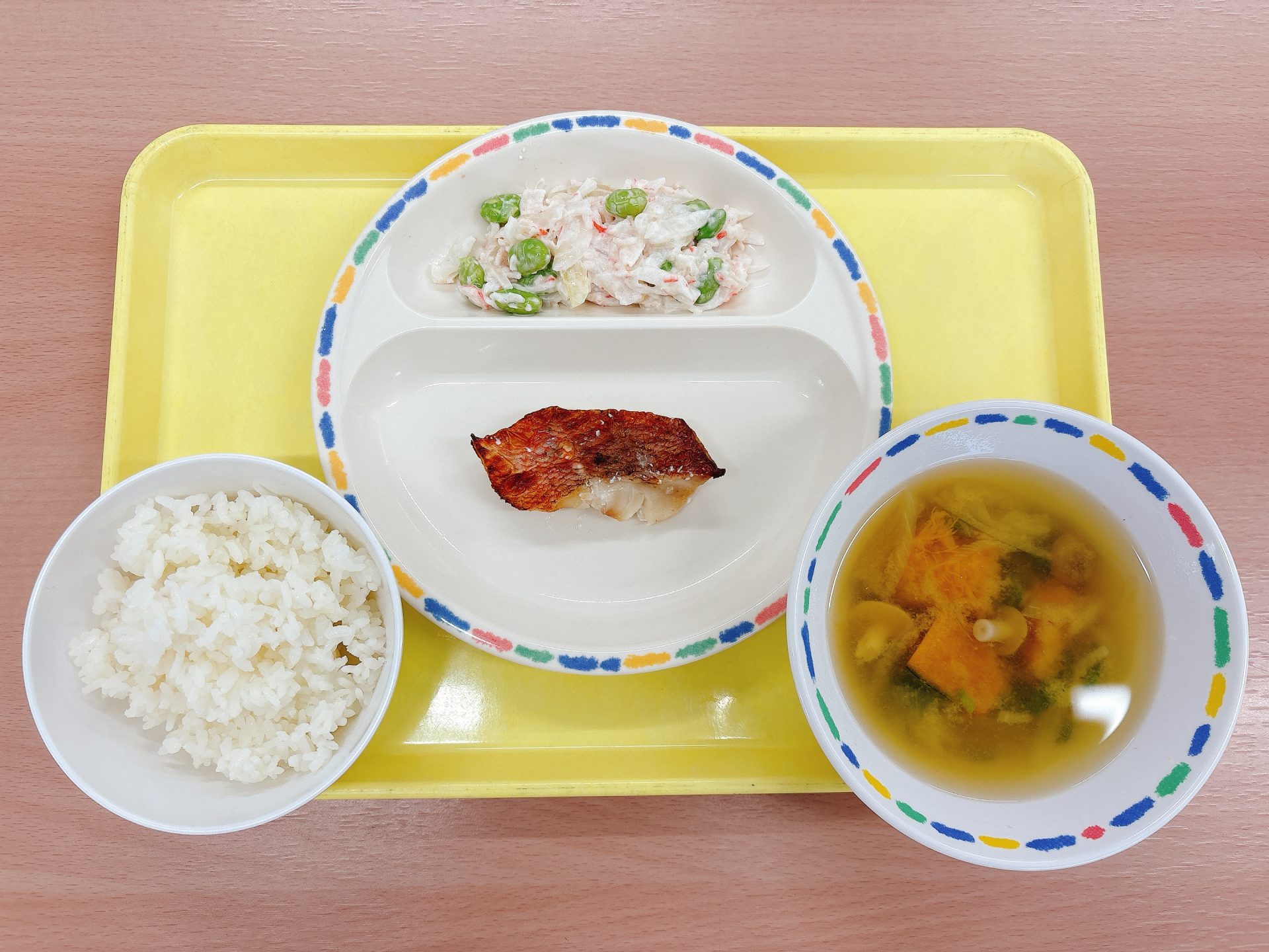 ・ご飯・赤魚のソテー・かぼちゃのみそ汁・かにかまサラダ