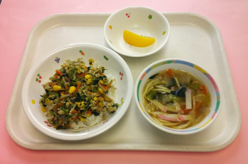 ・黒糖パン・えびカツ・肉団子のスープ・スイートポテトサラダ・牛乳