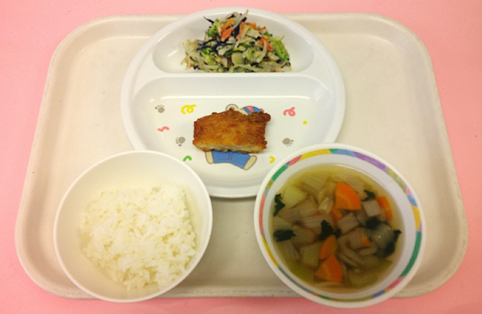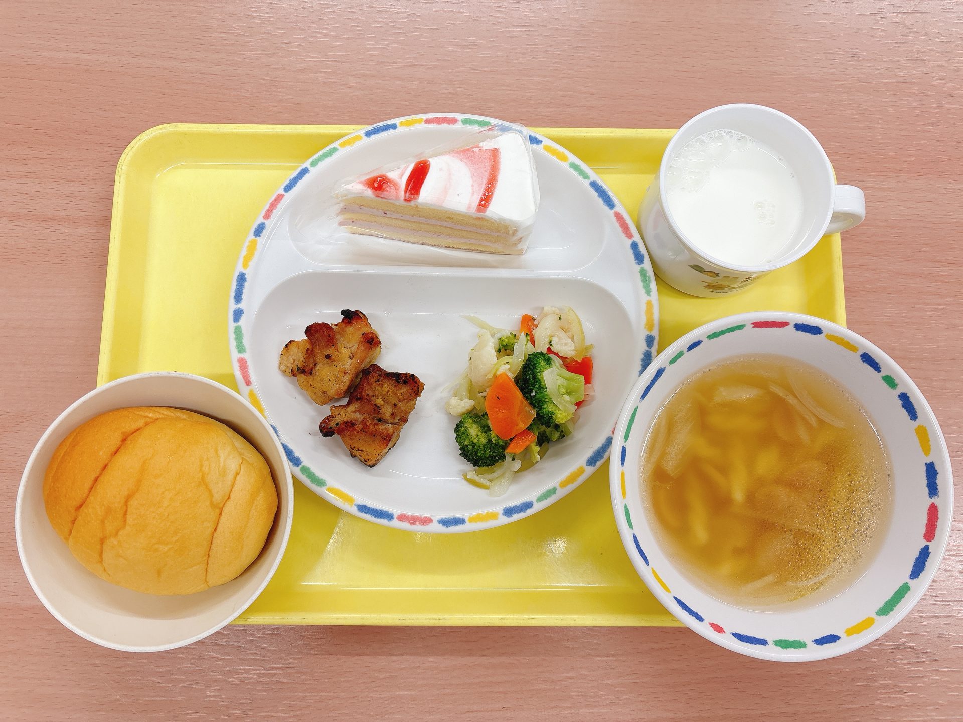 2025年12月24日 本日の給食 ・スフレブレッド・鶏肉の照り焼き・マカロニスープ・もみの木サラダ・牛乳・いちごケーキ 今日の鳥取県産食材:にんじんクリスマスメニュー:今日はクリスマスイブなので、ツリーに見立てたブロッコリーのサラダと、いちごケーキです🎄🍓🎅🏻