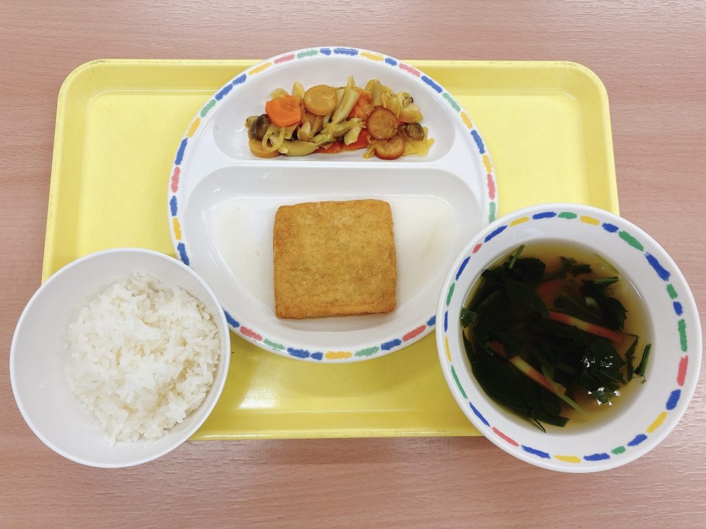 ・ご飯・肉詰めいなり・ほうれん草のすまし汁・きのこのカレー炒め