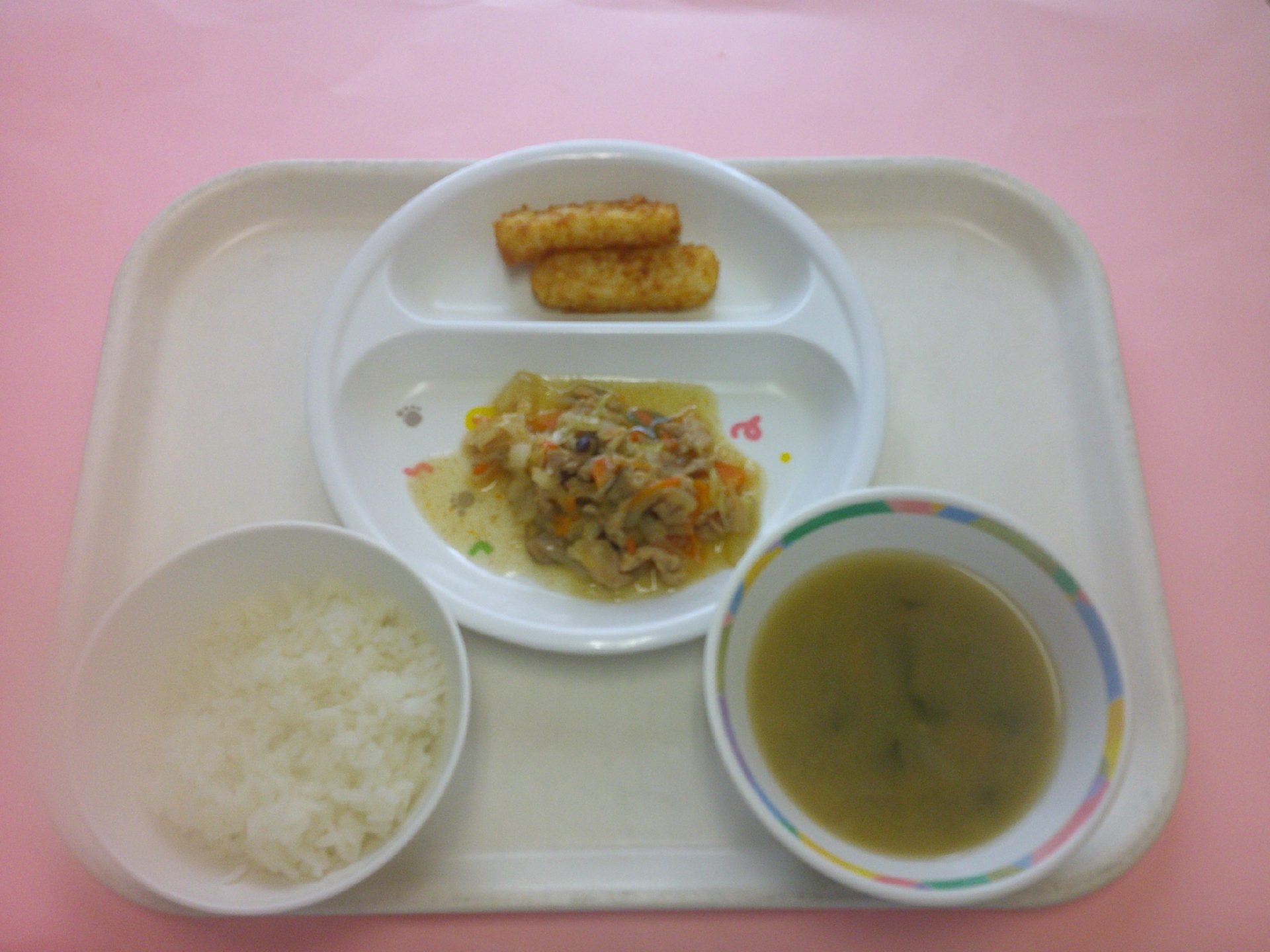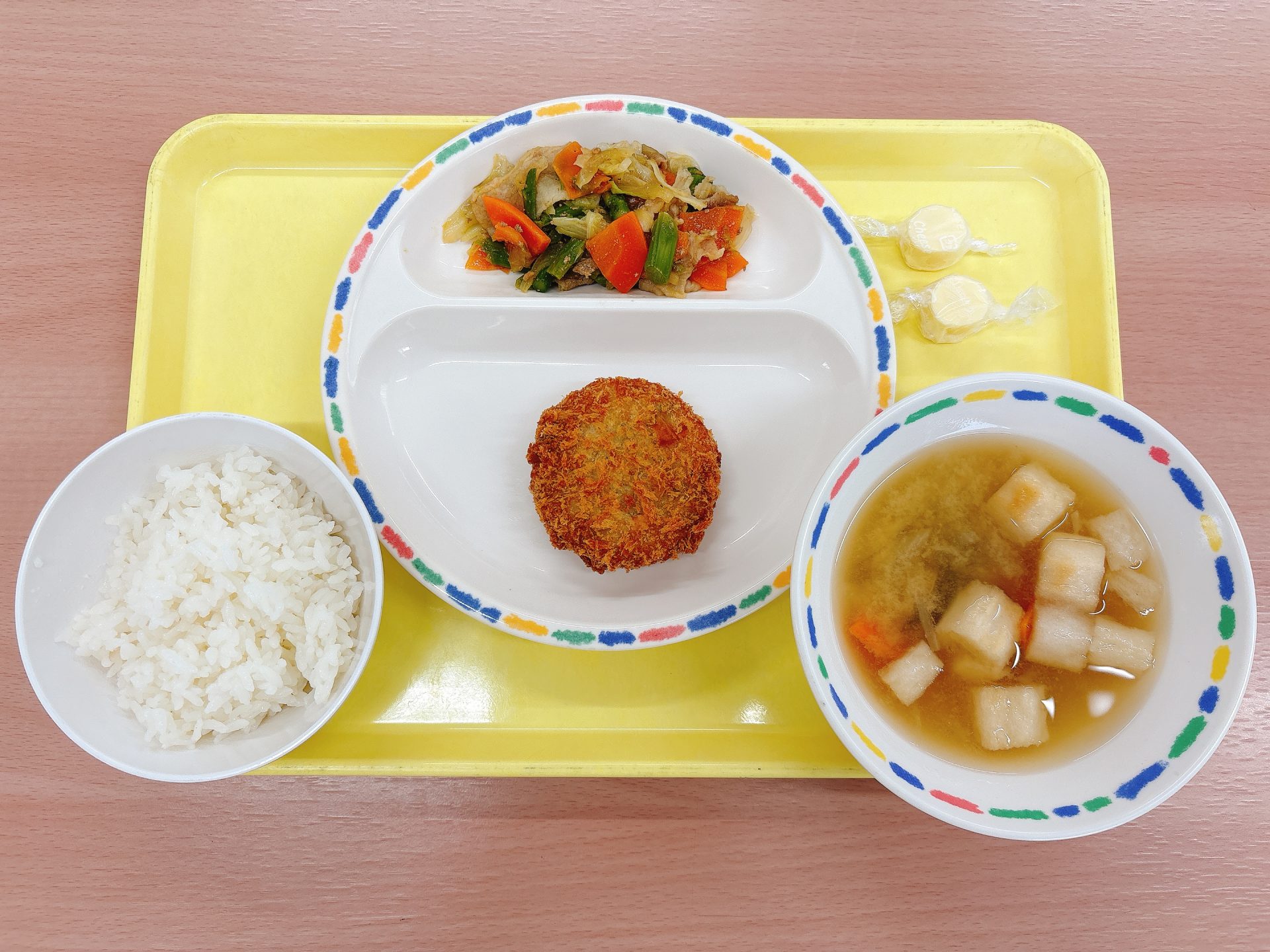 ・ご飯・かぼちゃコロッケ・おふのみそ汁・焼肉風炒め・チーズ