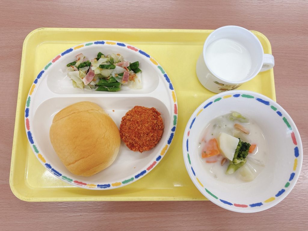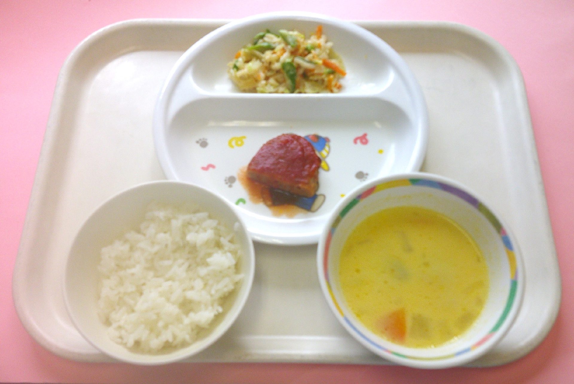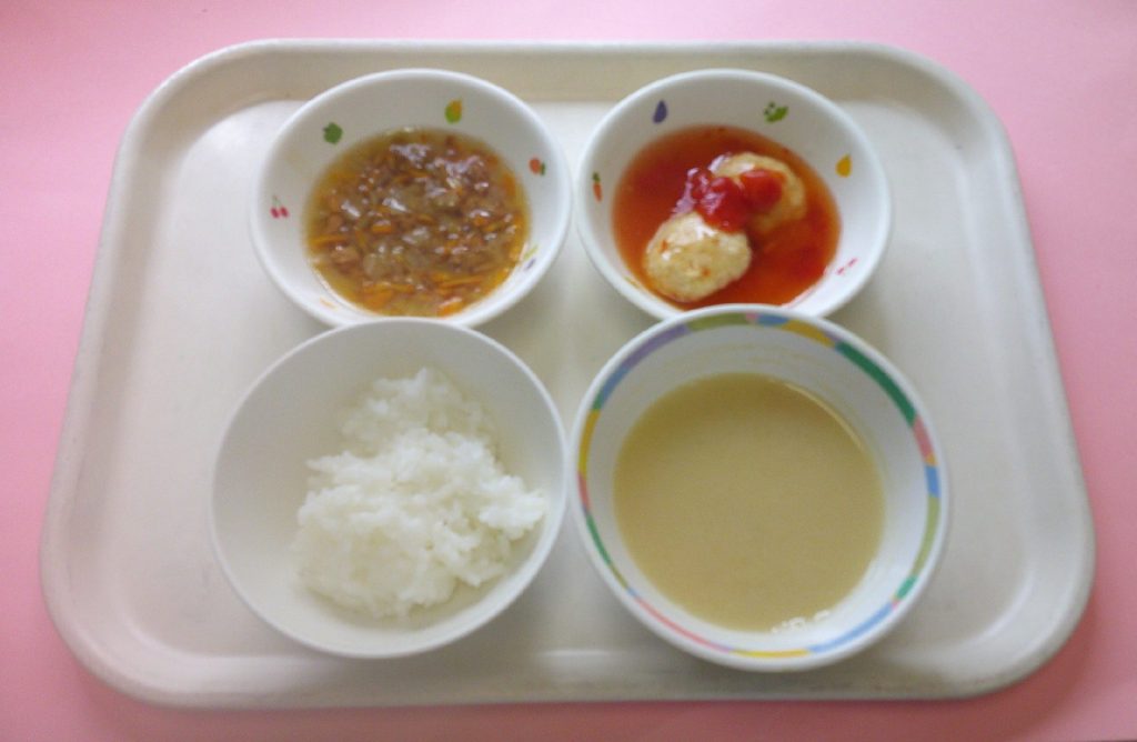 2025年09月24日 乳児部今日の給食 ごはん パンプキンポタージュ 煮込みハンバーグ かみかみサラダ 離乳食(写真下) ごはん(軟飯) かぼちゃの豆乳みそ汁 手づくりつくねトマト煮 キャベツの煮びたし