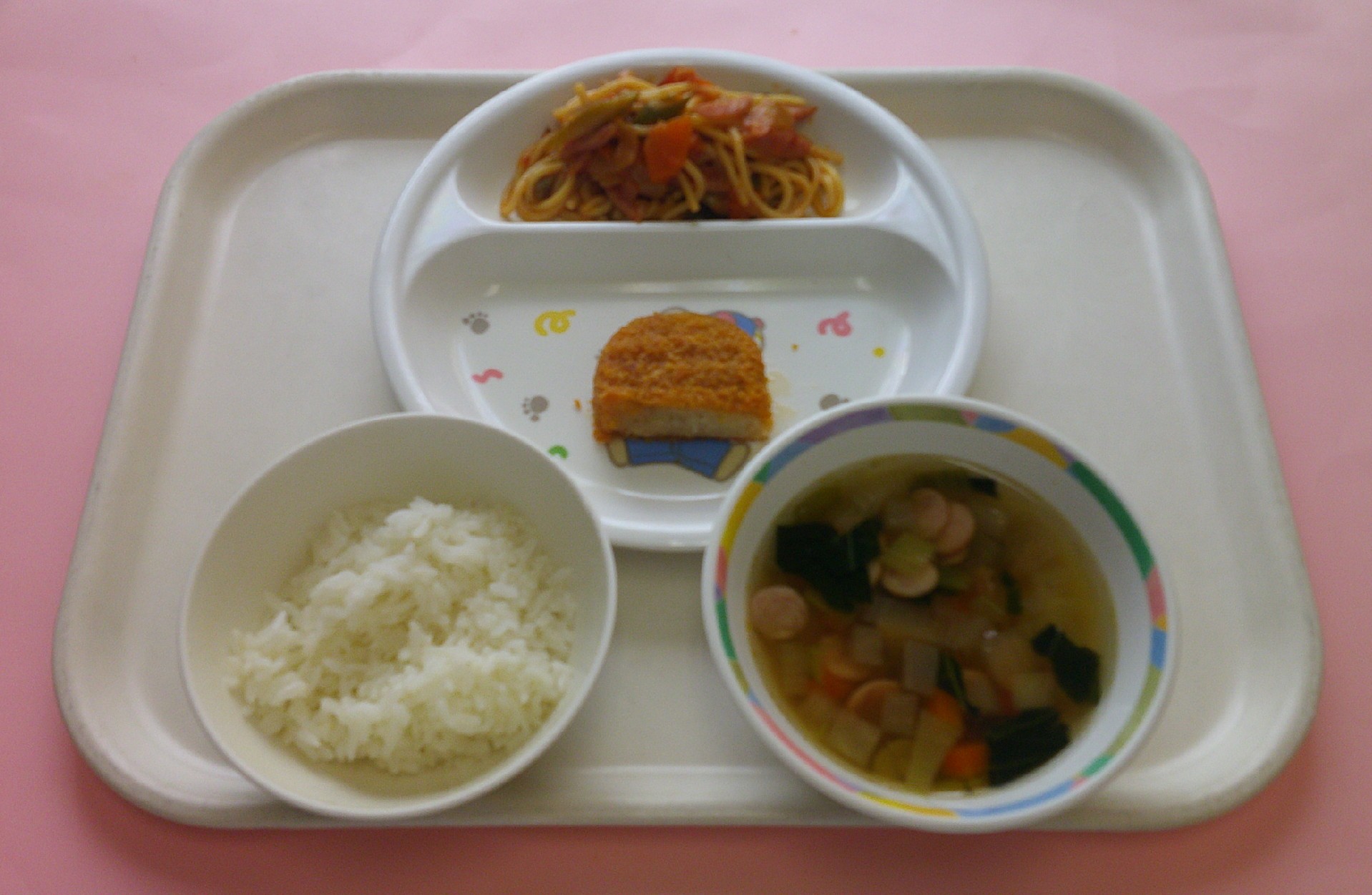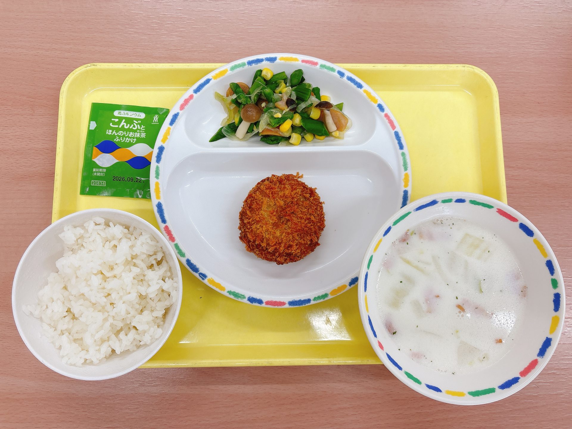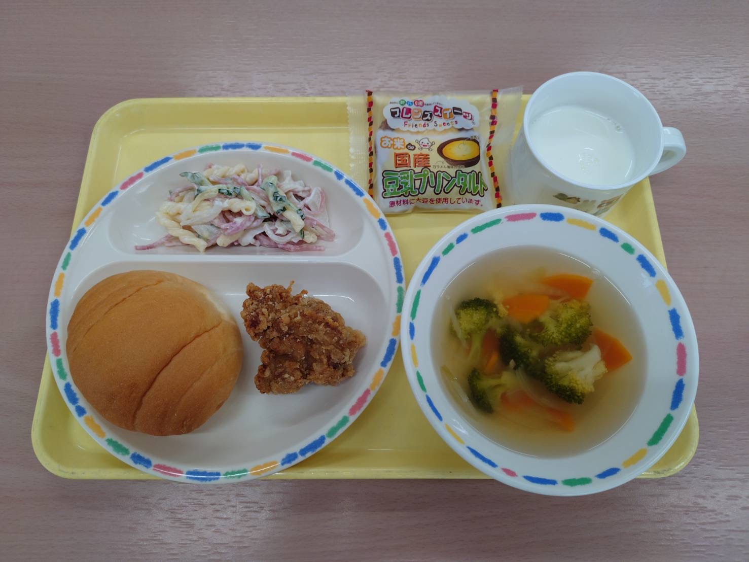 2025年11月12日 本日の給食 ・スフレブレッド・からあげ・ブロッコリーのスープ・マカロニサラダ・牛乳・お米の豆乳プリンタルト 2園リクエストメニュー:今日は2園さんリクエストのからあげ、ブロッコリーのスープ、マカロニサラダ、プリンタルトです🍮