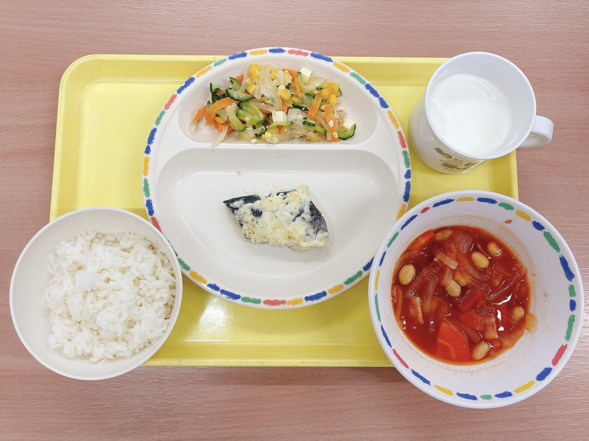 ・ご飯・さわらのマヨネーズ焼き・大豆のトマト煮・コーンサラダ・牛乳