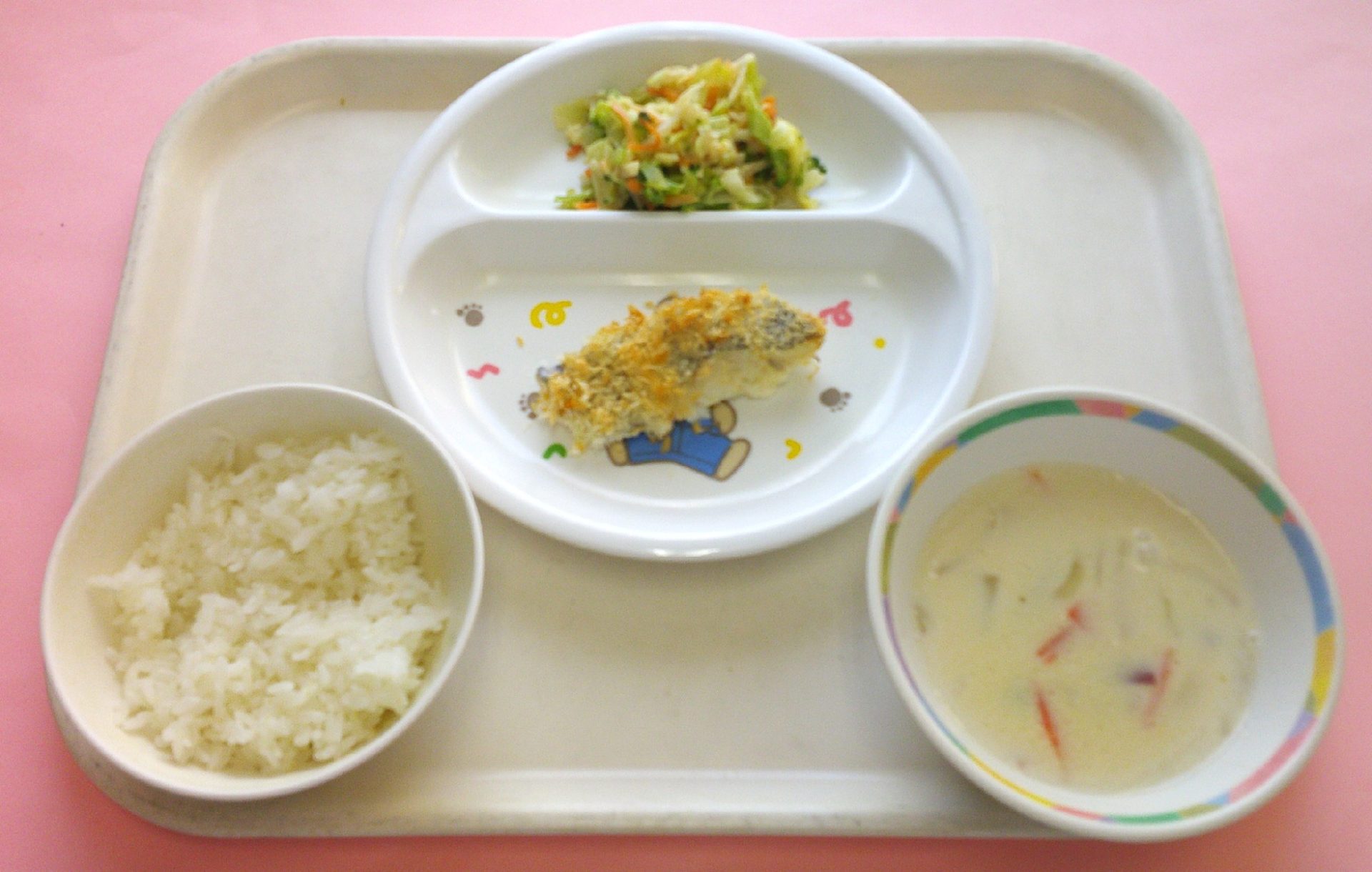 ・スフレブレッド・かれいのトマト焼き・マカロニの洋風煮・ジャーマンポテト・牛乳