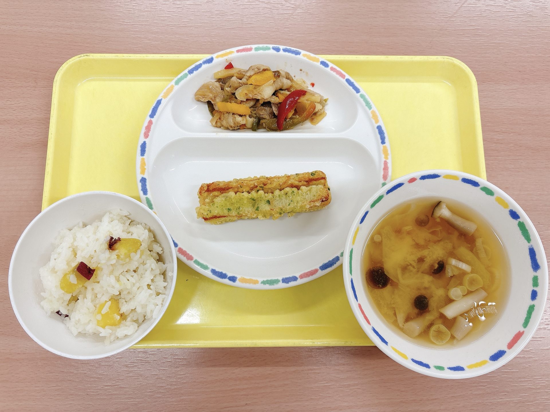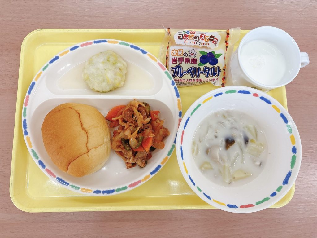 2025年10月29日 本日の給食 ・スフレブレッド・まんまるキャベツ包み・きのこのクリーム煮・ポークチャップ・牛乳・お米のブルーベリータルト(誕生会デザート) 今日の鳥取県産食材:エリンギ、しめじ、豚肉