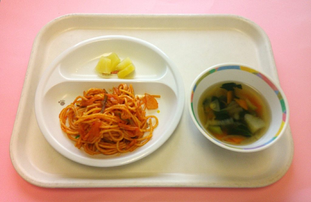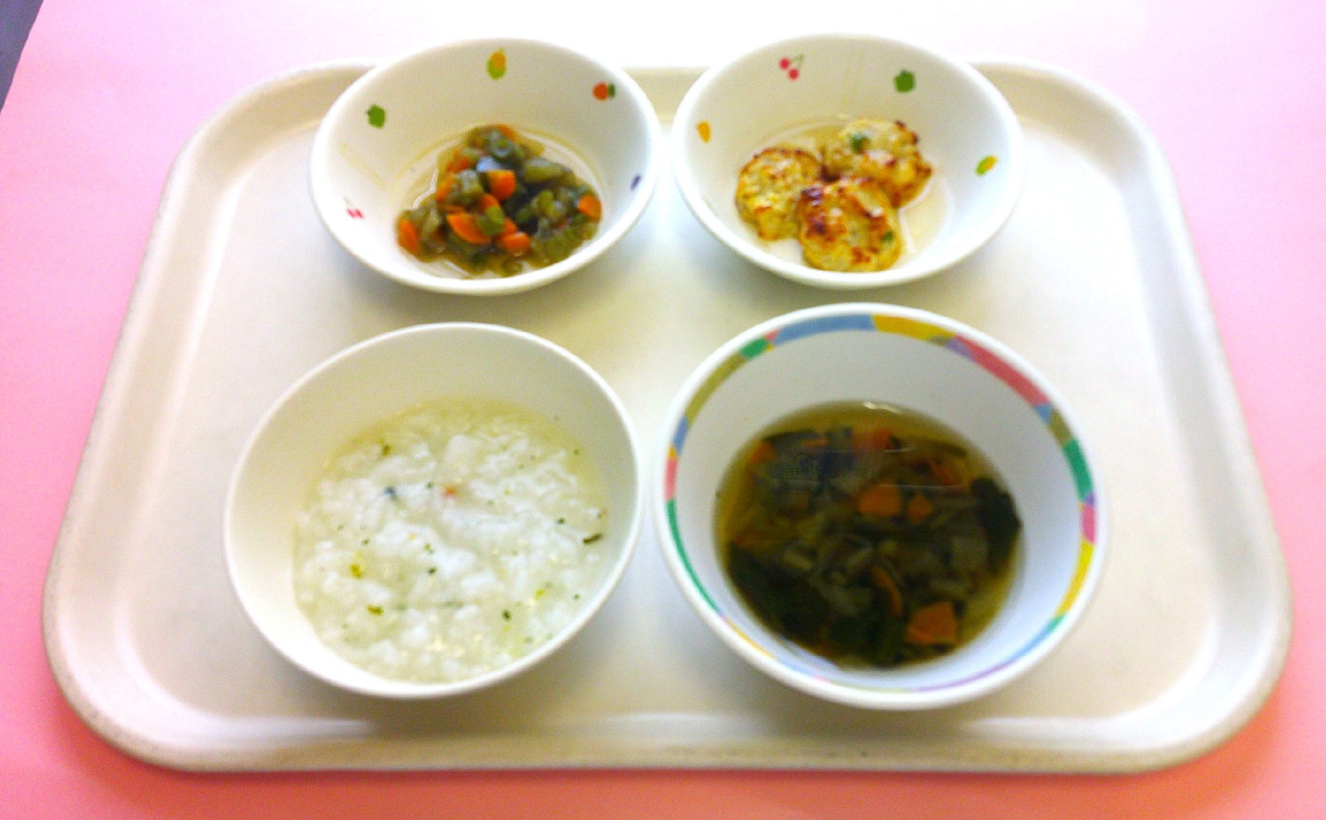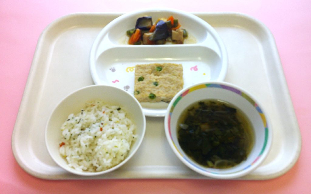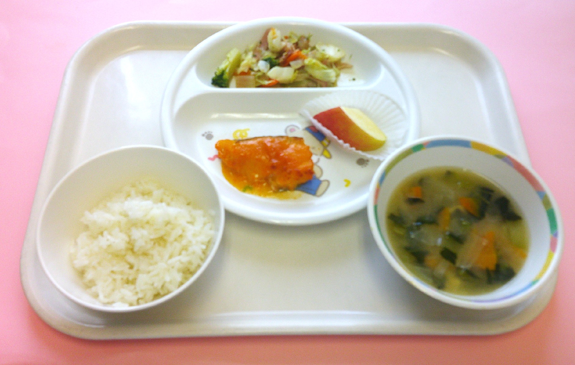 2025年08月19日 乳児部今日の給食 ごはん とうふのみそ汁 白身魚のドレッシング焼き ブロッコリーのコンソメ炒め りんご 離乳食(写真下) 7分がゆ とうふのだし汁 白身魚のトマト煮 ブロッコリーのしらす煮 りんご