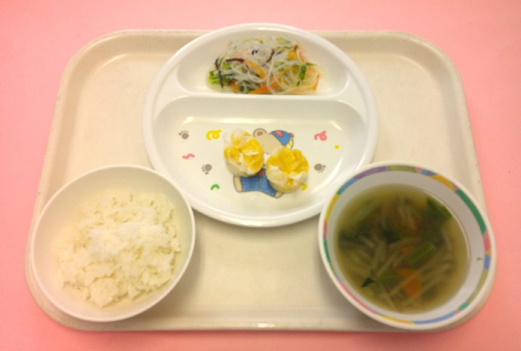 ・ご飯・鮭メンチカツ・おでん風煮・きゅうりの酢の物・おさかなふりかけ
