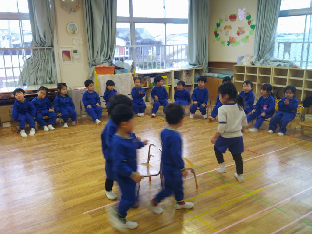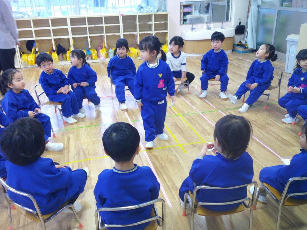 最終日はみんなで遊びたい!と子どもたちから声が上がったので、フルーツバスケットや貨物列車、椅子取りゲームなど、みんなで遊べる活動を楽しみました。真ん中に立って発言したり、友達を応援したり、じゃんけんをして列車になったりと、友達との交流を楽しむ姿が見られました(*^^*)