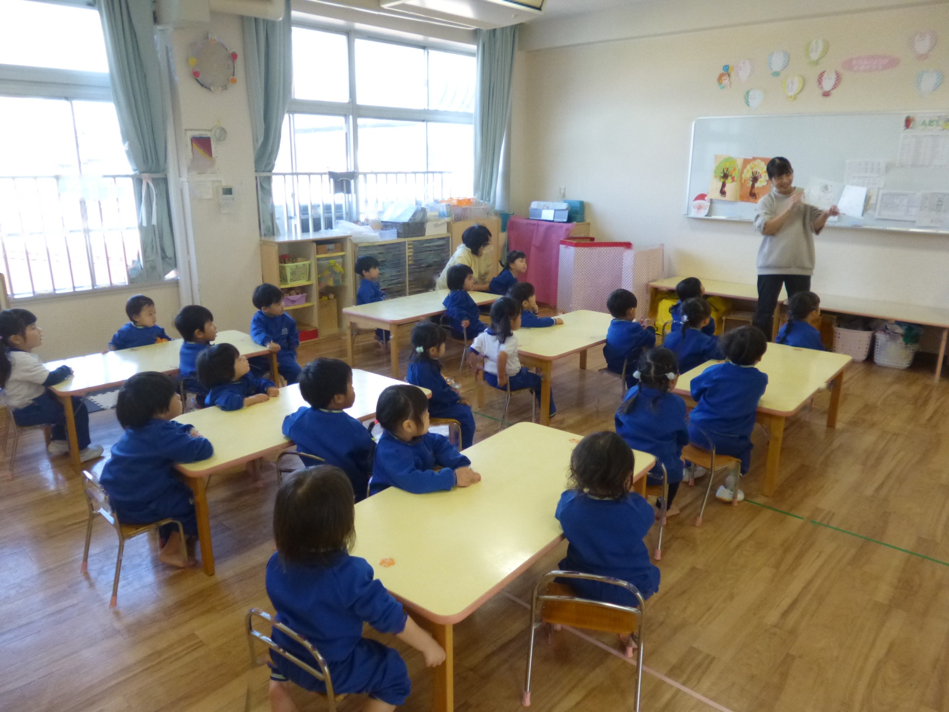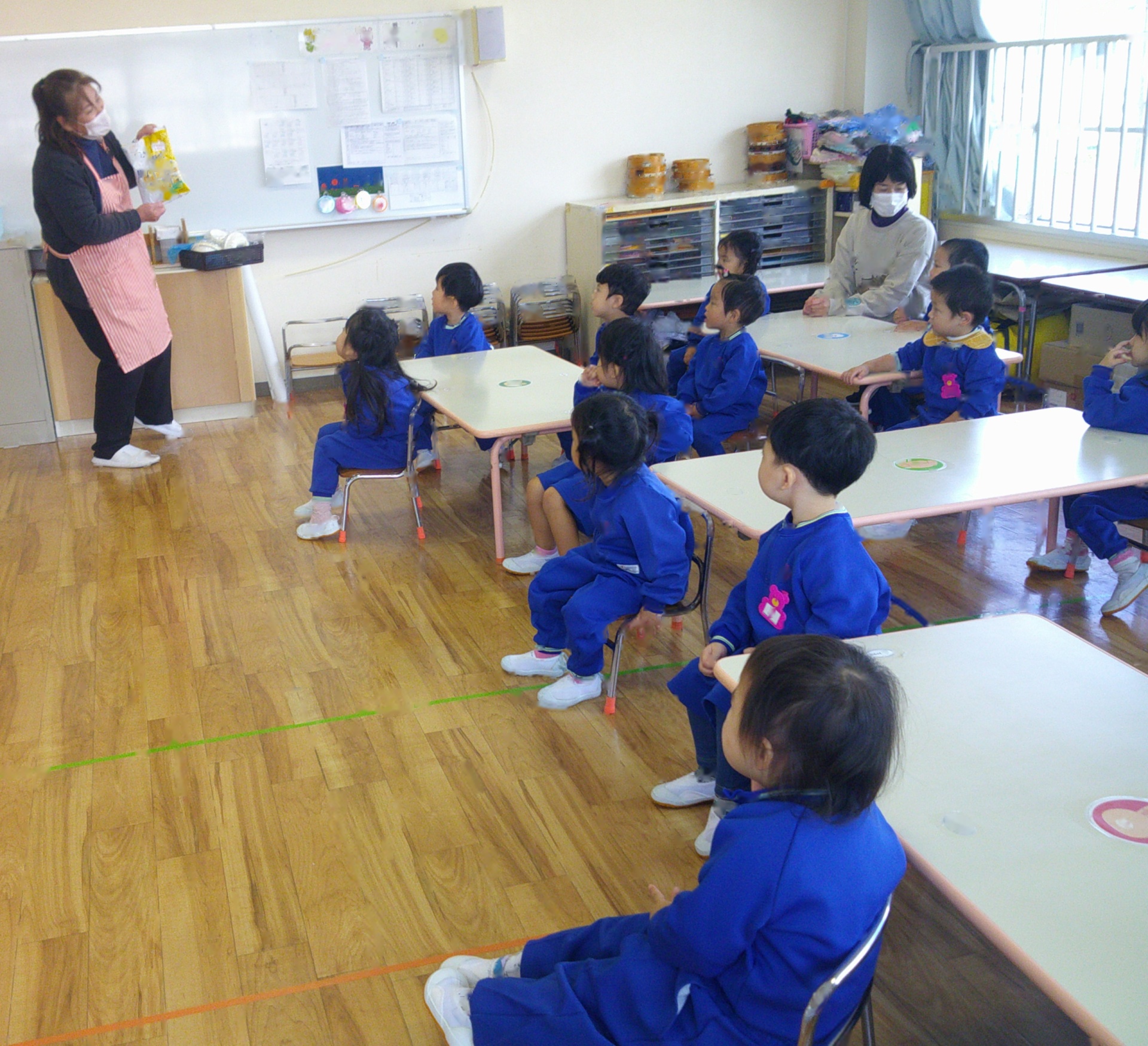 2025年11月22日 食育指導 先日「噛むことの大切さを知ろう」をテーマに食育指導を受けました。絵本「かむにんじゃ」を読んで、スタート。給食室の先生から、おせんべいや小魚をもらってみんなで実際に噛むことを練習しました。しっかり噛むことでいろいろな味が分かります。そして元気になれる!すてきなお話を聞きました。
