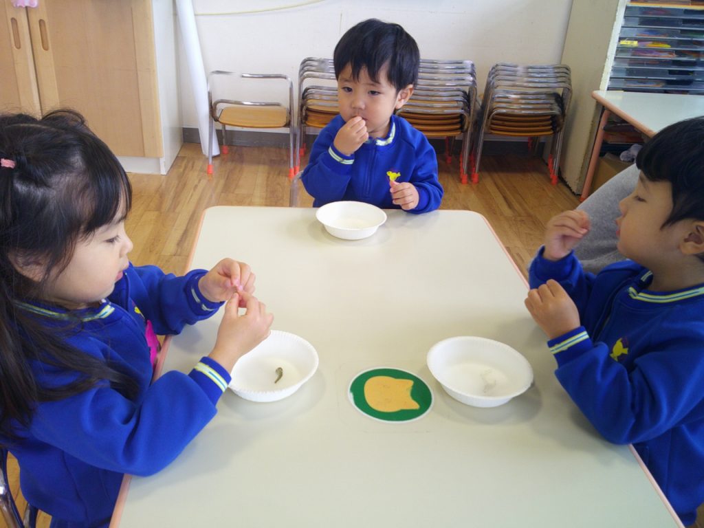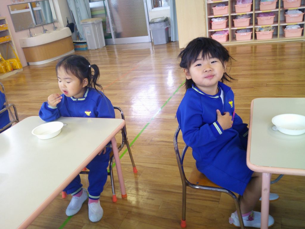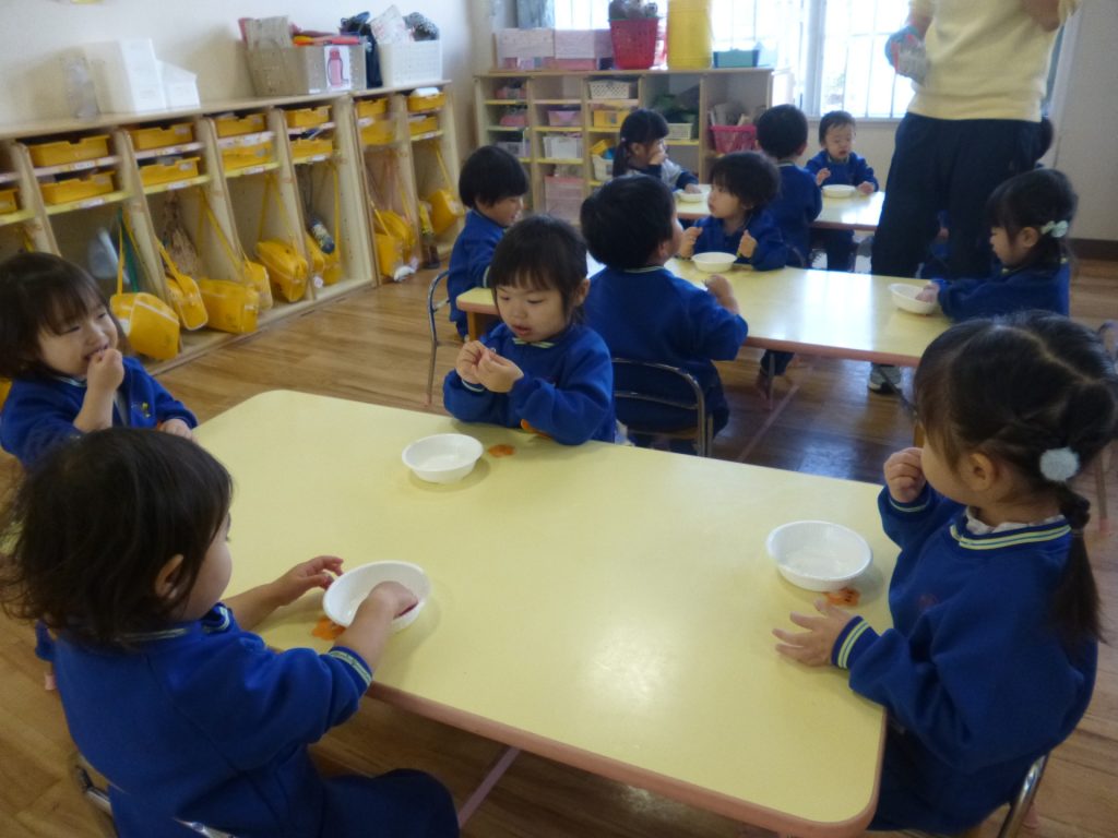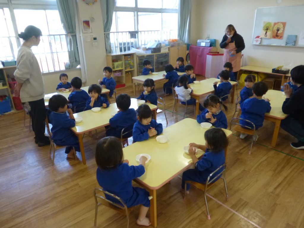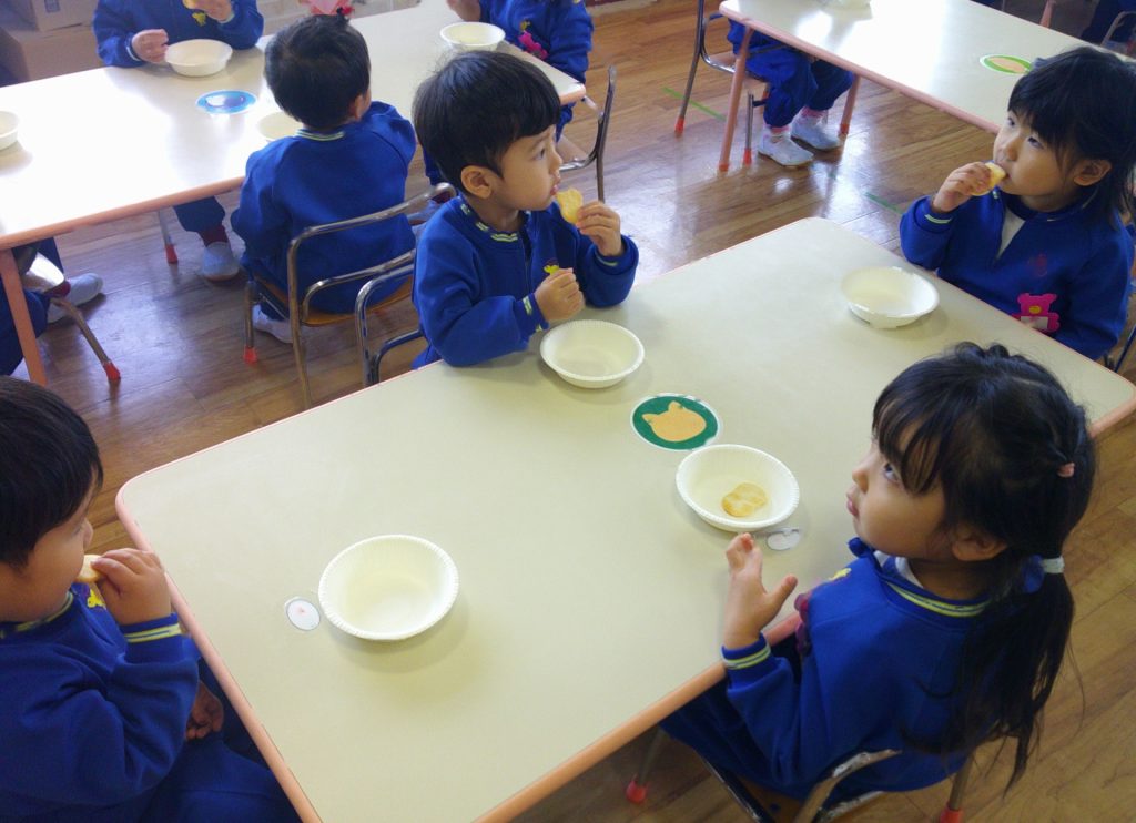 2025年11月20日 ~食育指導~ 食育指導があり、給食室の先生に、噛むことの大切さを教えて頂きました。よく噛んだら、甘い・酸っぱい・しょっぱいなどの味がしてくるんだよ。と話を聞き、せんべいや煮干しを食べてみました。「たくさん噛んだよ!」と、噛むことを意識して食べる姿が見られましたよ(*^^*)