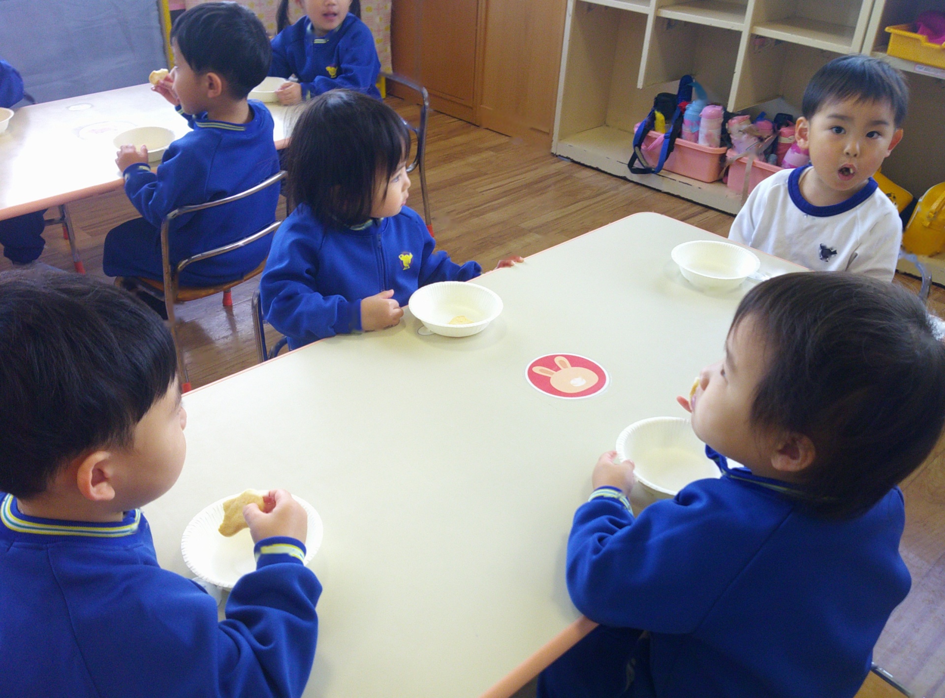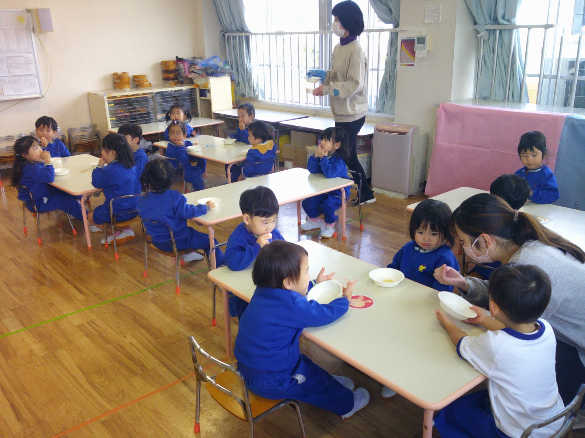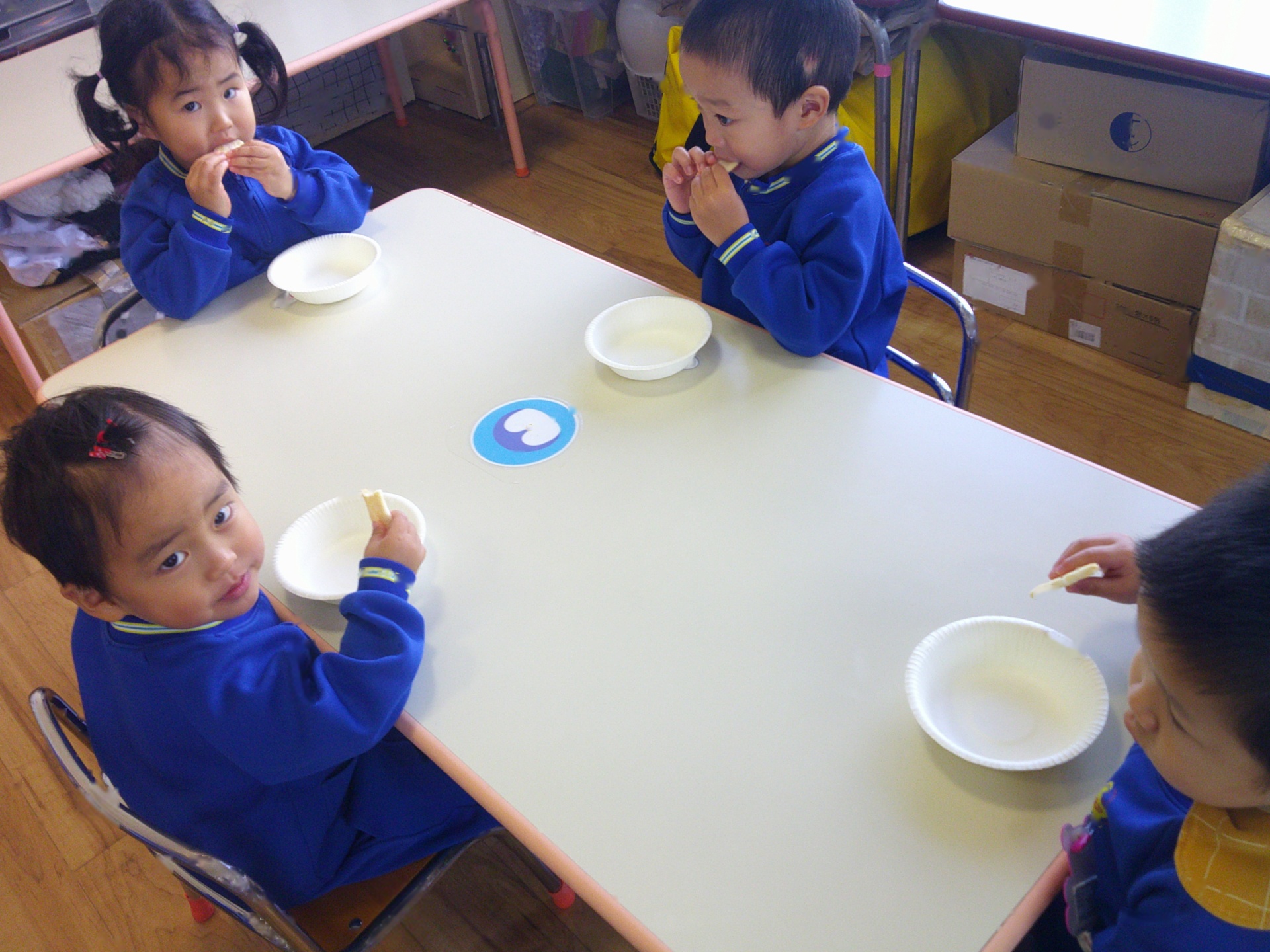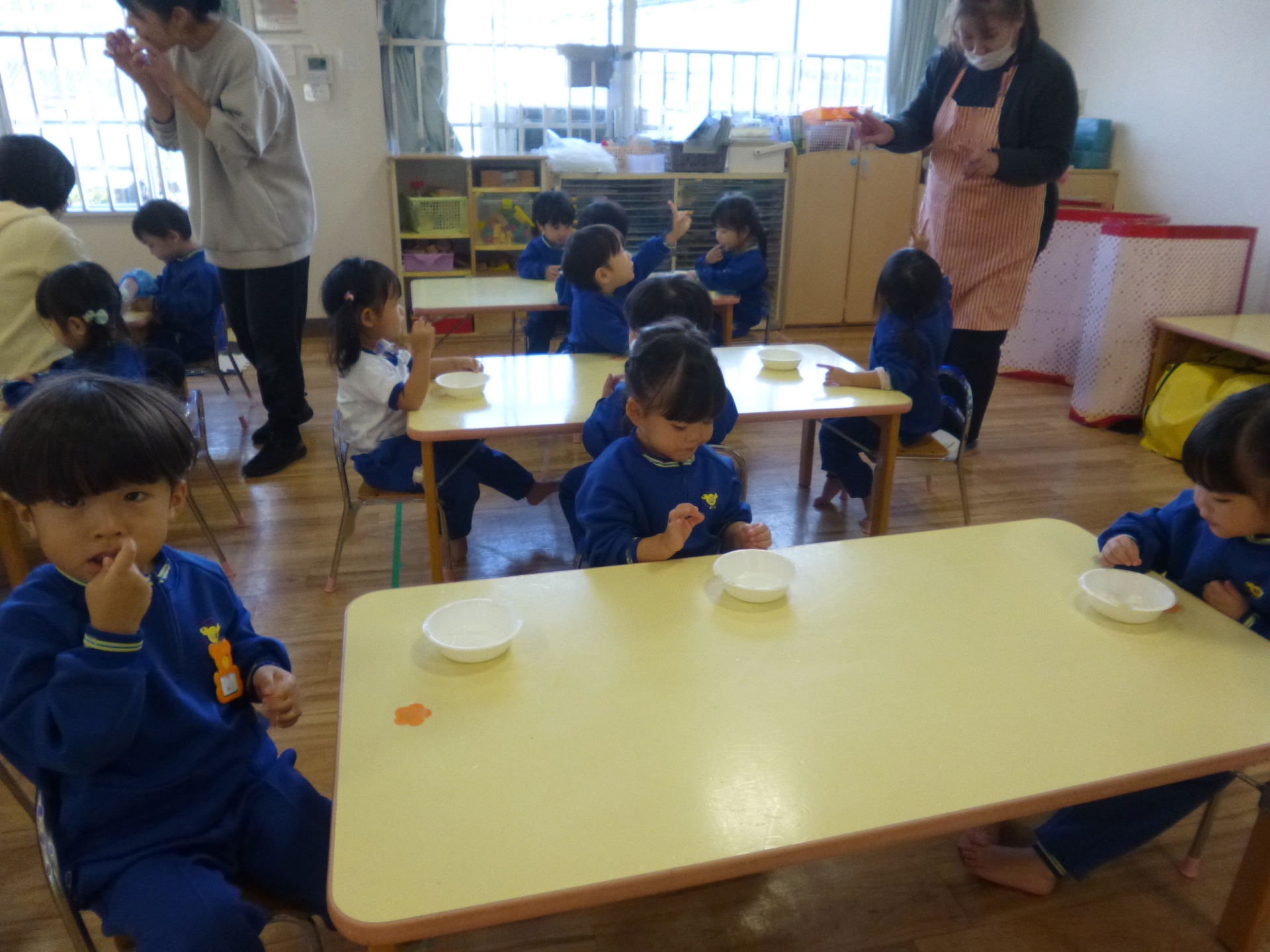 2025年11月20日 ~食育指導~ 食育指導があり、給食室の先生に、噛むことの大切さを教えて頂きました。よく噛んだら、甘い・酸っぱい・しょっぱいなどの味がしてくるんだよ。と話を聞き、せんべいや煮干しを食べてみました。「たくさん噛んだよ!」と、噛むことを意識して食べる姿が見られましたよ(*^^*)