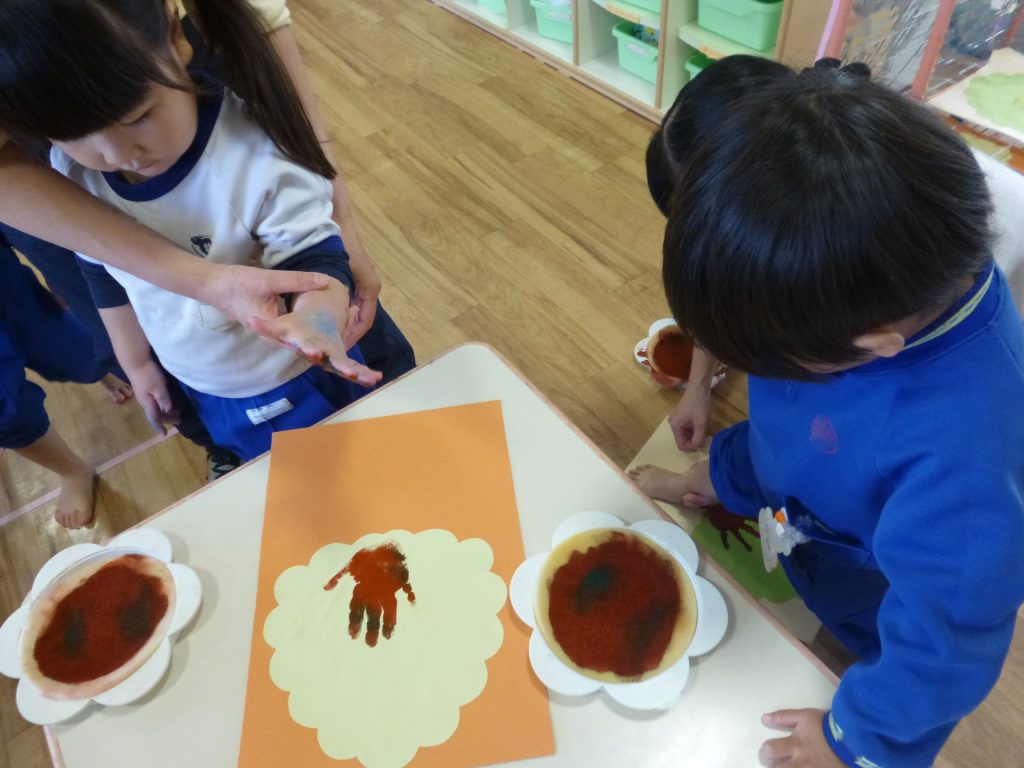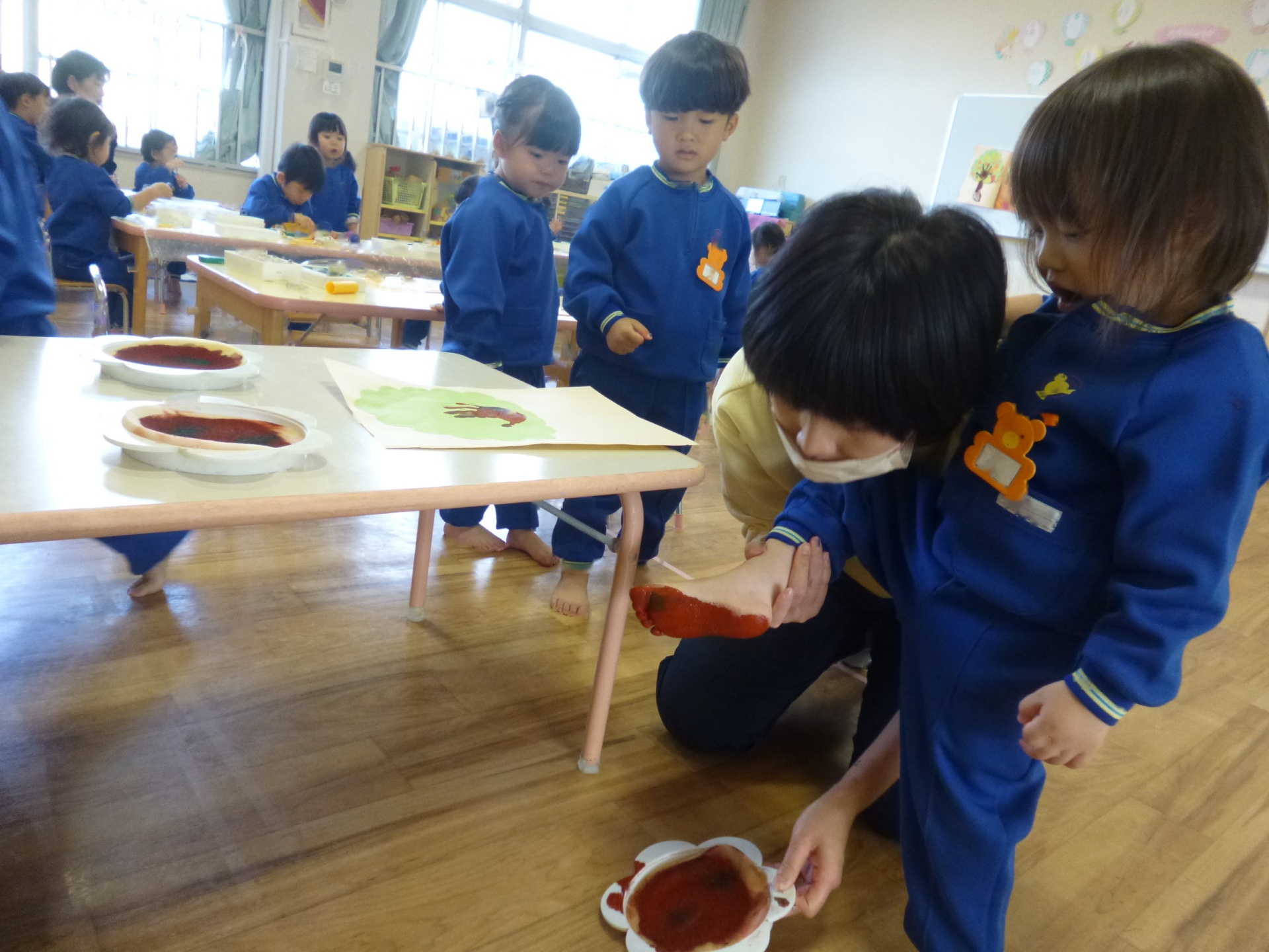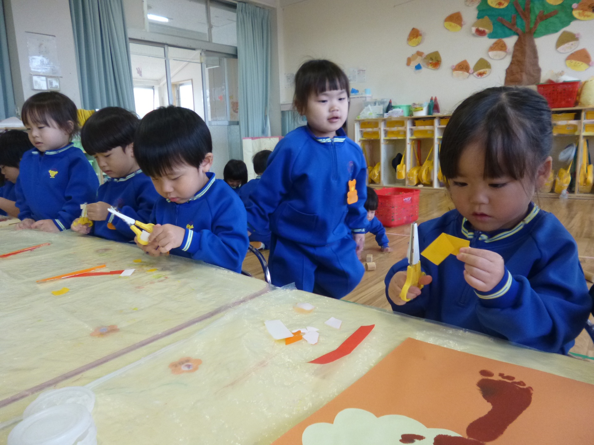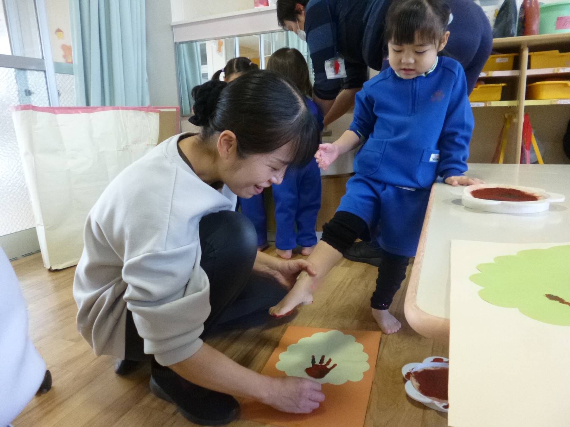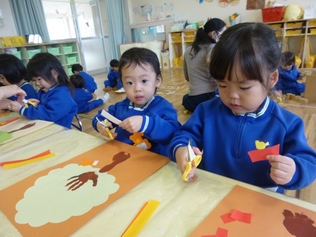 2025年11月22日 秋のはっぱ、きれいだね 手形や足形を「木」に見立てて、制作遊びをしました。足裏の絵の具がくすぐったくて、かわいい表情を見せていた子ども達です。赤や黄色の葉っぱは、折り紙をはさみで切って作りましたよ。