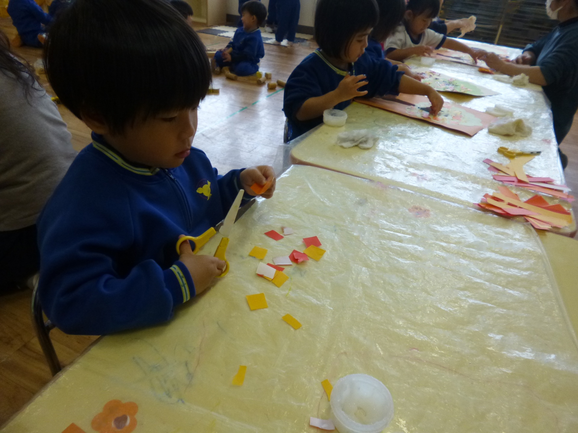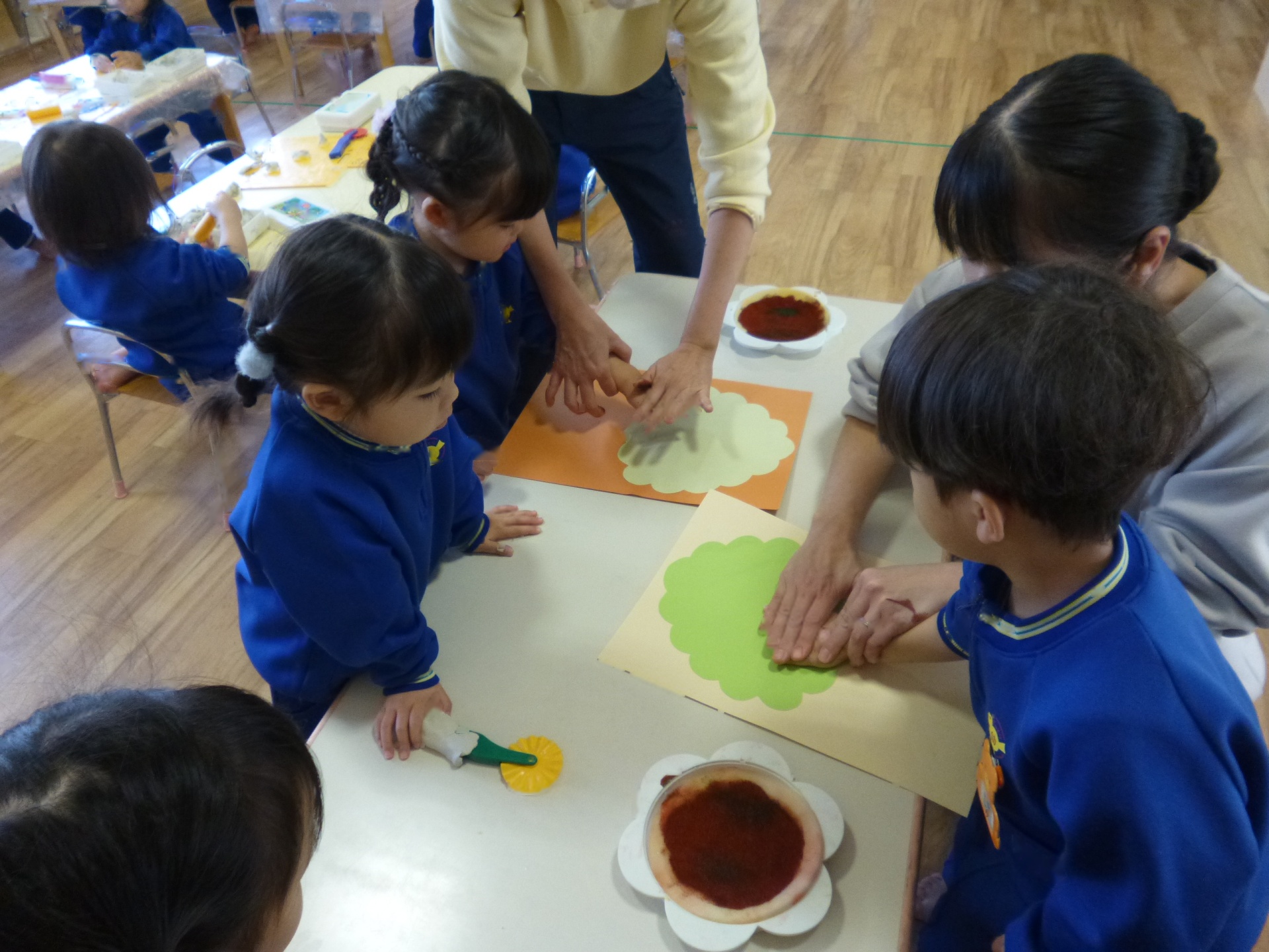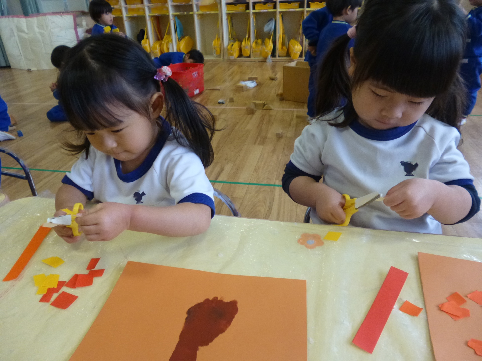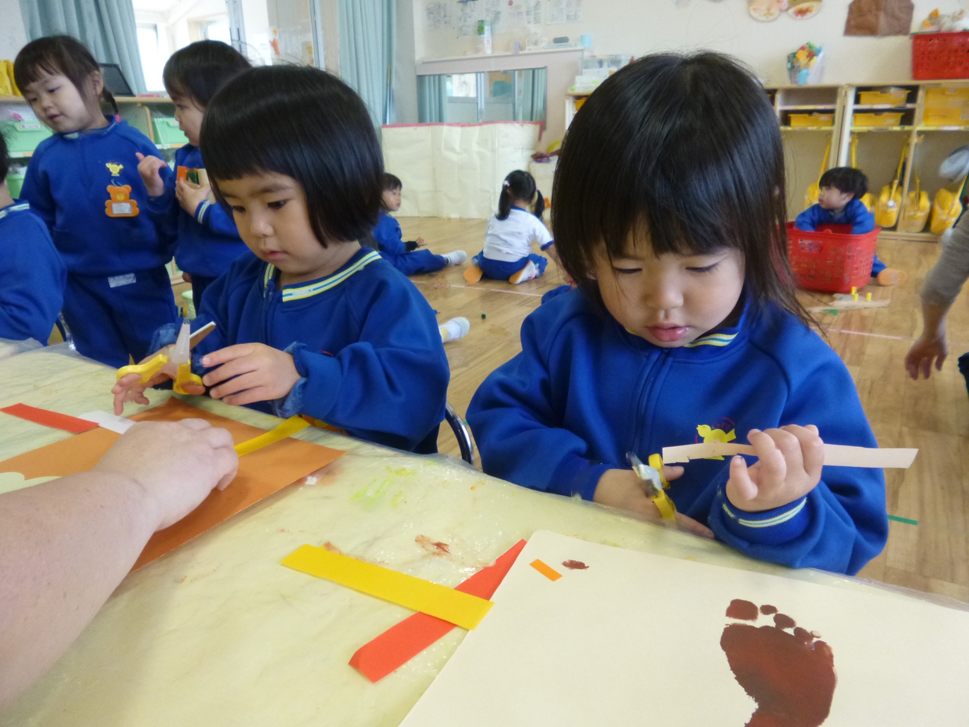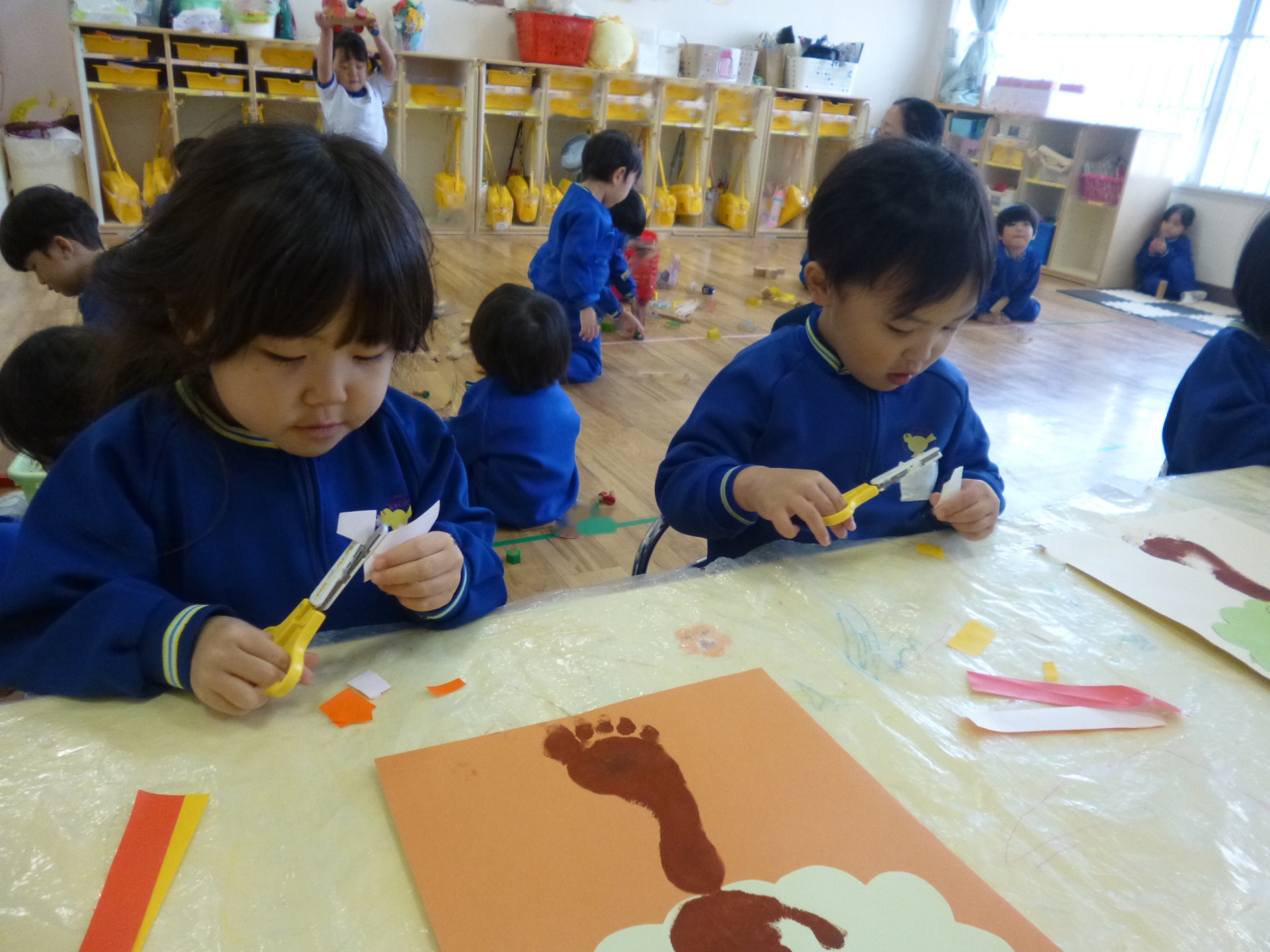 2025年11月22日 秋のはっぱ、きれいだね 手形や足形を「木」に見立てて、制作遊びをしました。足裏の絵の具がくすぐったくて、かわいい表情を見せていた子ども達です。赤や黄色の葉っぱは、折り紙をはさみで切って作りましたよ。