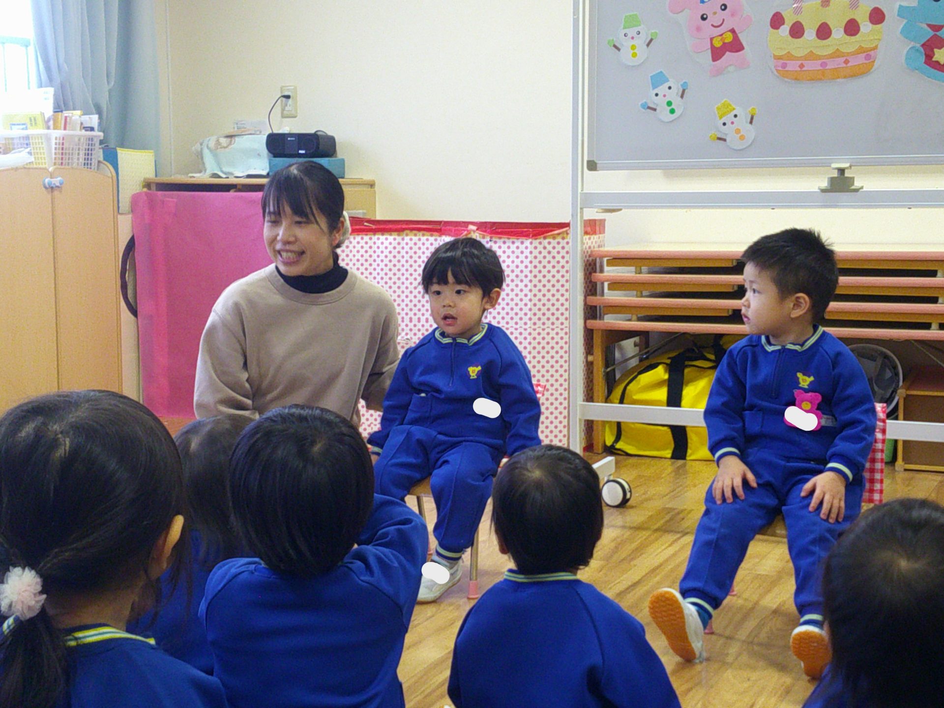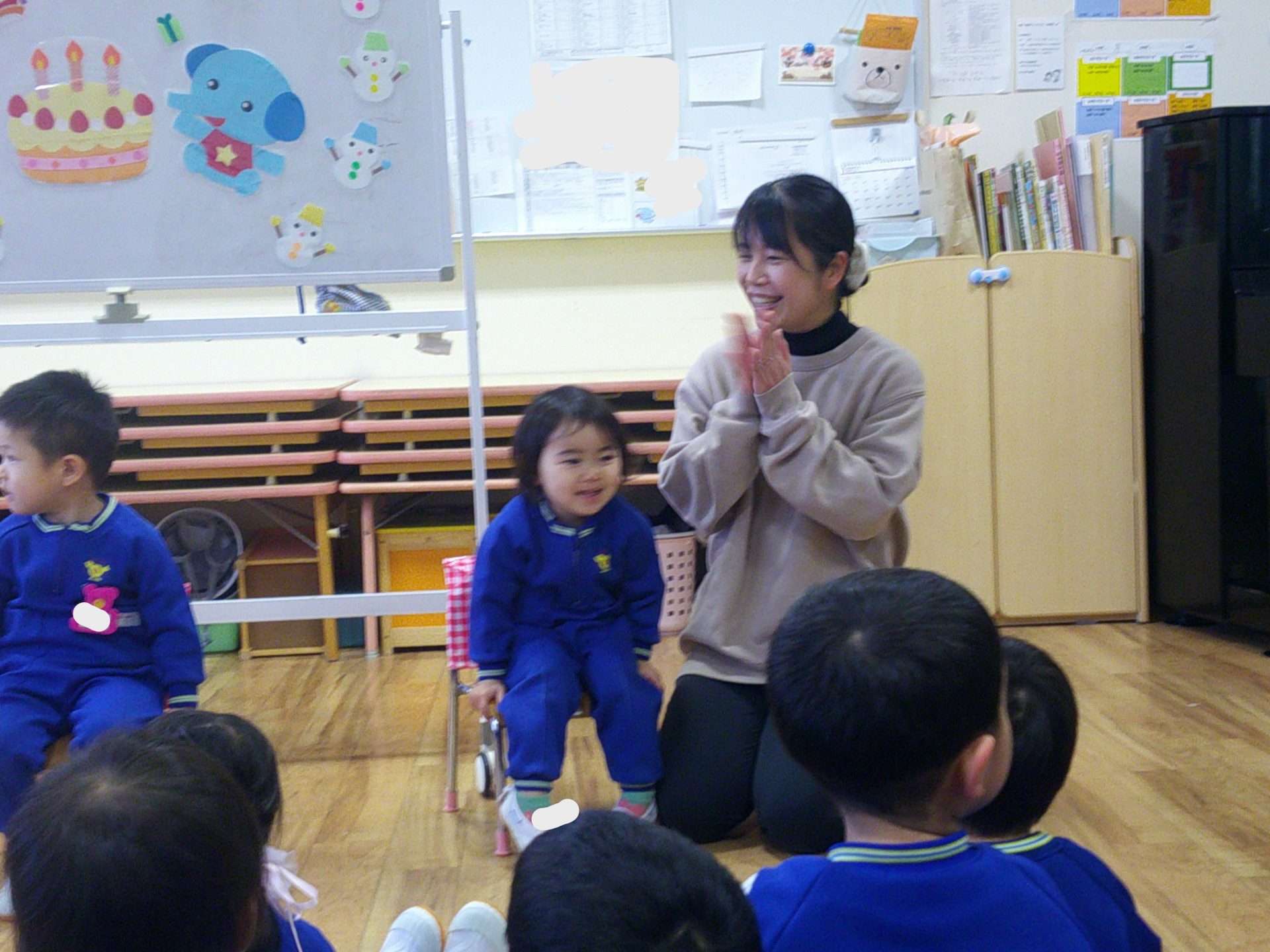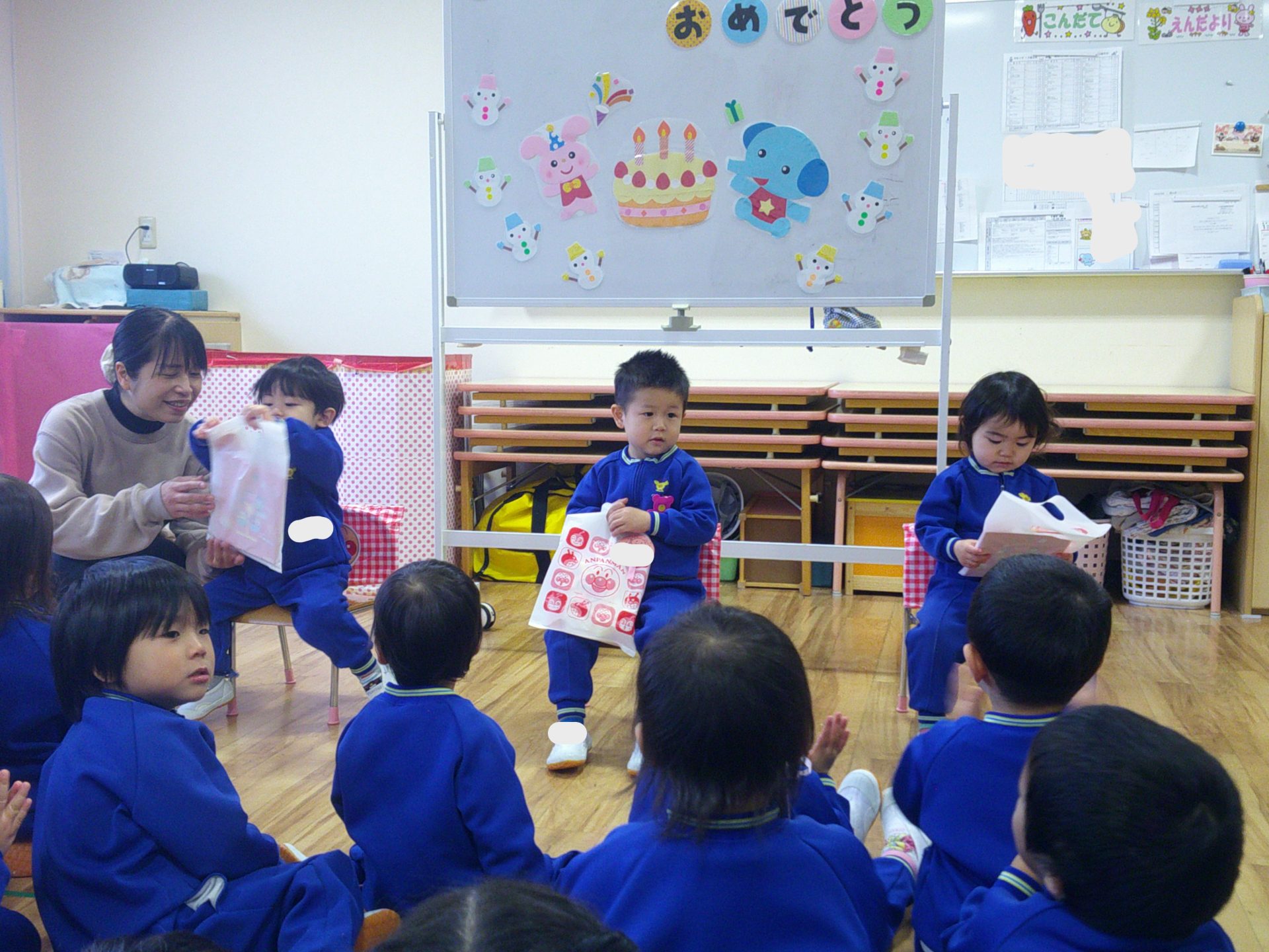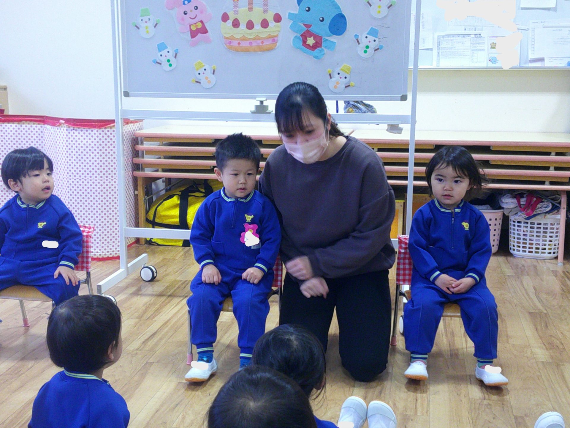 1月生まれの誕生日会が行われました❄最初に「雪だるまのチャチャチャ」を歌いました⛄とても元気に楽しそうに歌っている姿も見られましたよ😊1月生まれのお友達は3人でした!お名前が呼ばれたらすぐに「ここ座りたいな」と好きな席に座って大満足なお友達です😊お誕生月のお友達の紹介では、少し恥ずかしそうになりながらも名前と「3さい!」と指を出して教えてくれましたよ😊園長先生からのお祝いの言葉では、絵本のプレゼント🎁「誕生日」の歌を歌い、お楽しみのコーナーではお正月の遊びである「福笑い」と「こま回し」でした!「ふくわらい」では、本来は目を隠してパーツをつけますが、子ども達には少し難しいので、今回は目は隠さないで実際に1月生まれのお友達が挑戦しました!自分でパーツを付けたり職員と一緒に付けたりしながら素晴らしい「福笑い」が完成しました!コマ回しは職員が挑戦しました!回るコマに子どもたちは大喜びでした!寒さに負けずにいっぱい遊んでいっぱい食べて大きくなってくださいね😊お誕生日おめでとうございます🎂