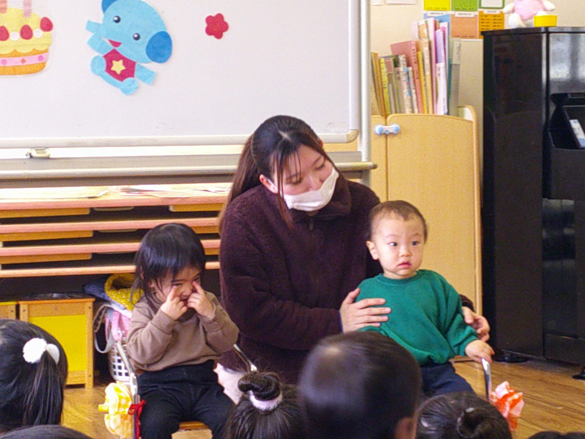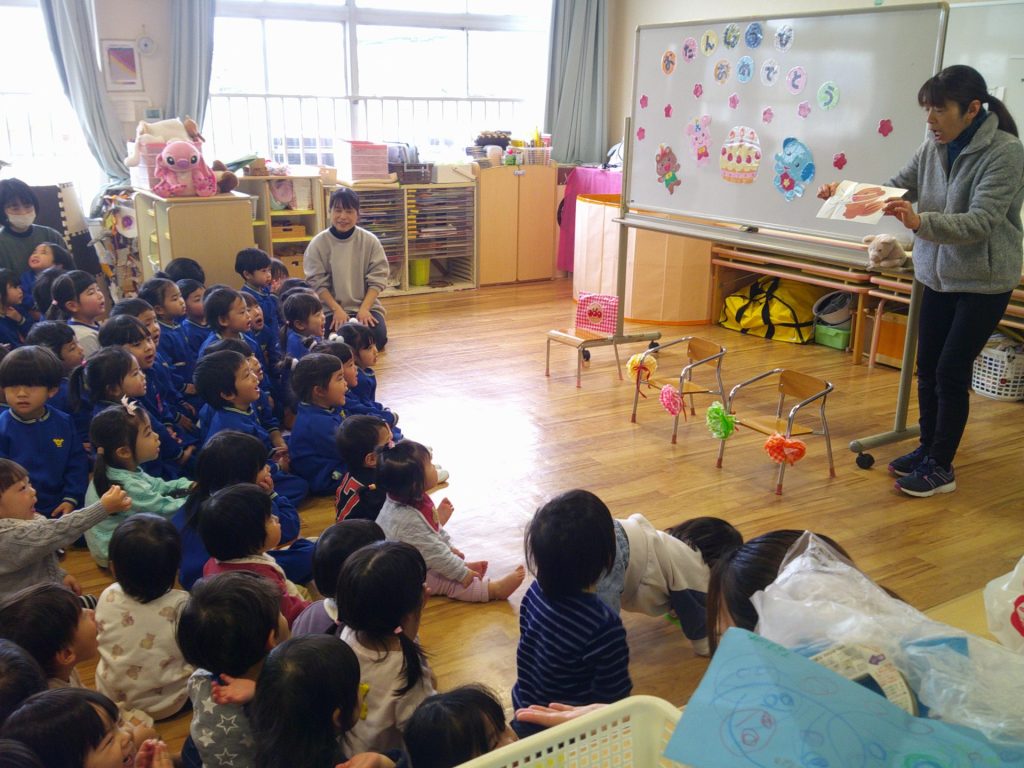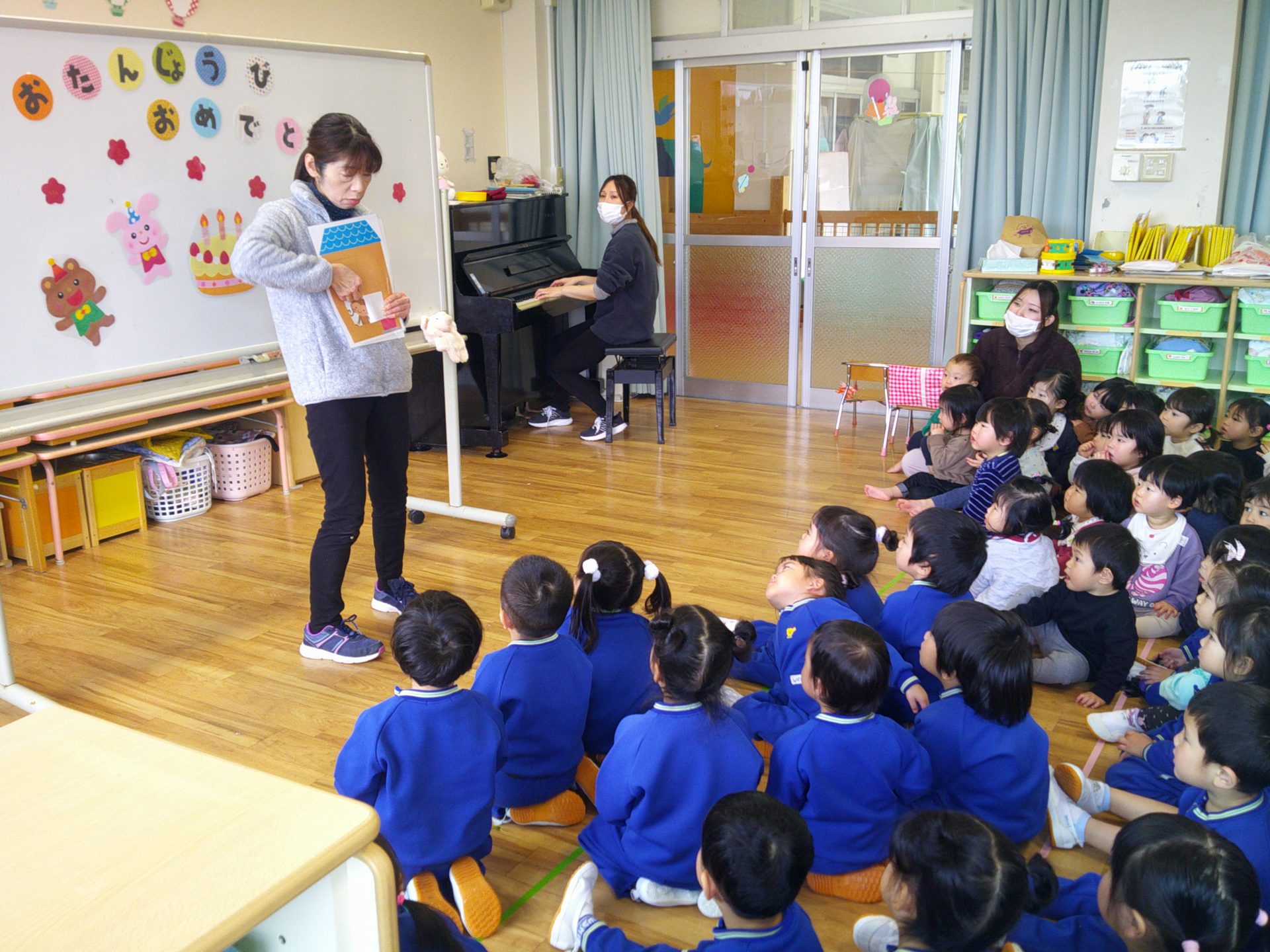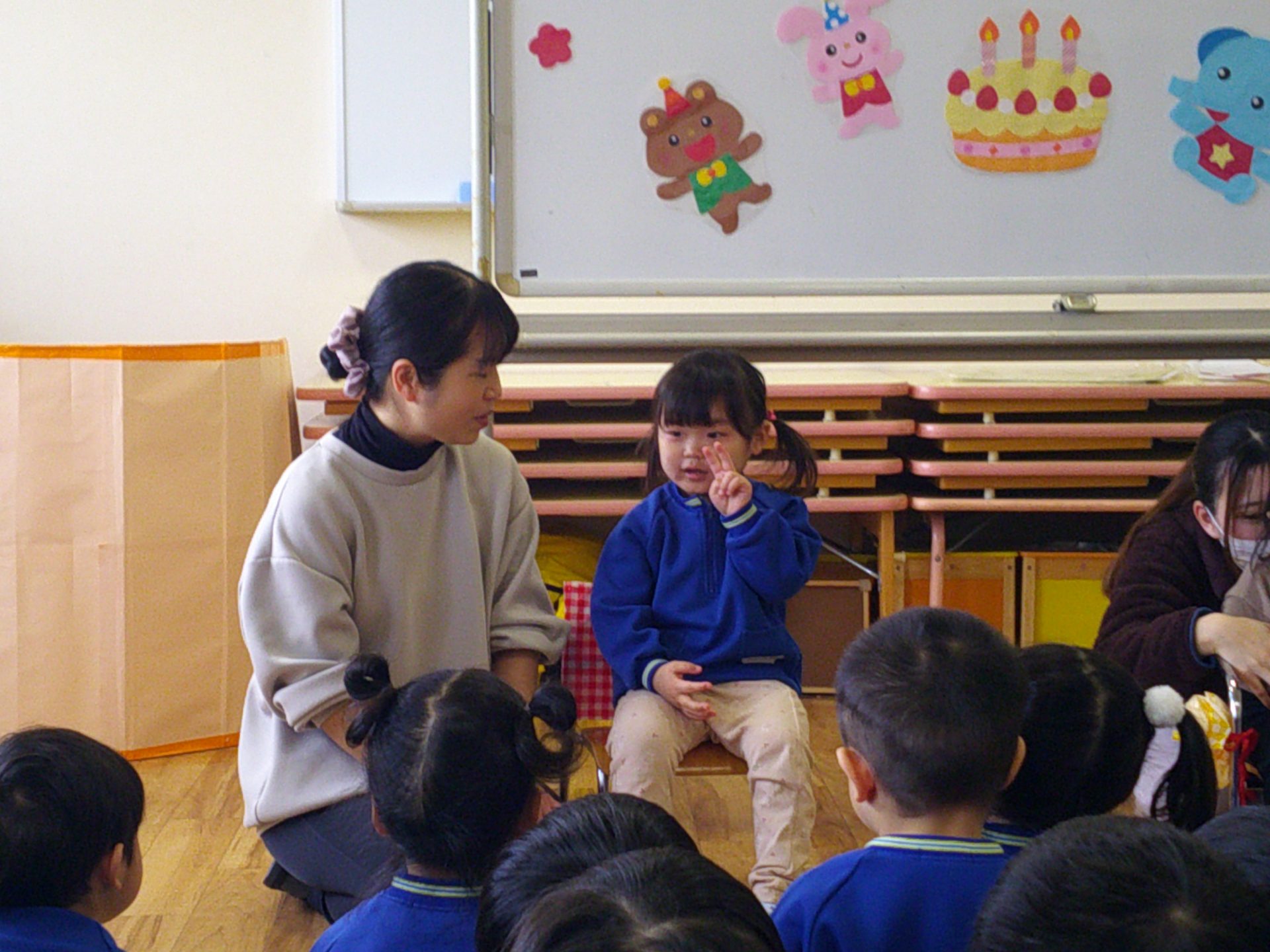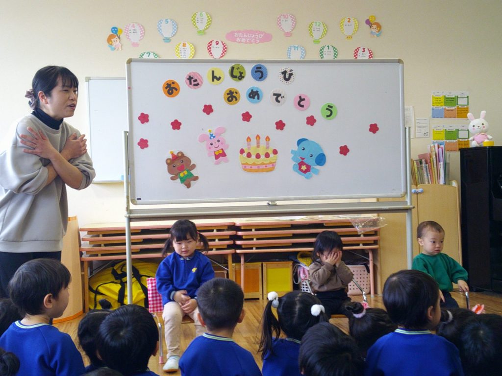 2026年02月24日 2月生まれのお誕生会 2月生まれのお友達のお誕生会をしました。 みんなにお祝いの歌を歌ってもらったり、先生からのペープサートのお楽しみを見て楽しいじかんを過ごしました。いろいろな動物がお家から出てきて興味津々の子ども達でした。