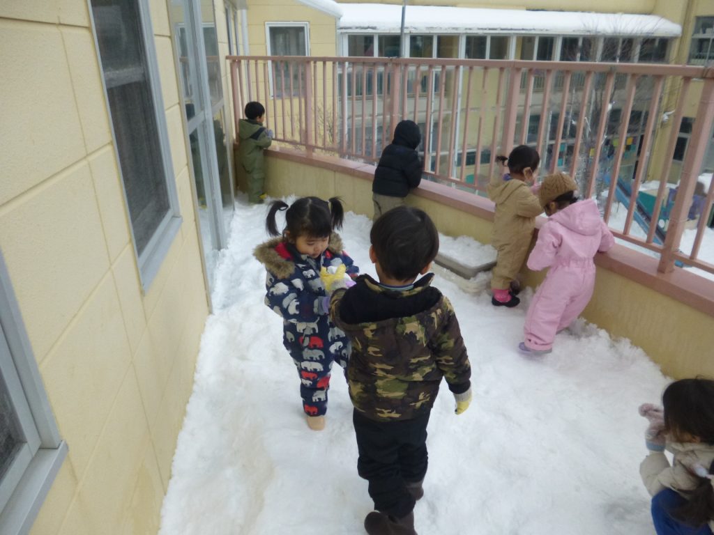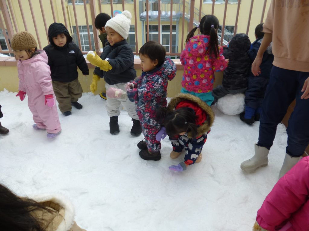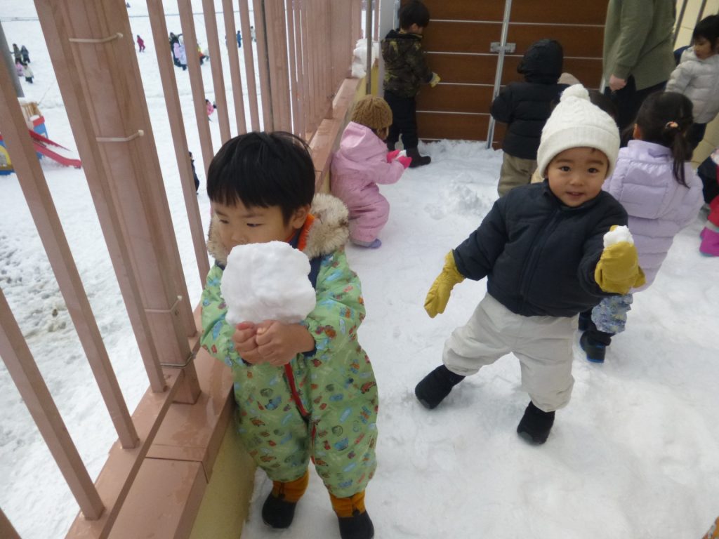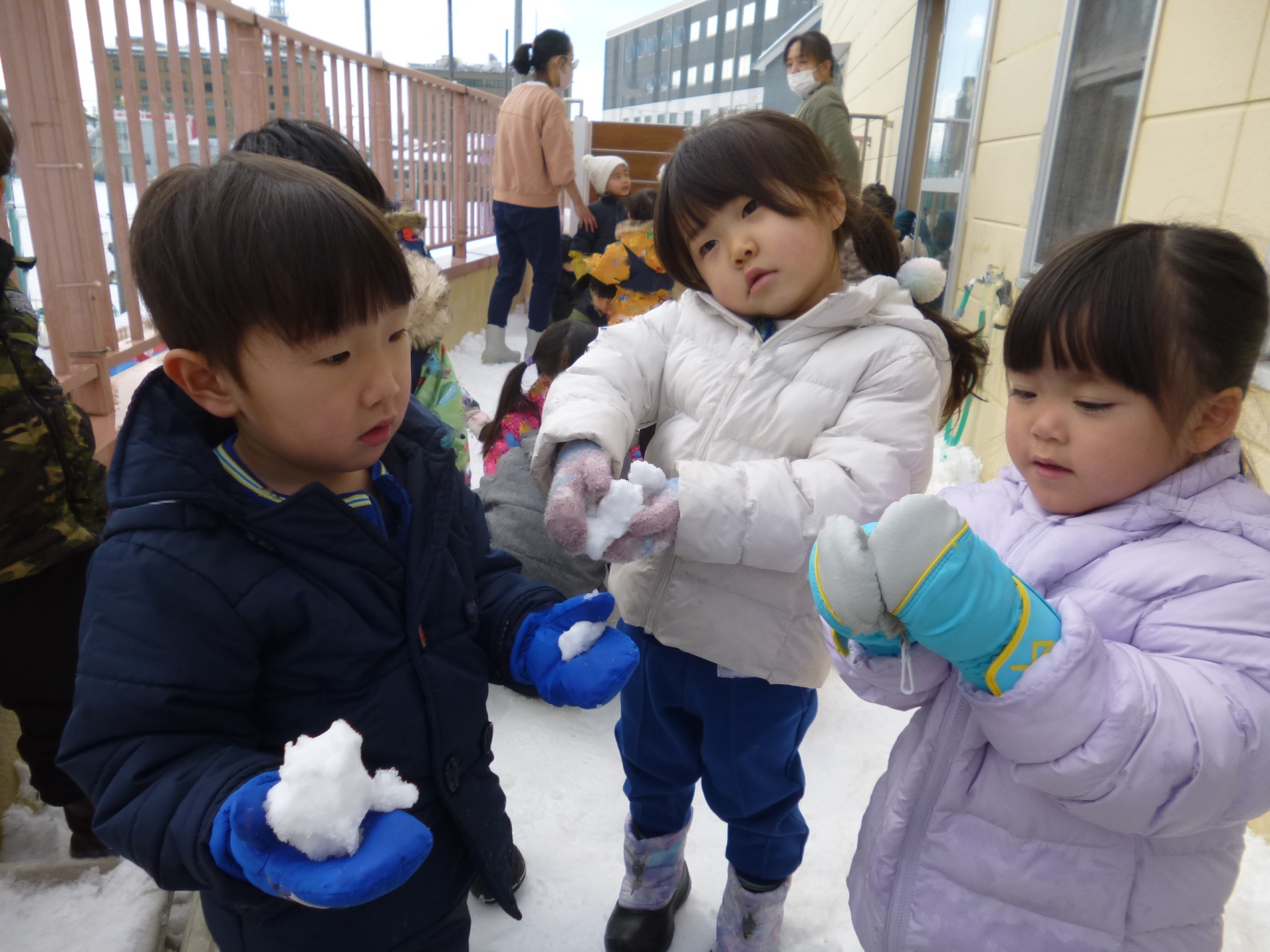2026年01月28日 雪遊びをしたよ 先日、いちご組前のテラスで雪遊びをしました。雪だるまをつくったり、雪玉を投げっこして遊んだり・・「つめたーい!」「ゆきだるまをつくったら♪」とお話したり歌ったりしながら楽しんでいた子どもたちです。また遊びたいね(*^^*)