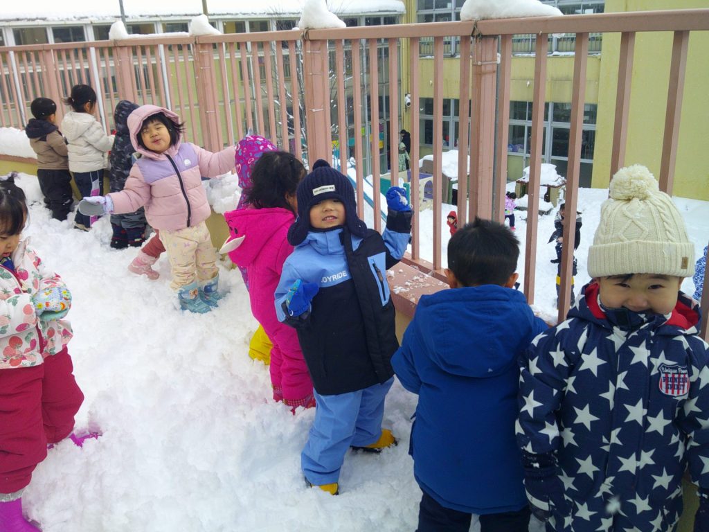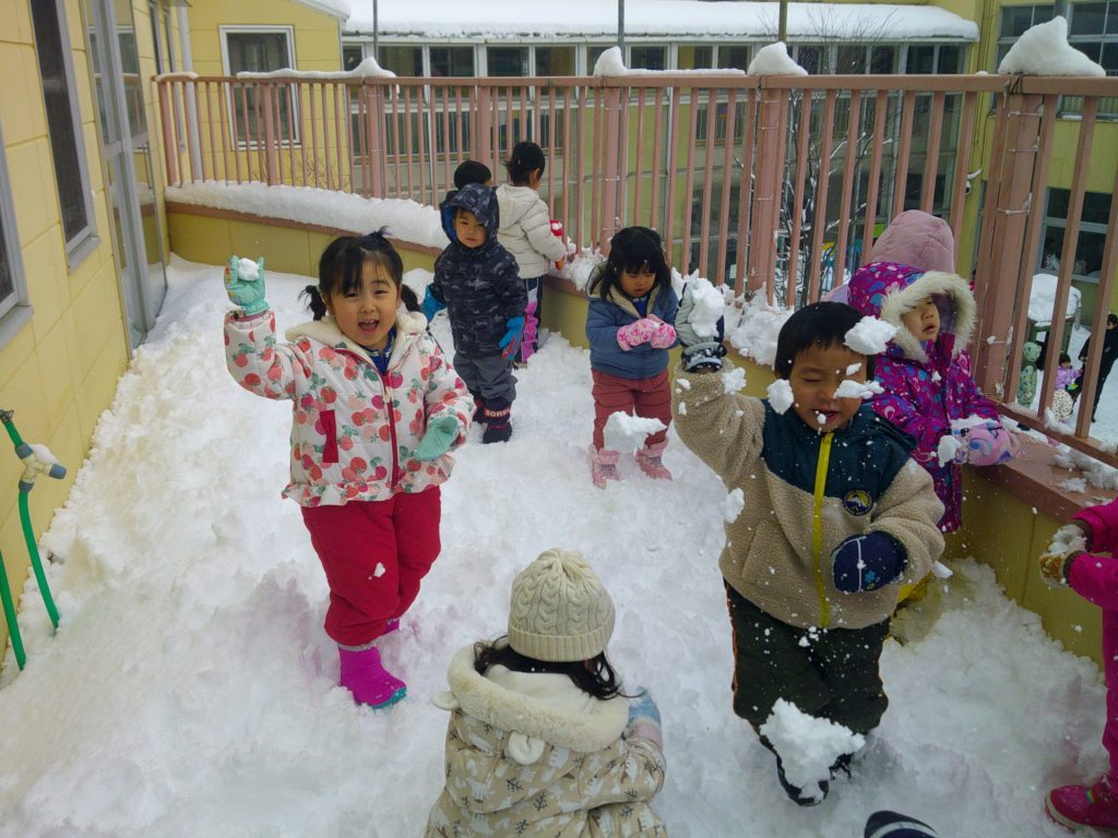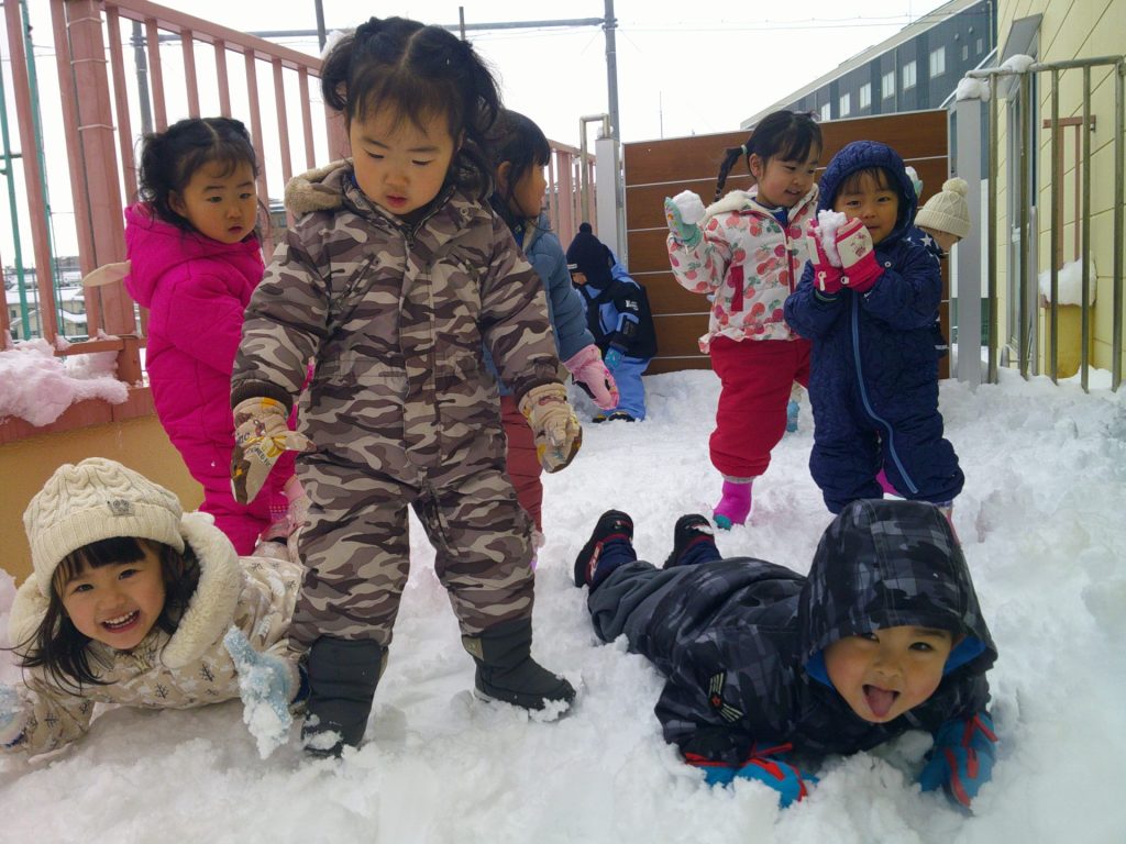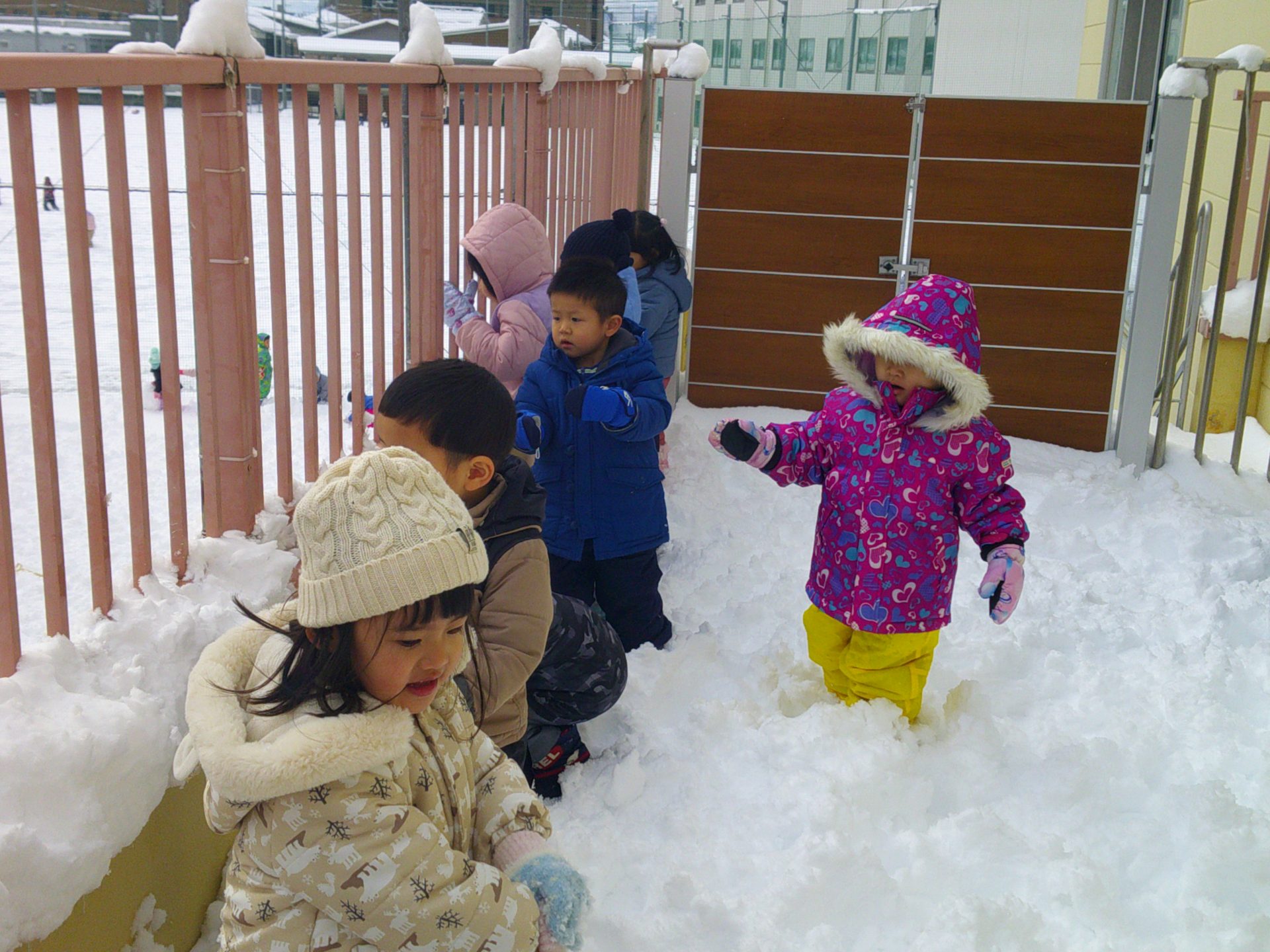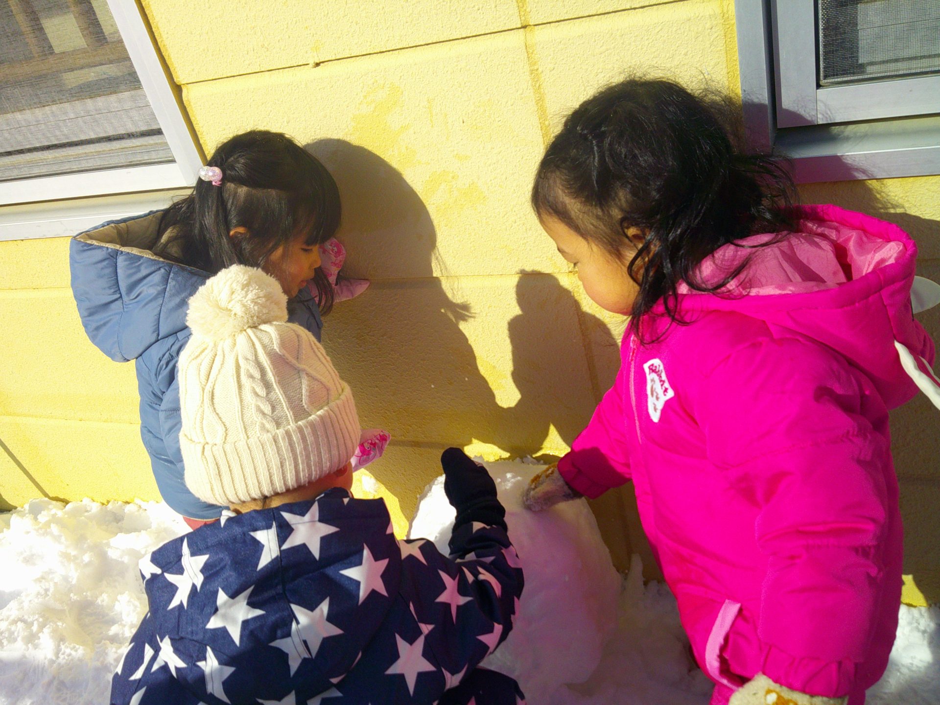 2026年01月28日 雪遊びをしたよ 先日、いちご組前のテラスで雪遊びをしました。雪だるまをつくったり、雪玉を投げっこして遊んだり・・「つめたーい!」「ゆきだるまをつくったら♪」とお話したり歌ったりしながら楽しんでいた子どもたちです。また遊びたいね(*^^*)