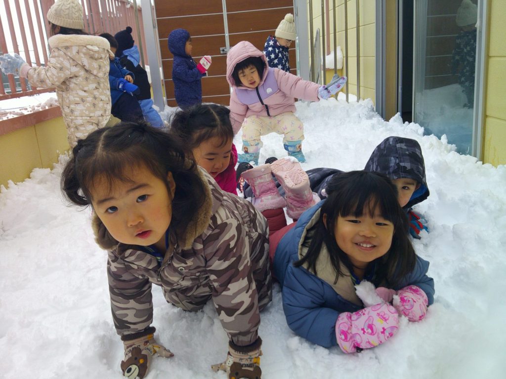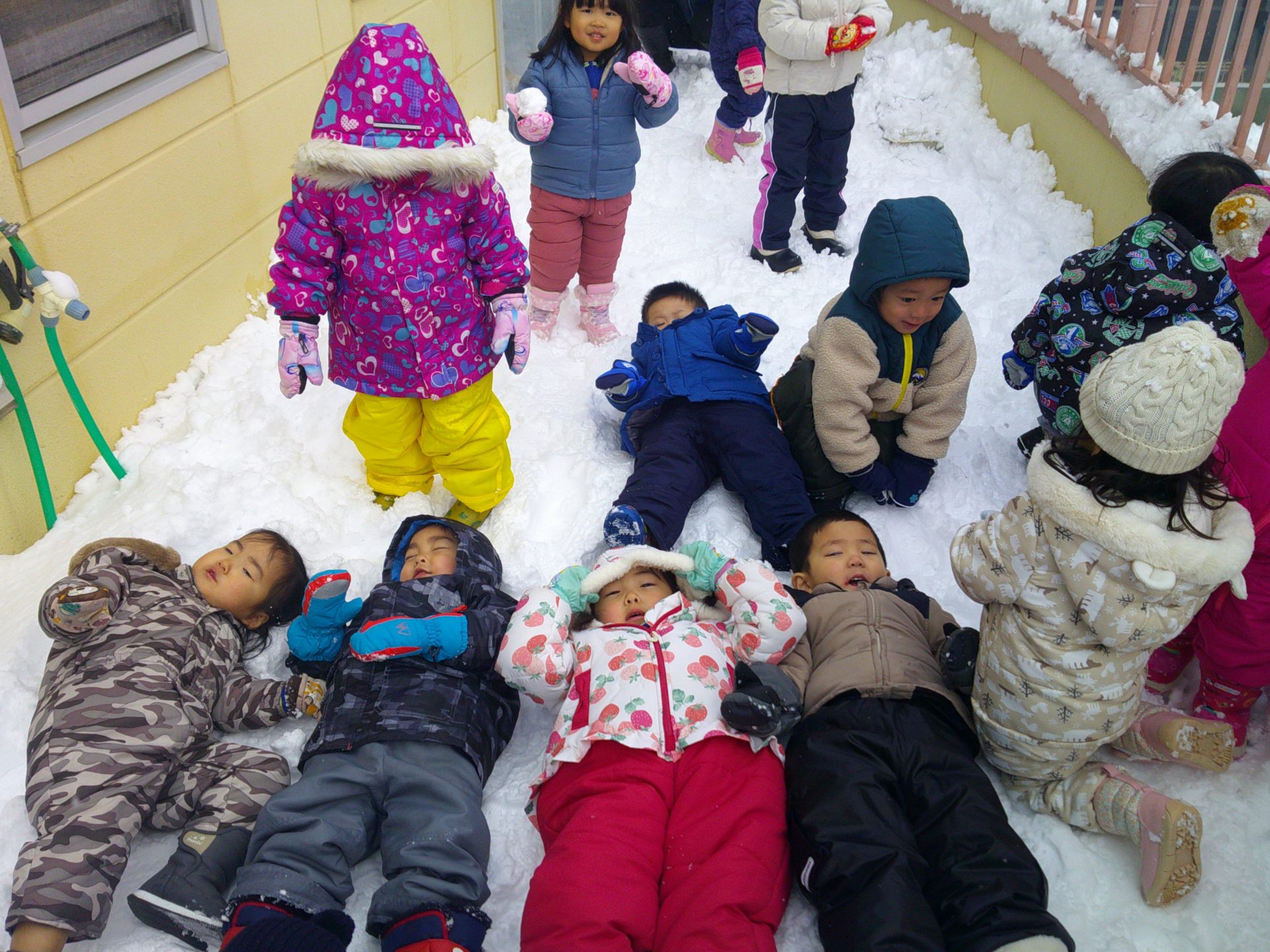 2026年01月23日 雪遊びをしたよ☃ 雪遊びを楽しみました。積雪量が多かったので園庭には出ず、いちご組前のテラスで遊びました。雪の上に寝転がったり、雪だるまをつくったり・・初めての雪遊びでしたが、「ゆきだるまできたよ!」「つららがあるよ!」と楽しそうな声がたくさん聞かれました(*^^*)