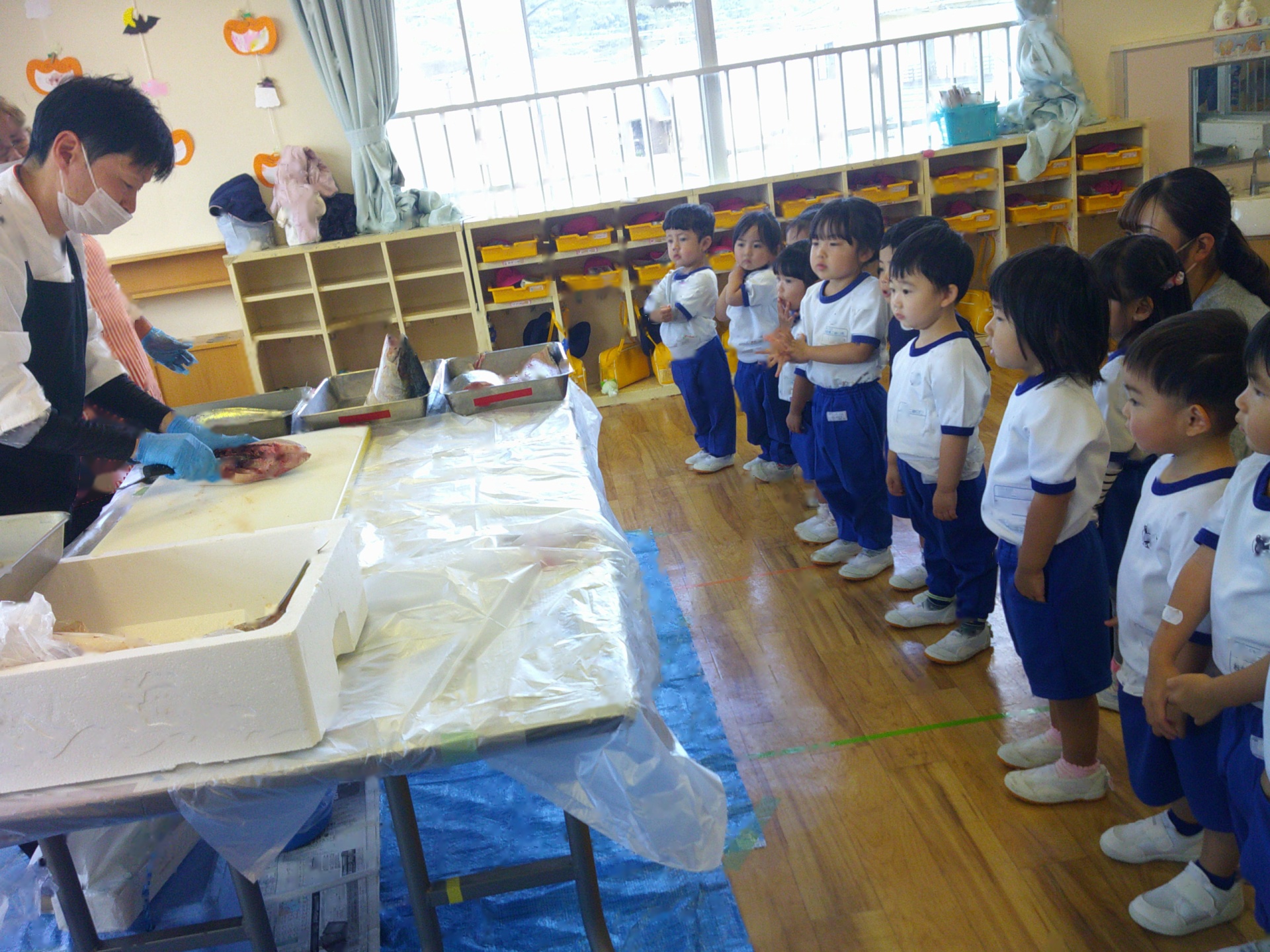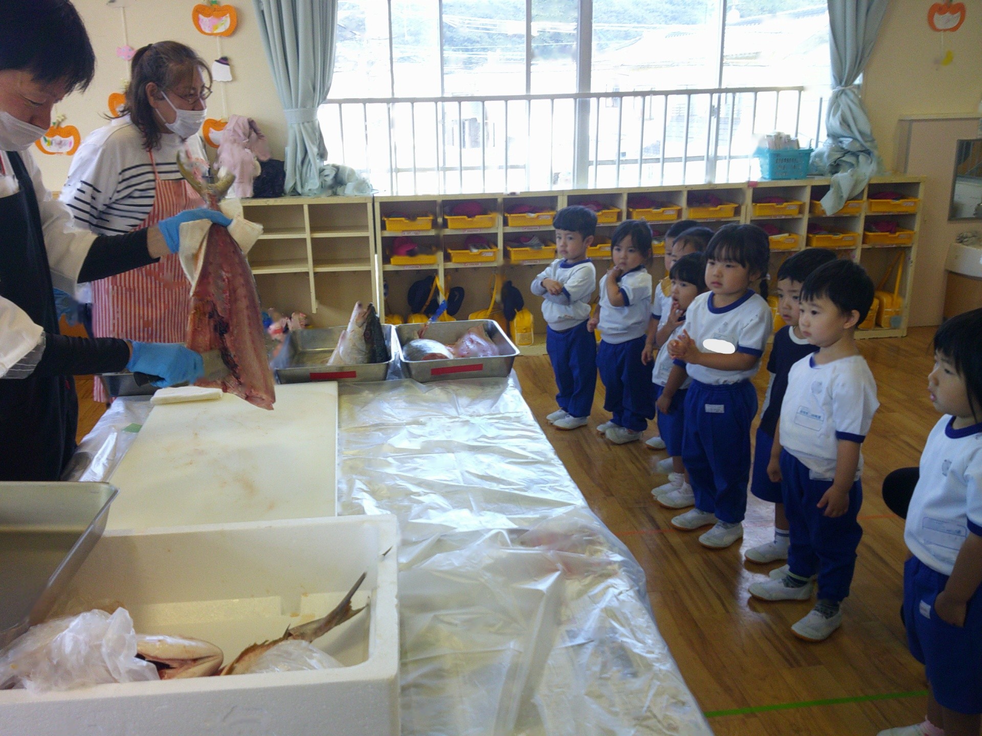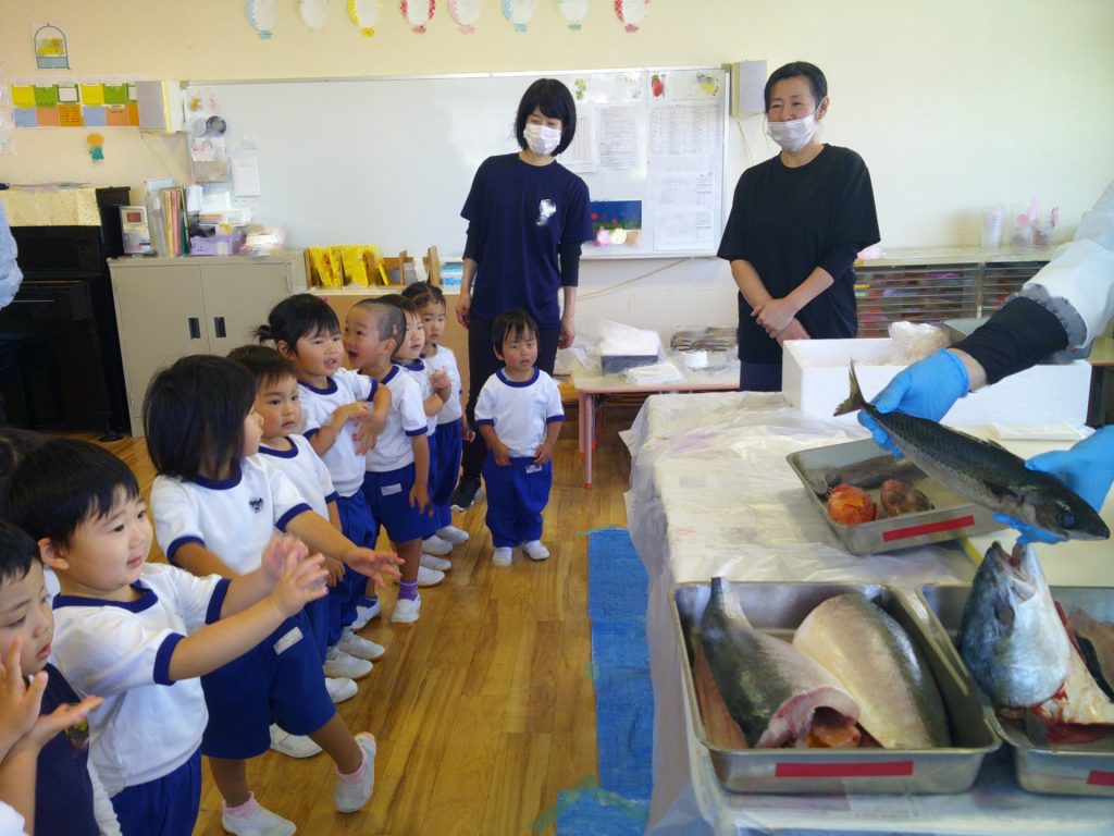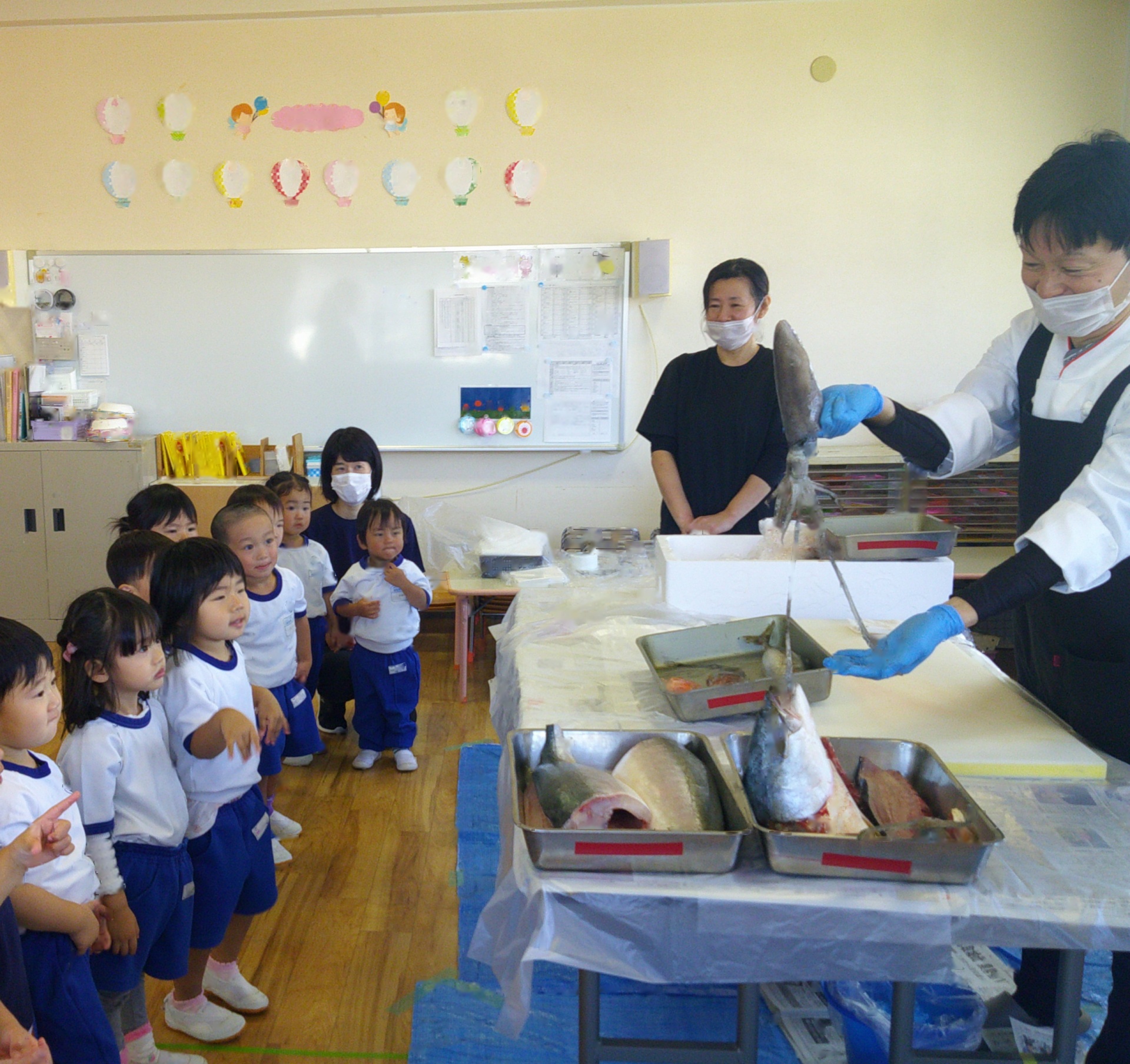 2025年10月23日 食育指導~魚のおなかを知ろう~ 食育指導があり、魚をさばくところを見せていただきました。大きな魚に興味津々の子どもたち。「おおきいね~」「おさかな!」とたくさんの声が聞かれました。その後で、サバやメバルやイカも見せていただき、楽しい時間を過ごしました。給食には、ハマチの照り焼きを出していただき、「さっきのお魚だ~!」とお話をしながら、おいしくいただきました(*^^*)
