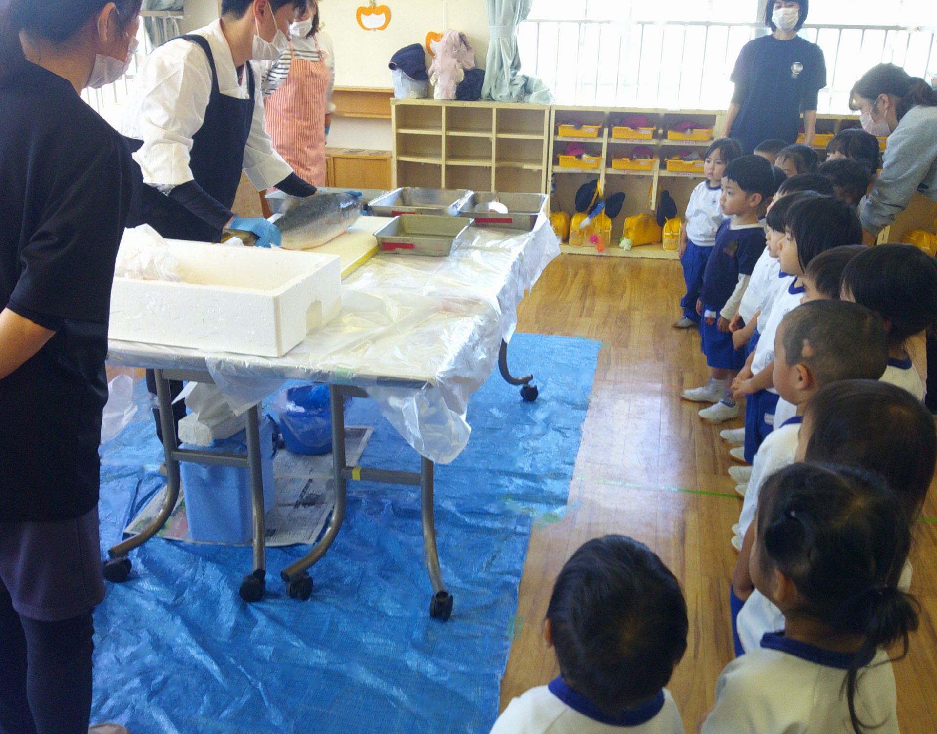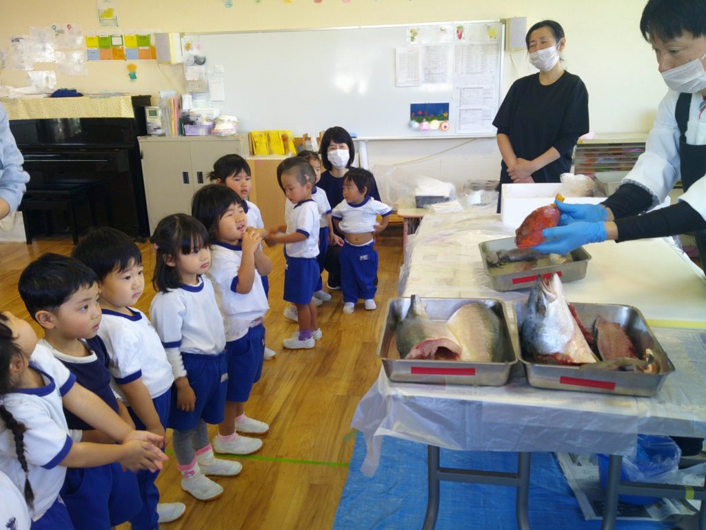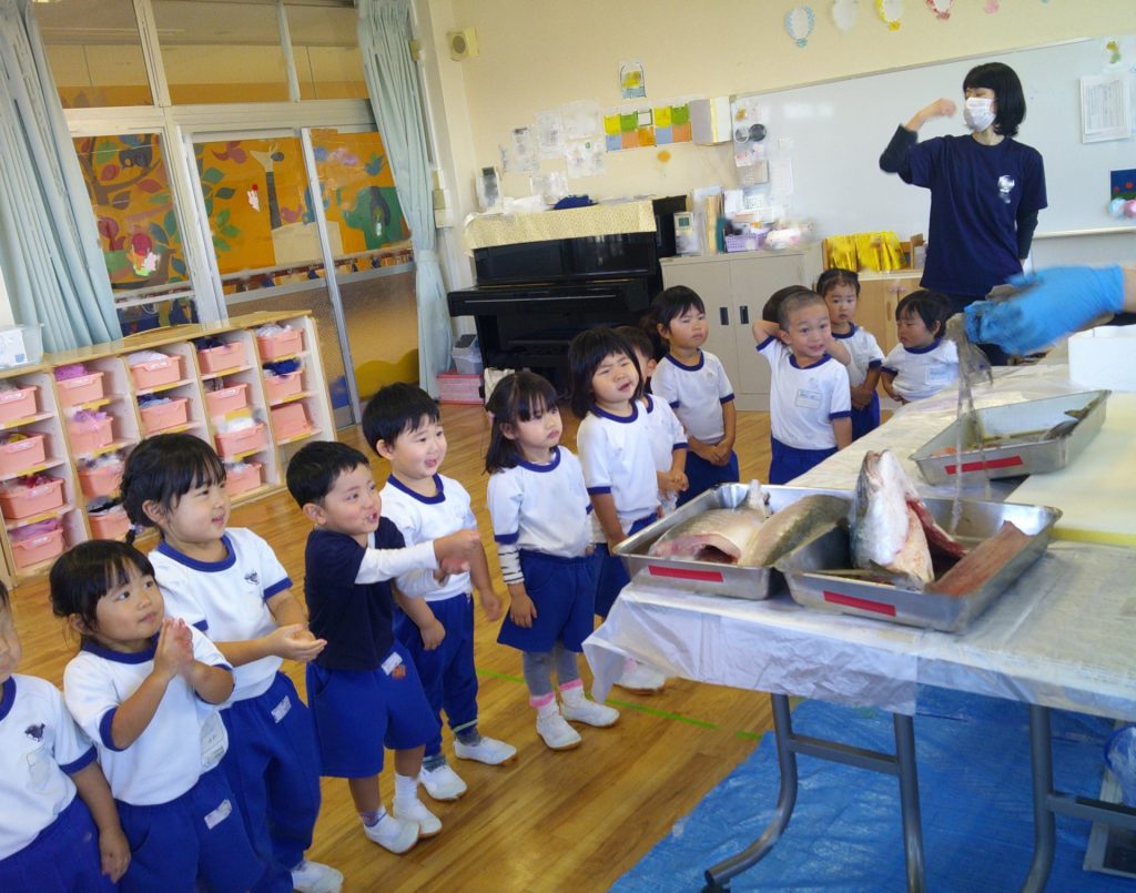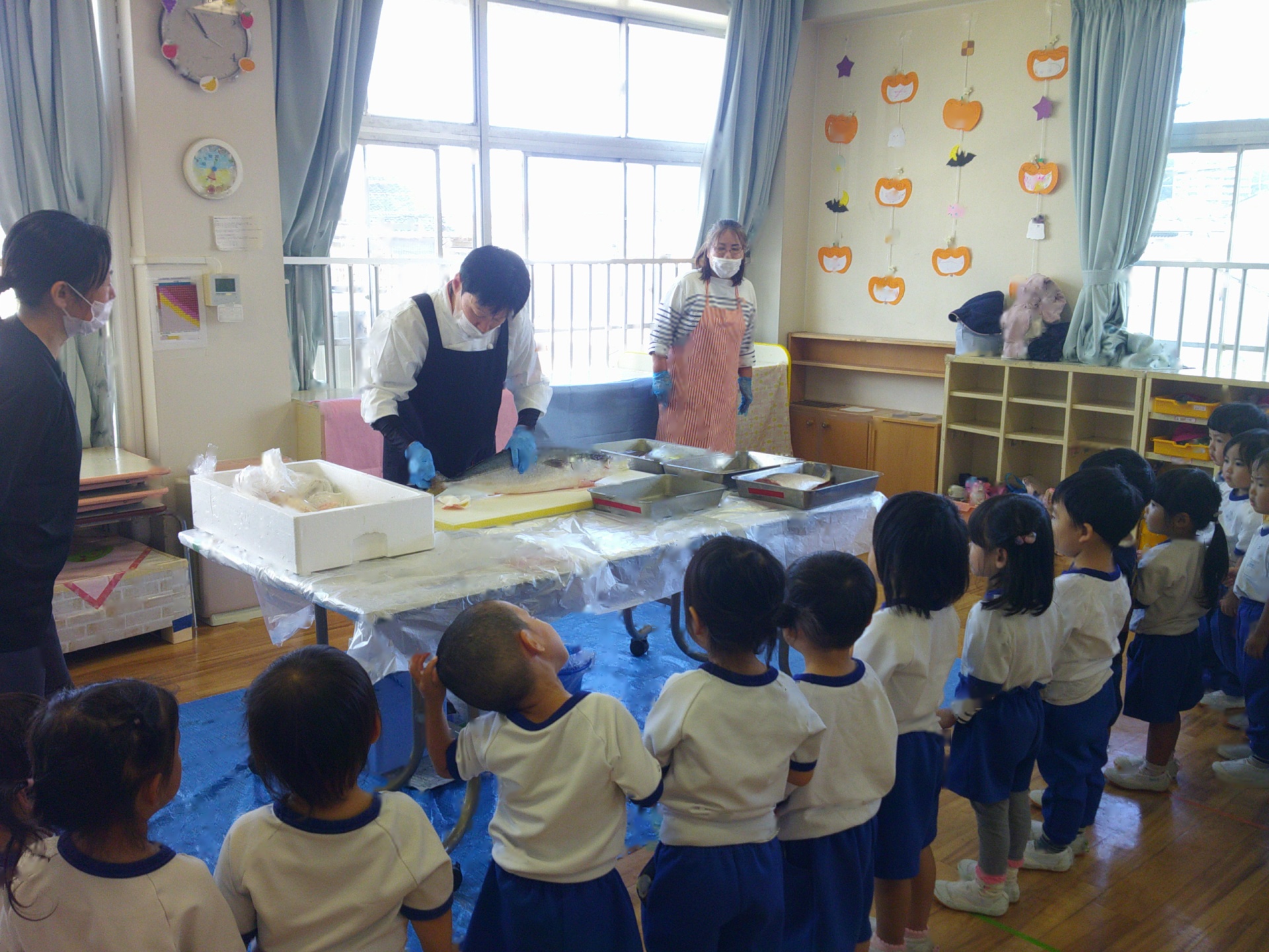 2025年10月23日 食育指導~魚のおなかを知ろう~ 食育指導があり、魚をさばくところを見せていただきました。大きな魚に興味津々の子どもたち。「おおきいね~」「おさかな!」とたくさんの声が聞かれました。その後で、サバやメバルやイカも見せていただき、楽しい時間を過ごしました。給食には、ハマチの照り焼きを出していただき、「さっきのお魚だ~!」とお話をしながら、おいしくいただきました(*^^*)