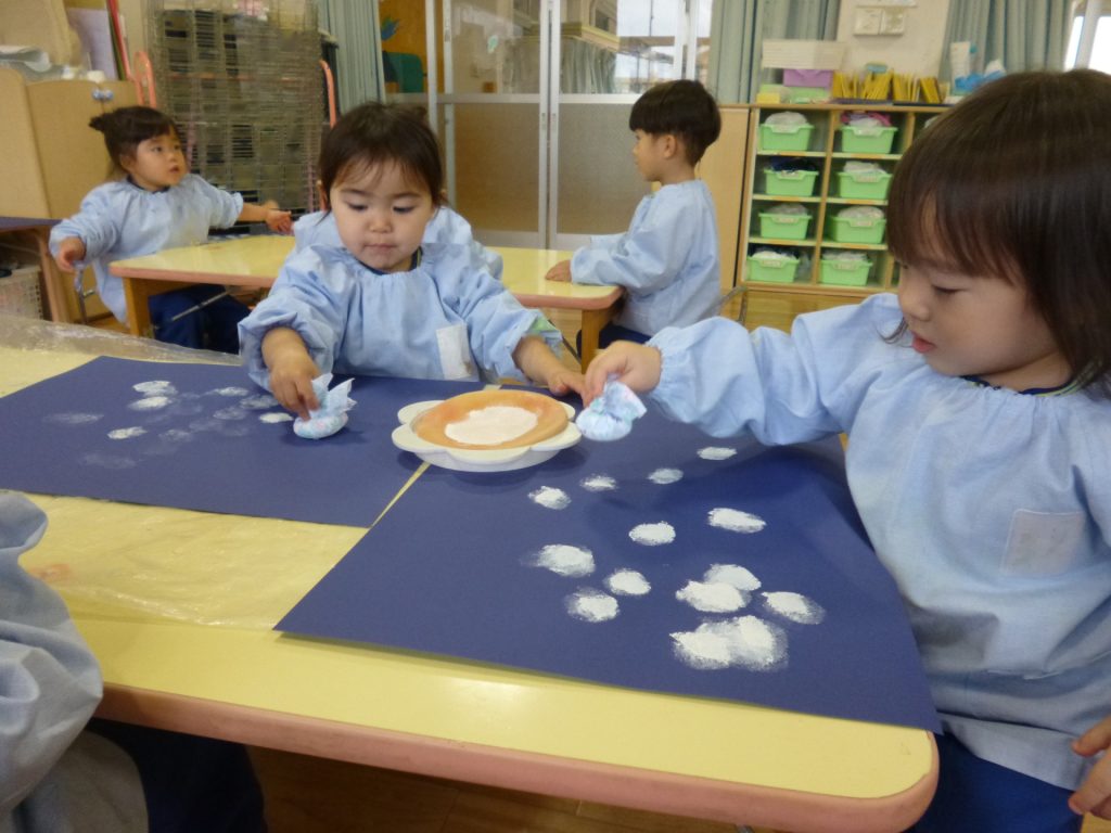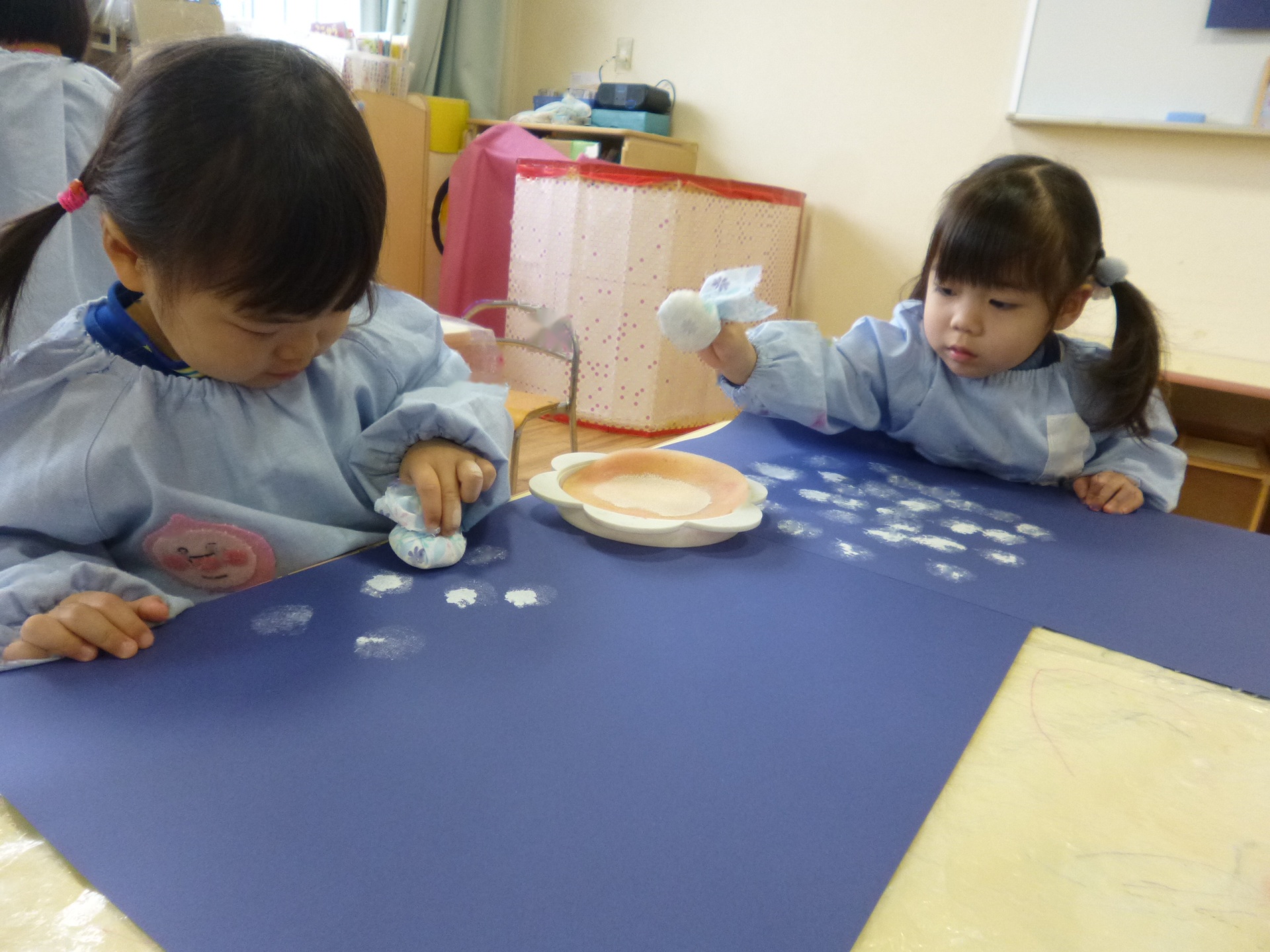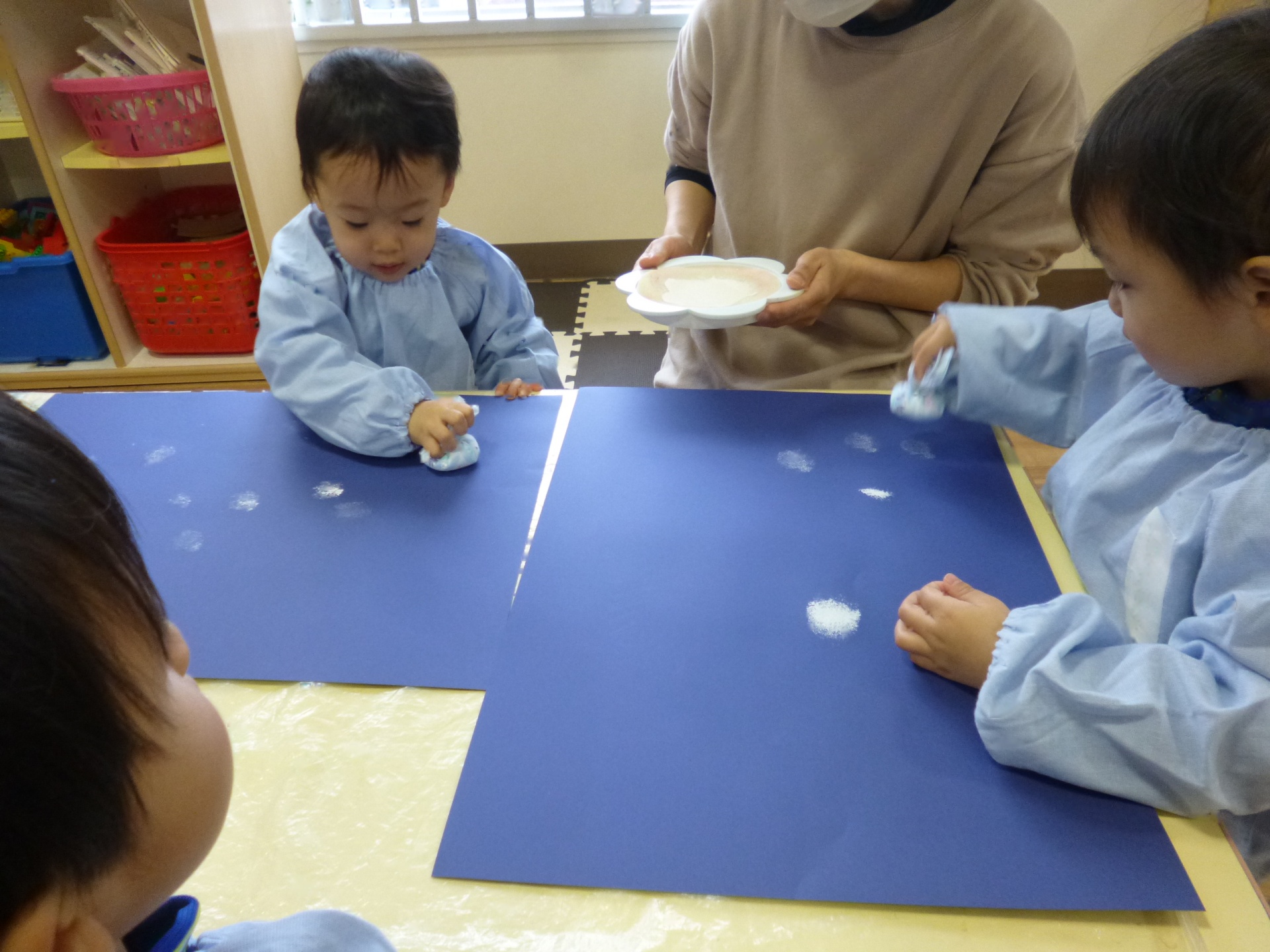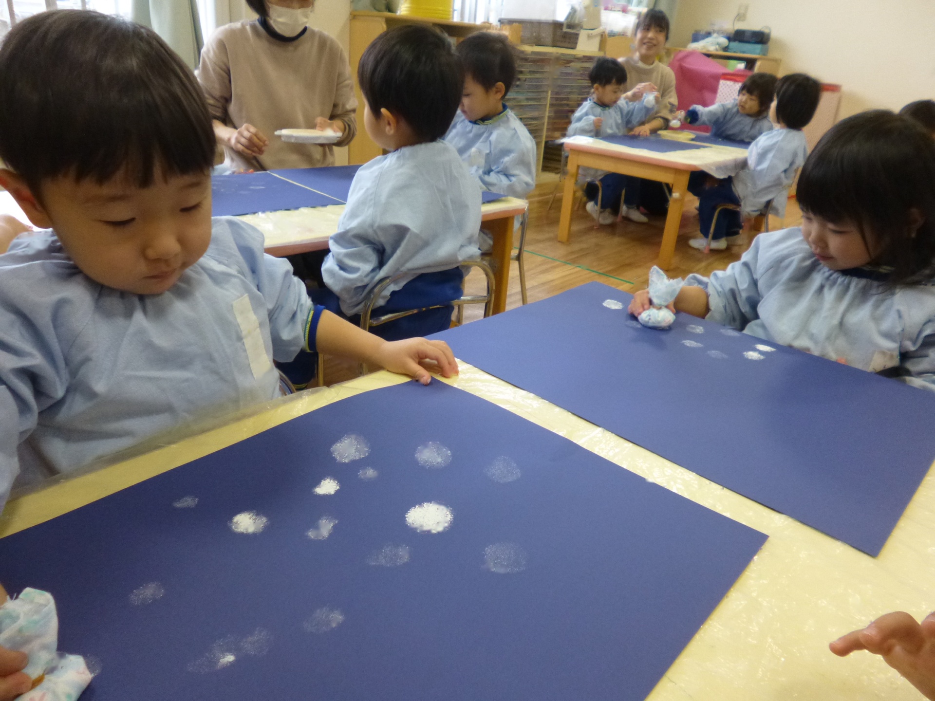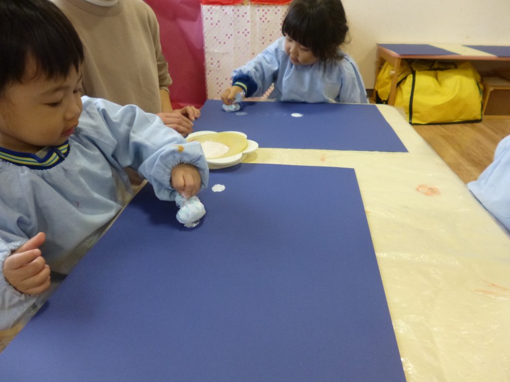 2025年12月24日 制作遊び~ゆき~ 先日制作したサンタさんの背景に、まっしろな絵の具でタンポ押しを楽しみました。「きょうは、ゆきを持ってきたよ!」と話すと、「えぇ!」と興味津々。それぞれ素敵な雪景色が完成しました。