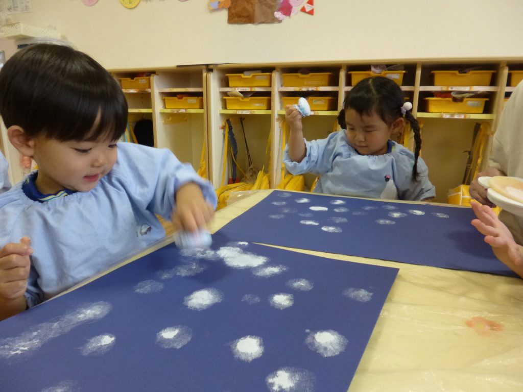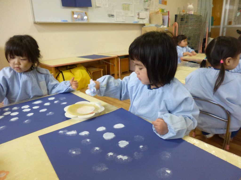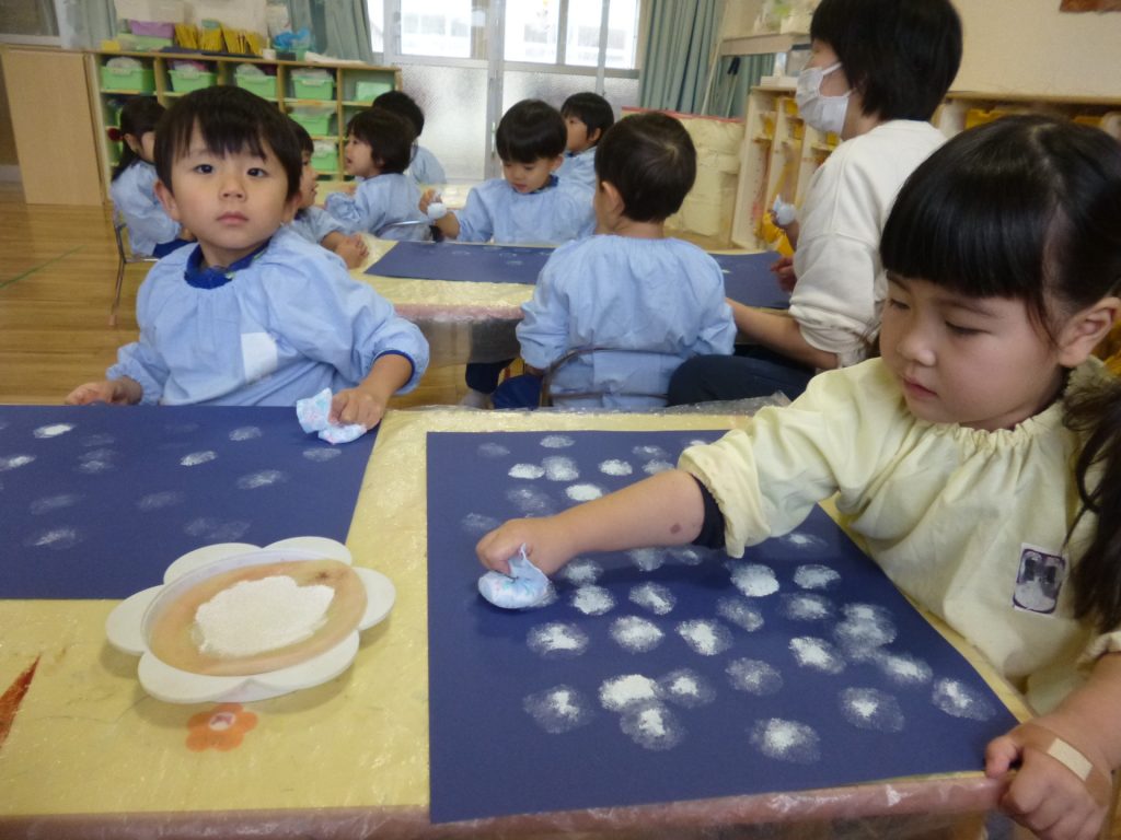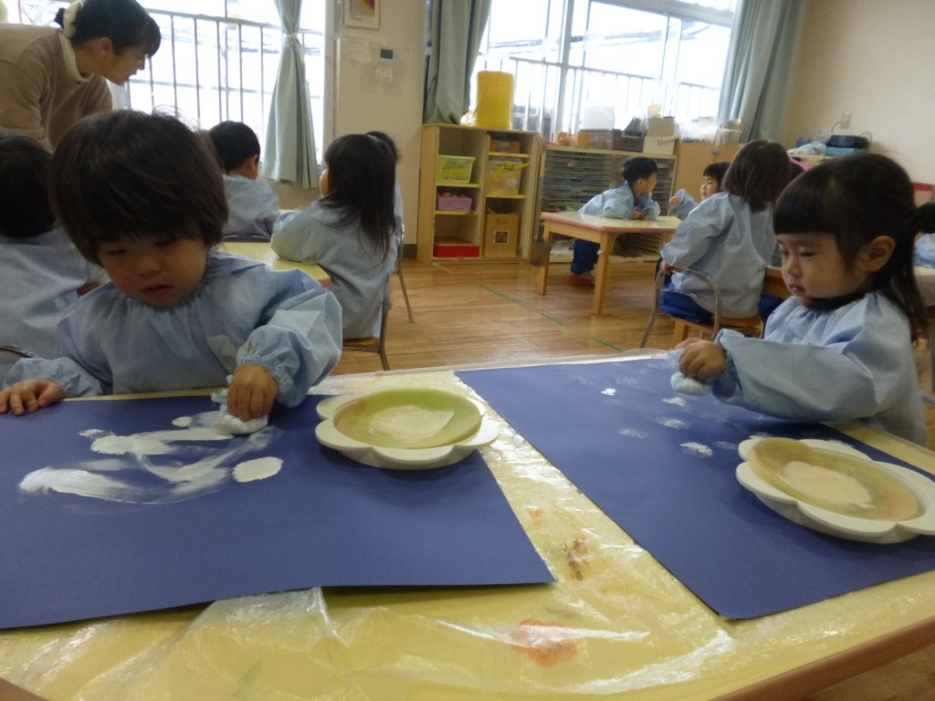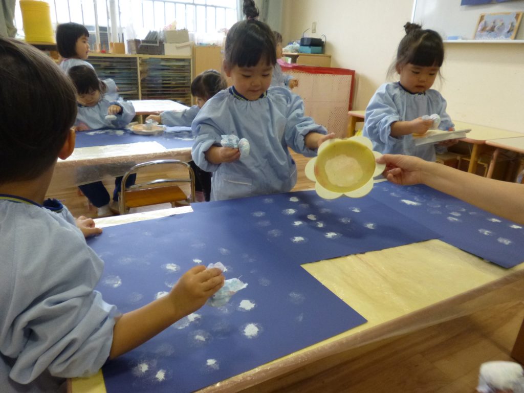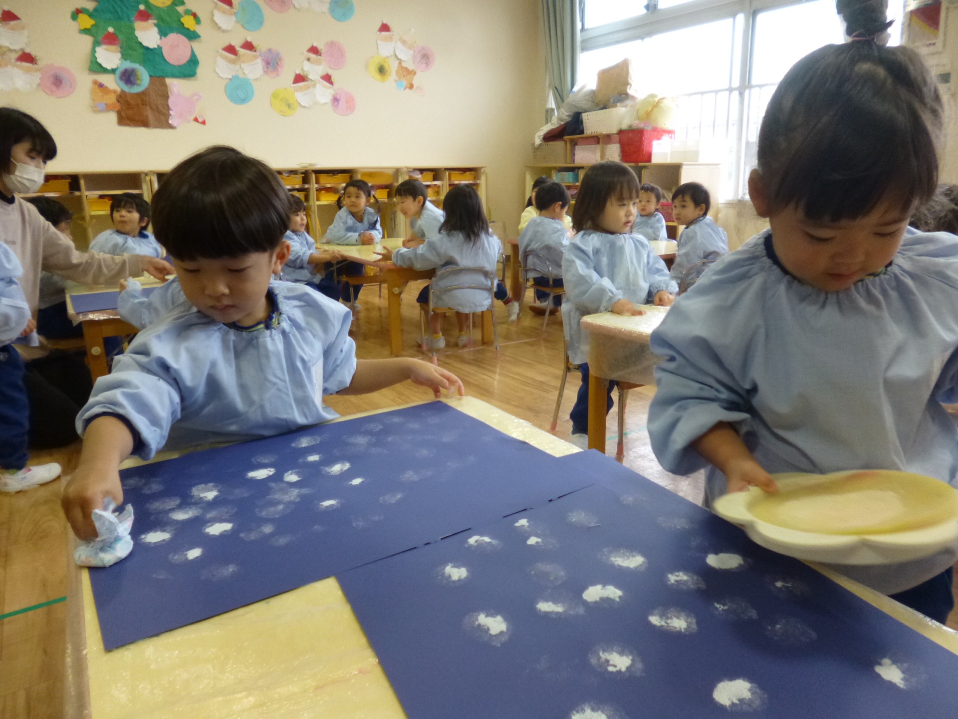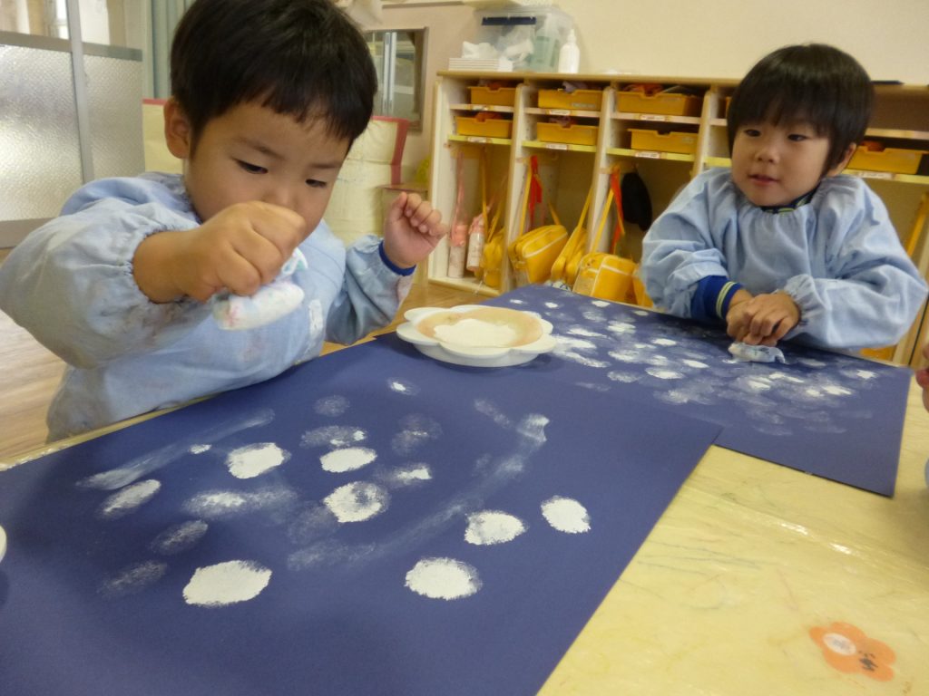 2025年12月24日 制作遊び~ゆき~ 先日制作したサンタさんの背景に、まっしろな絵の具でタンポ押しを楽しみました。「きょうは、ゆきを持ってきたよ!」と話すと、「えぇ!」と興味津々。それぞれ素敵な雪景色が完成しました。
