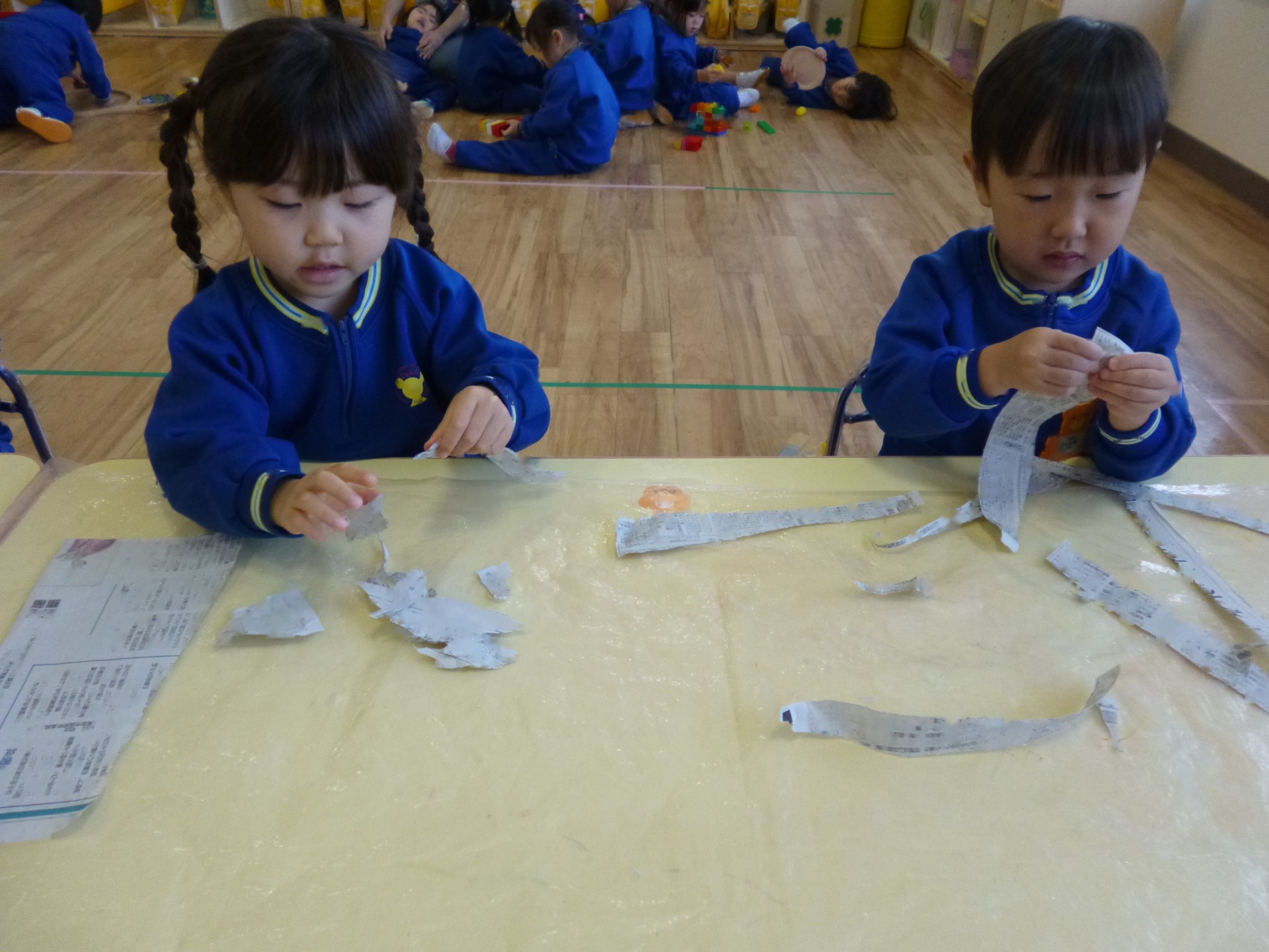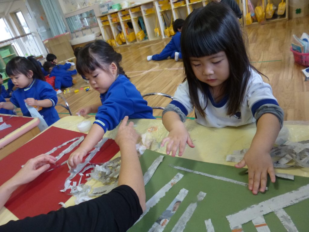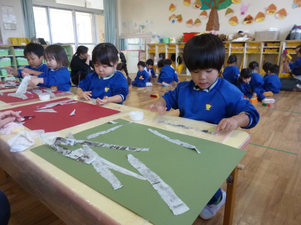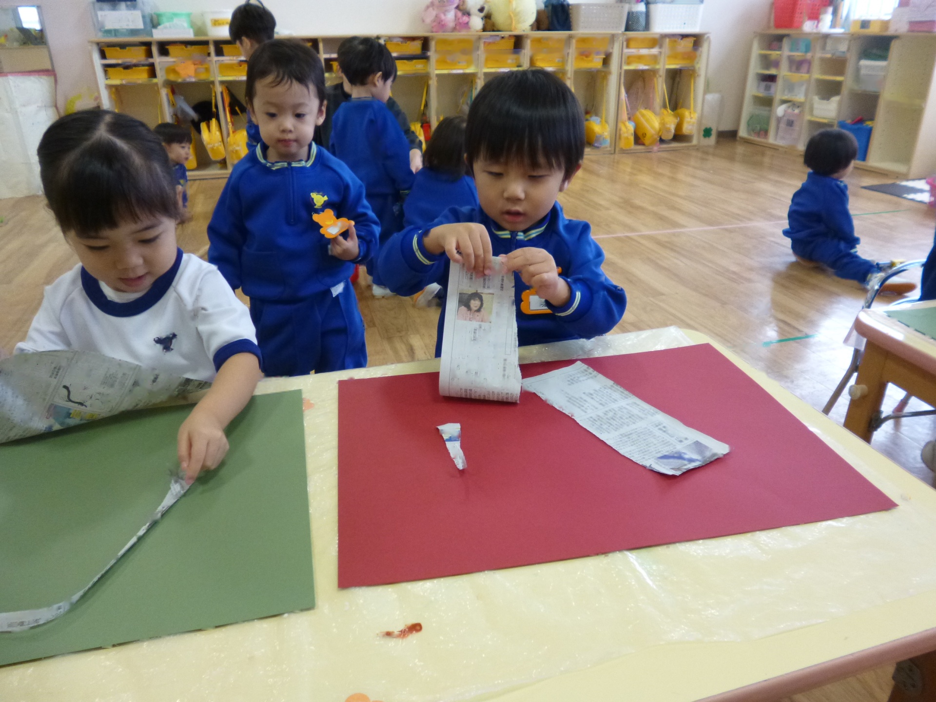 2025年11月18日 くり くり くり♪ 先日制作した「栗」のおうちを作りました!トゲトゲぬぐと♪子ども達の大好きな歌「くり くり くり」からすぐに栗のおうちをイメージしていたうずら組さんです。新聞紙をビリビリ破ってトゲトゲを表現しました。
