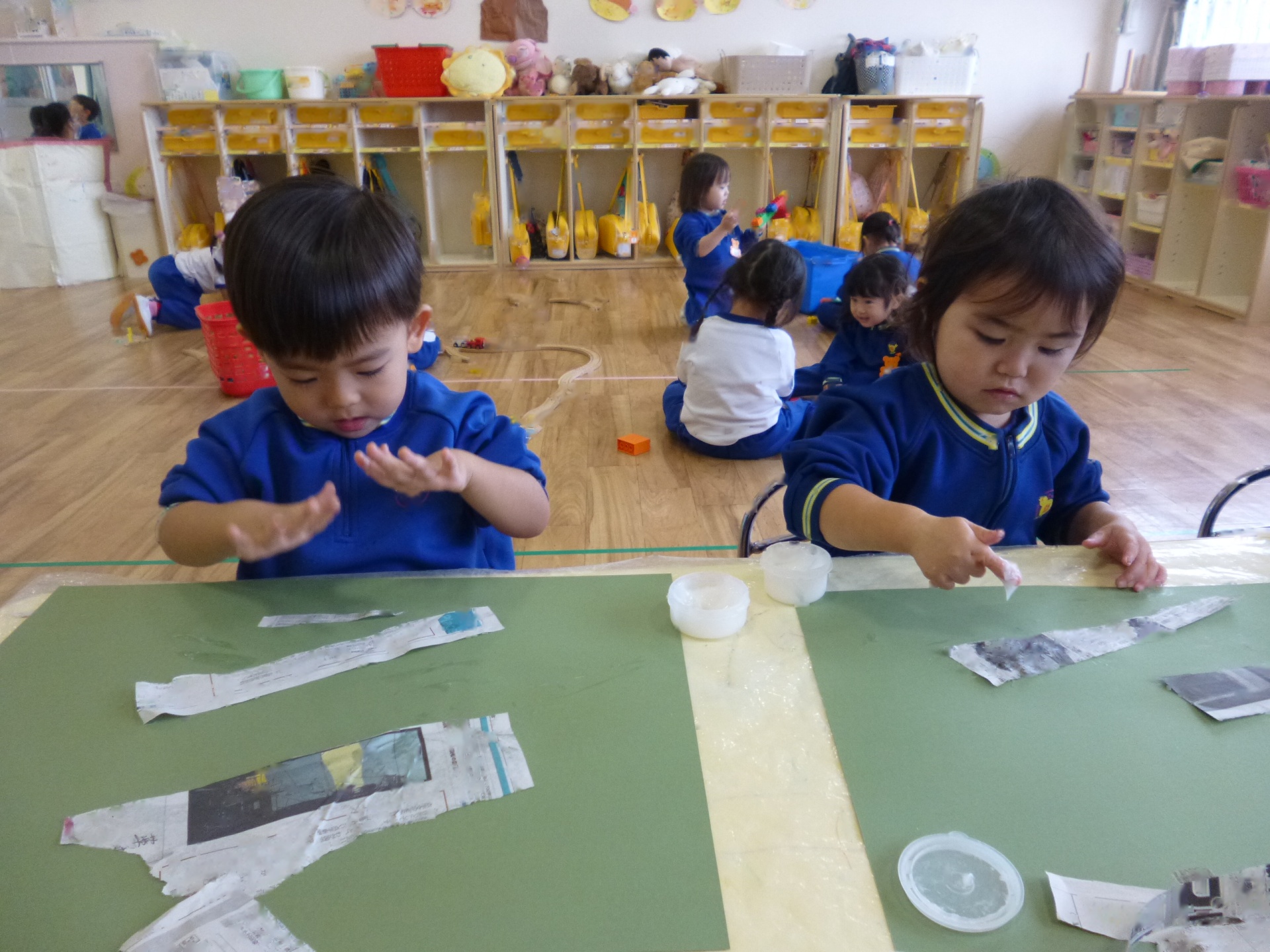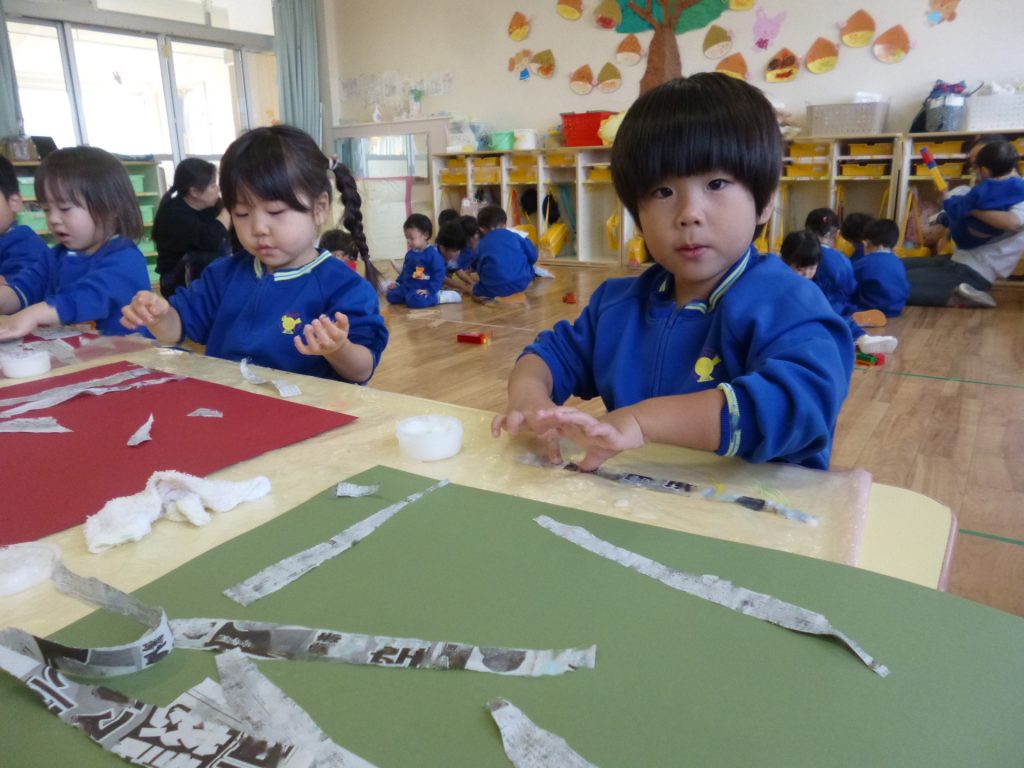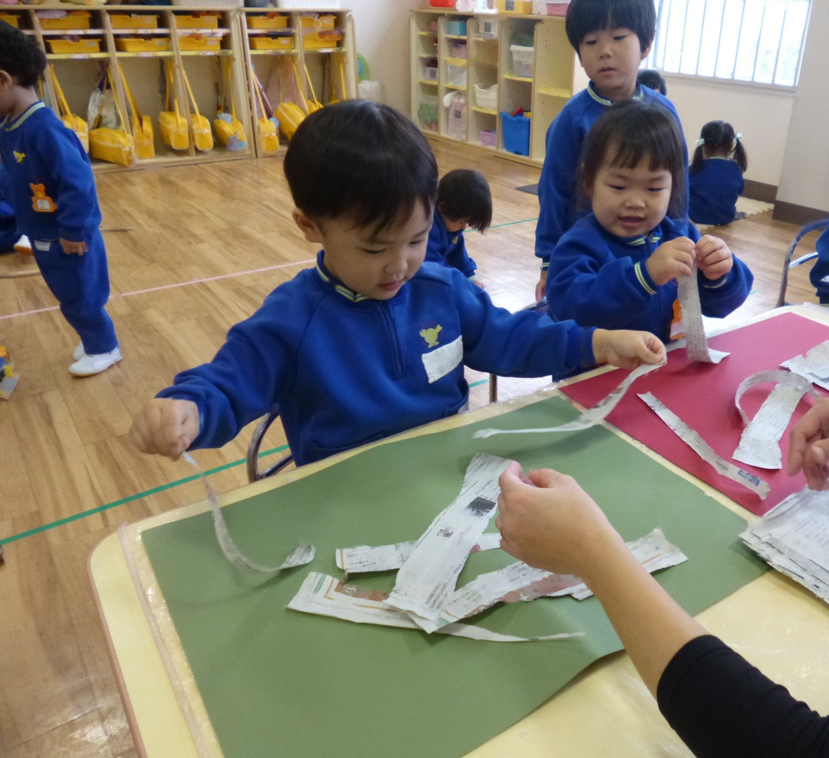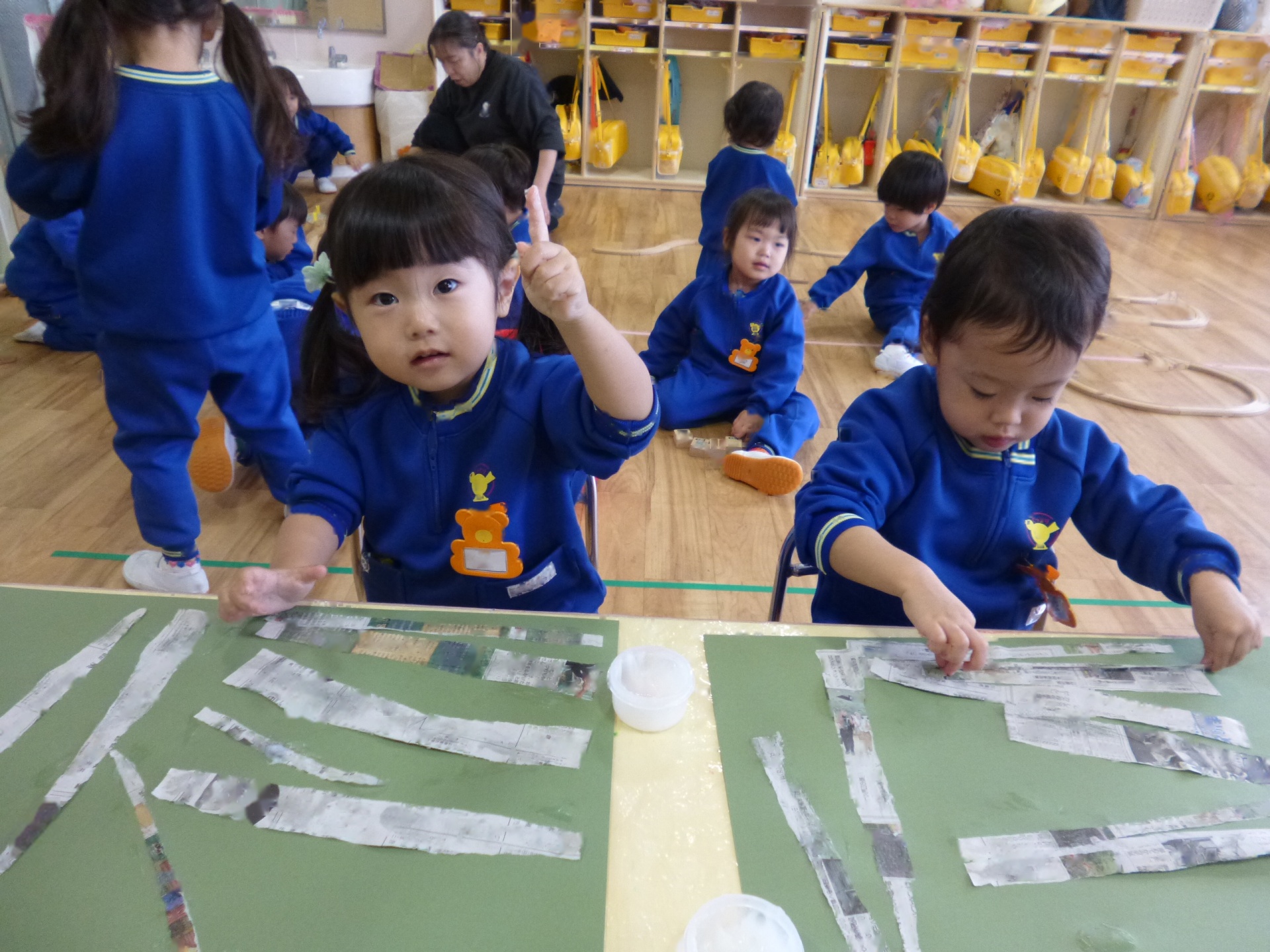 2025年11月18日 くり くり くり♪ 先日制作した「栗」のおうちを作りました!トゲトゲぬぐと♪子ども達の大好きな歌「くり くり くり」からすぐに栗のおうちをイメージしていたうずら組さんです。新聞紙をビリビリ破ってトゲトゲを表現しました。