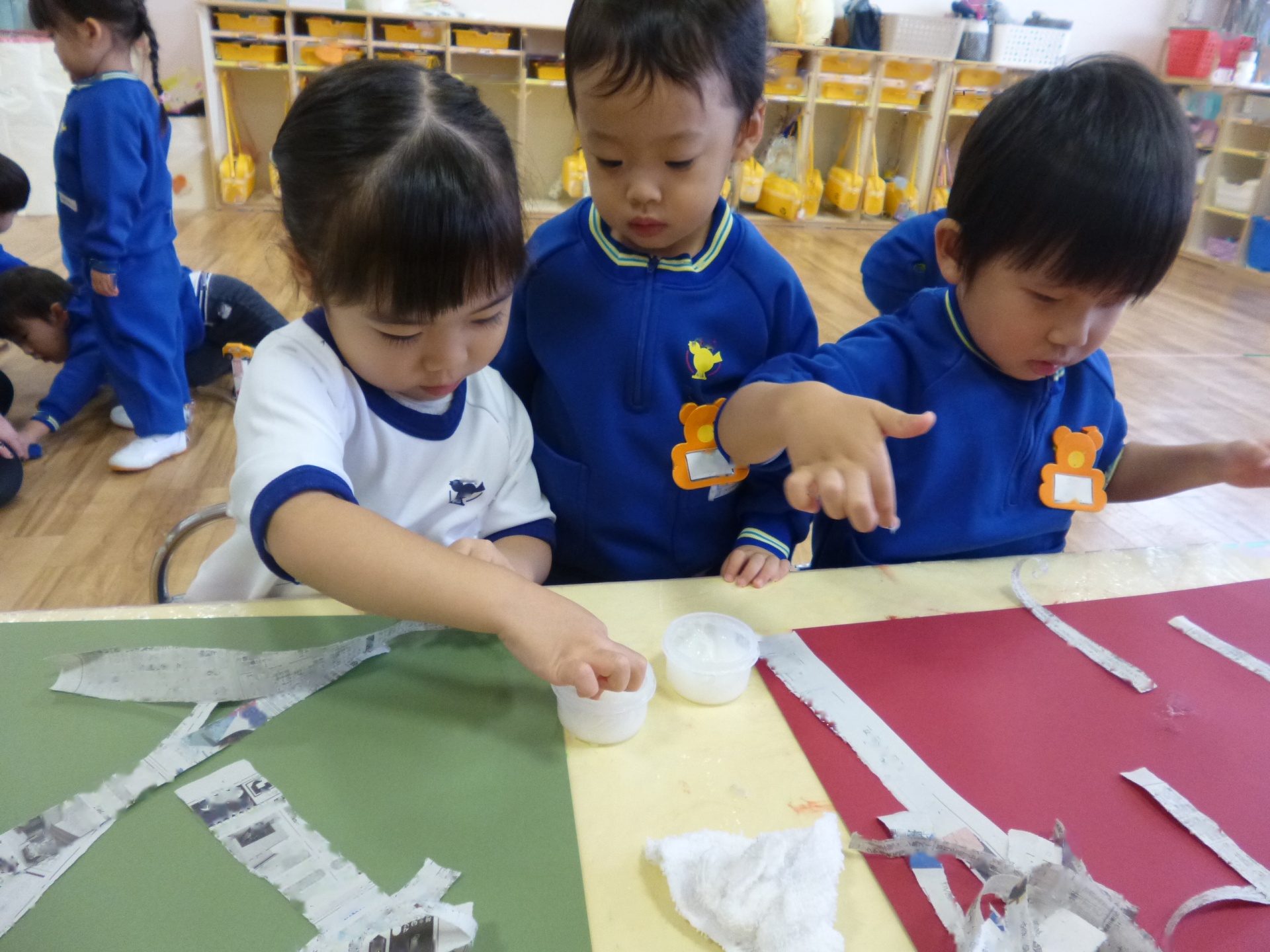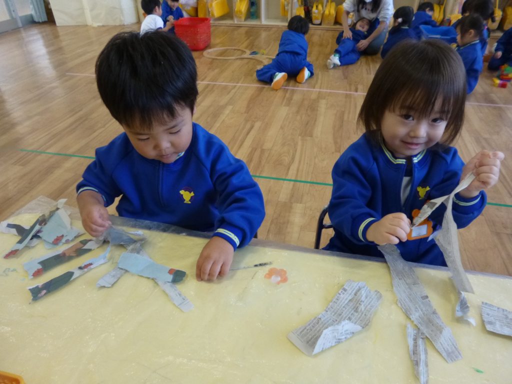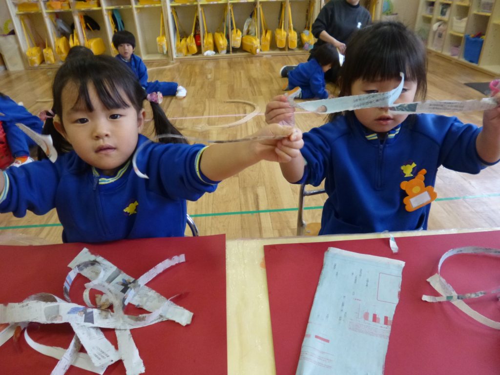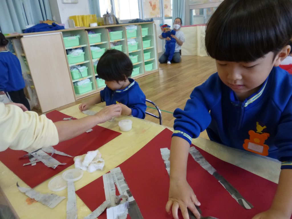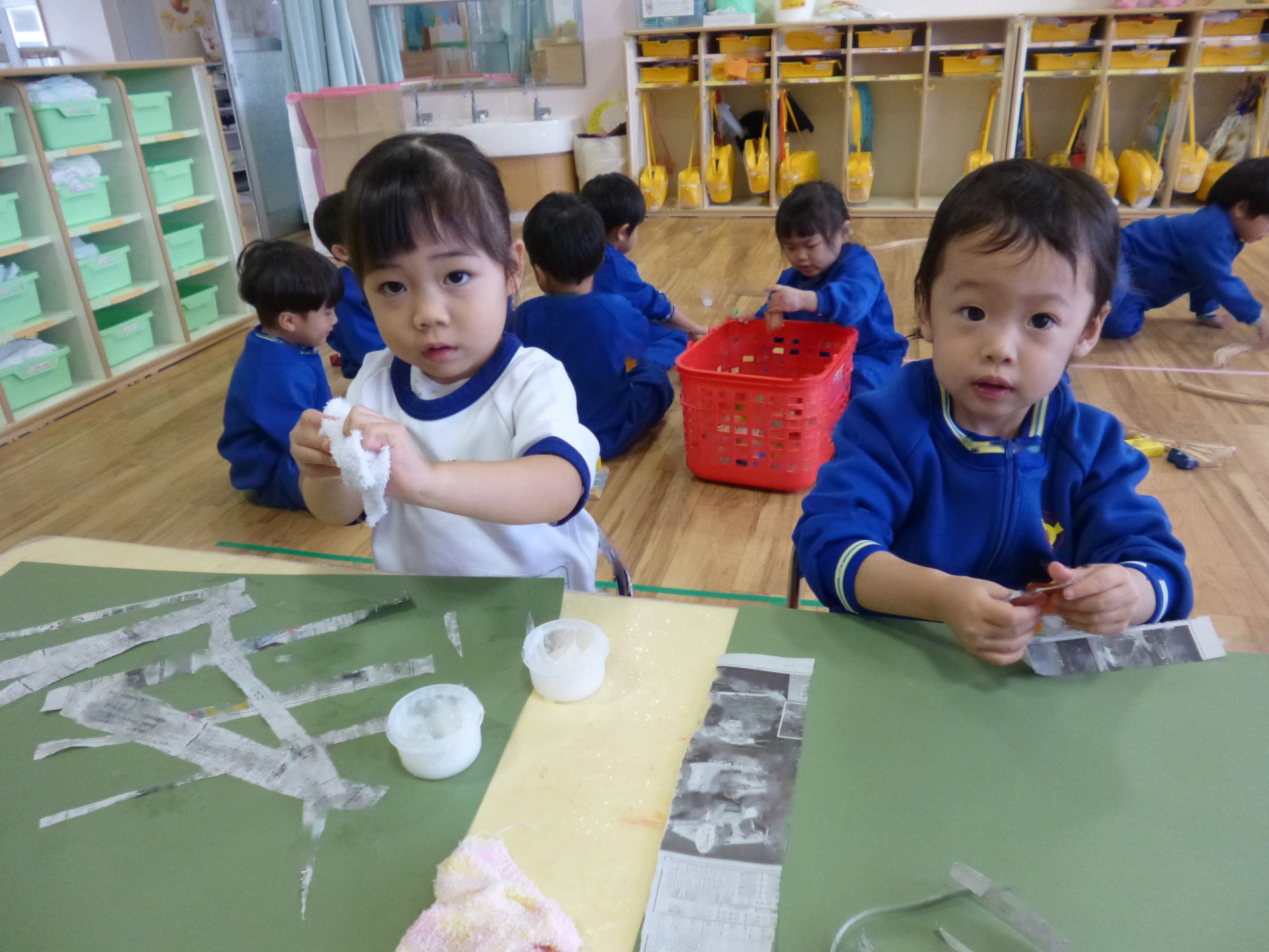 2025年11月18日 くり くり くり♪ 先日制作した「栗」のおうちを作りました!トゲトゲぬぐと♪子ども達の大好きな歌「くり くり くり」からすぐに栗のおうちをイメージしていたうずら組さんです。新聞紙をビリビリ破ってトゲトゲを表現しました。