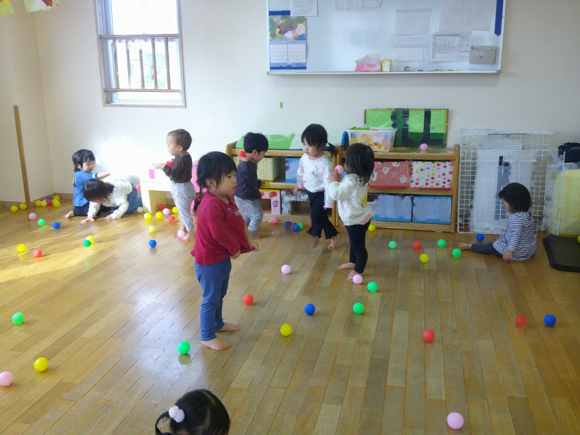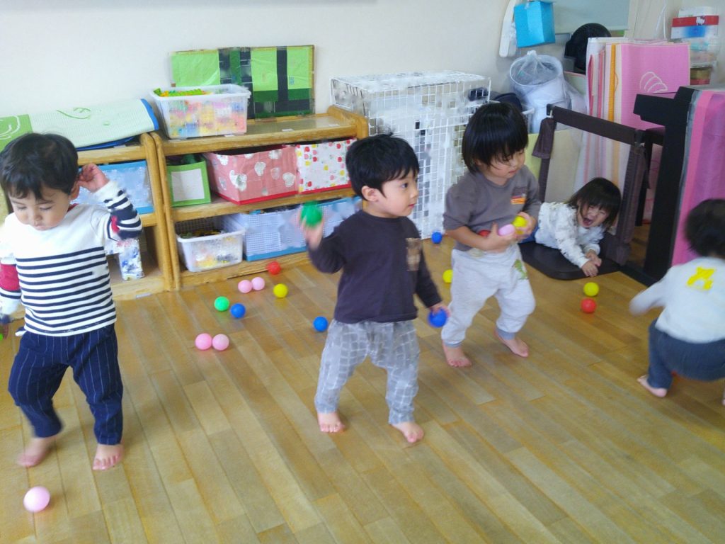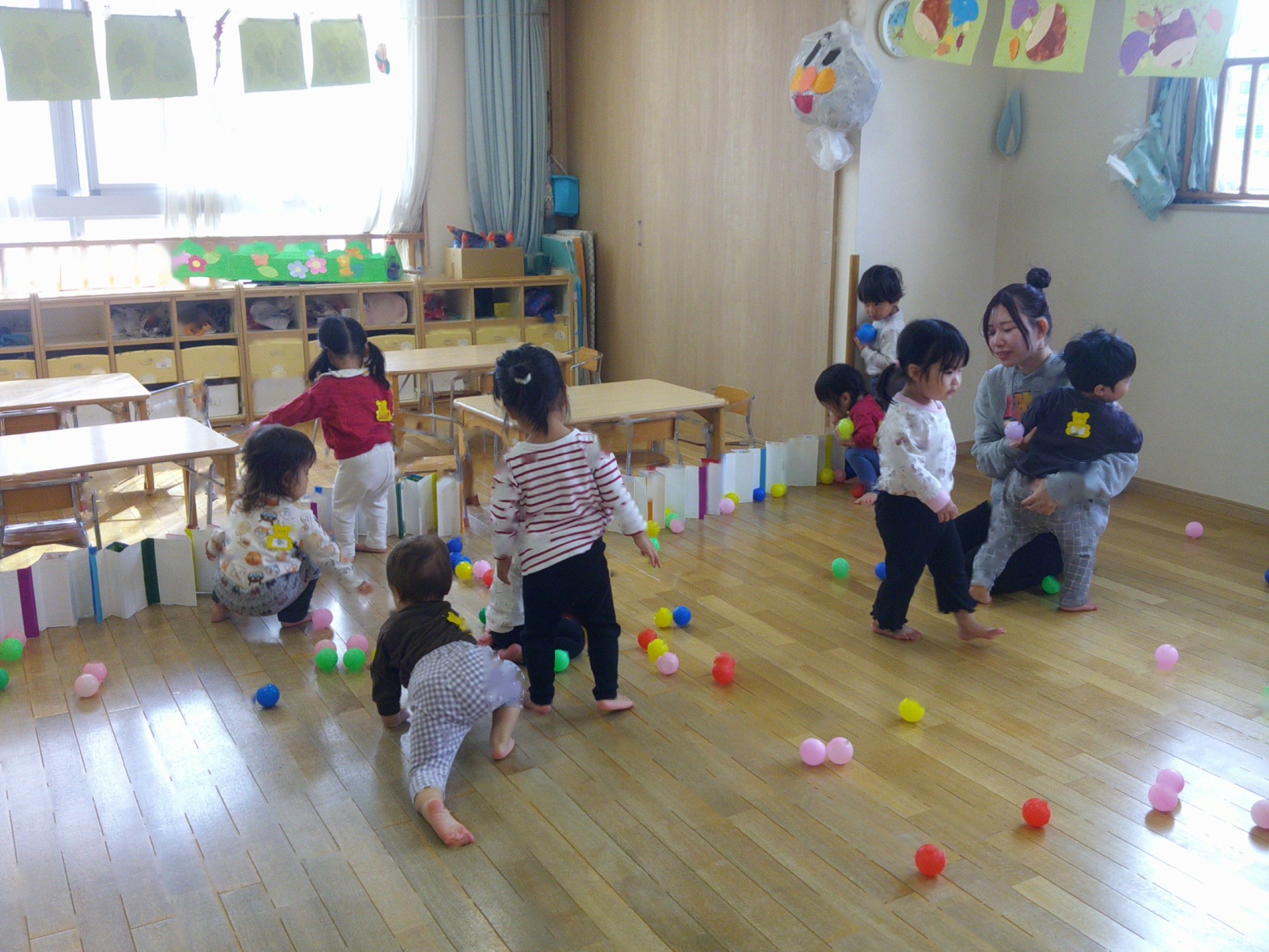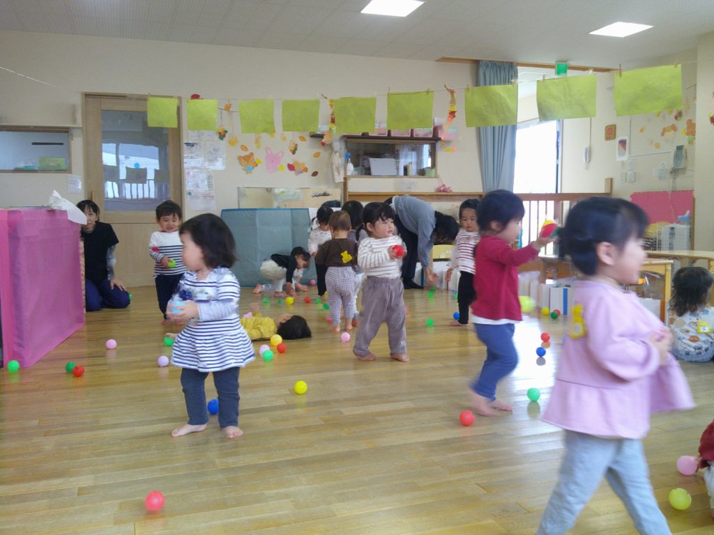 2025年11月12日 カラーボールで遊んだよ☆ 今日はカラーボールで遊びました。ボールを「ぽ~ん」と投げたり、服の中や牛乳パックの中に入れてみたり、職員と一緒に「どんな色がすき」の歌を口ずさみながらいろいろな色を探したりなど、それぞれが思い思いに楽しむ姿が見られました。カラーボールでの遊びは久しぶりでしたが、以前より上手に投げれたり、遠くに飛ばせるようになっていたりする子どもの姿も多く、改めて成長を感じ嬉しかったです♡今後の成長が今からますます楽しみです!