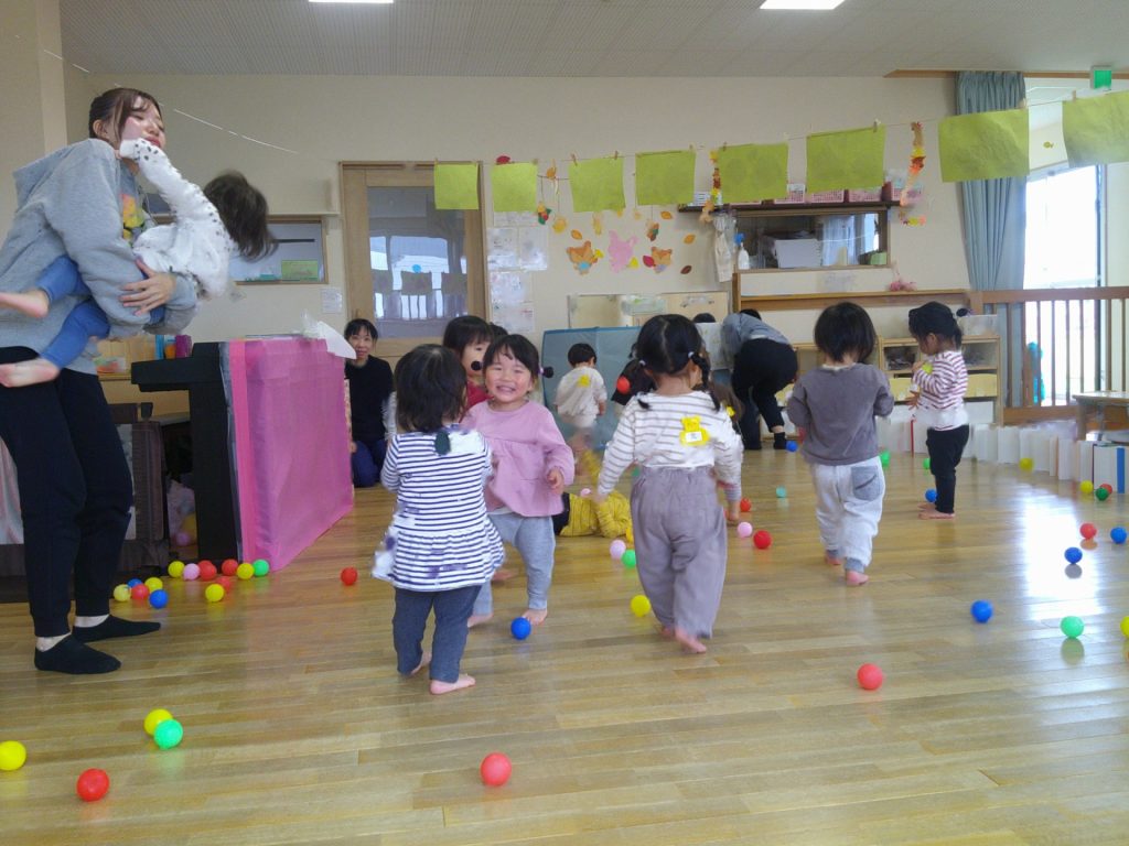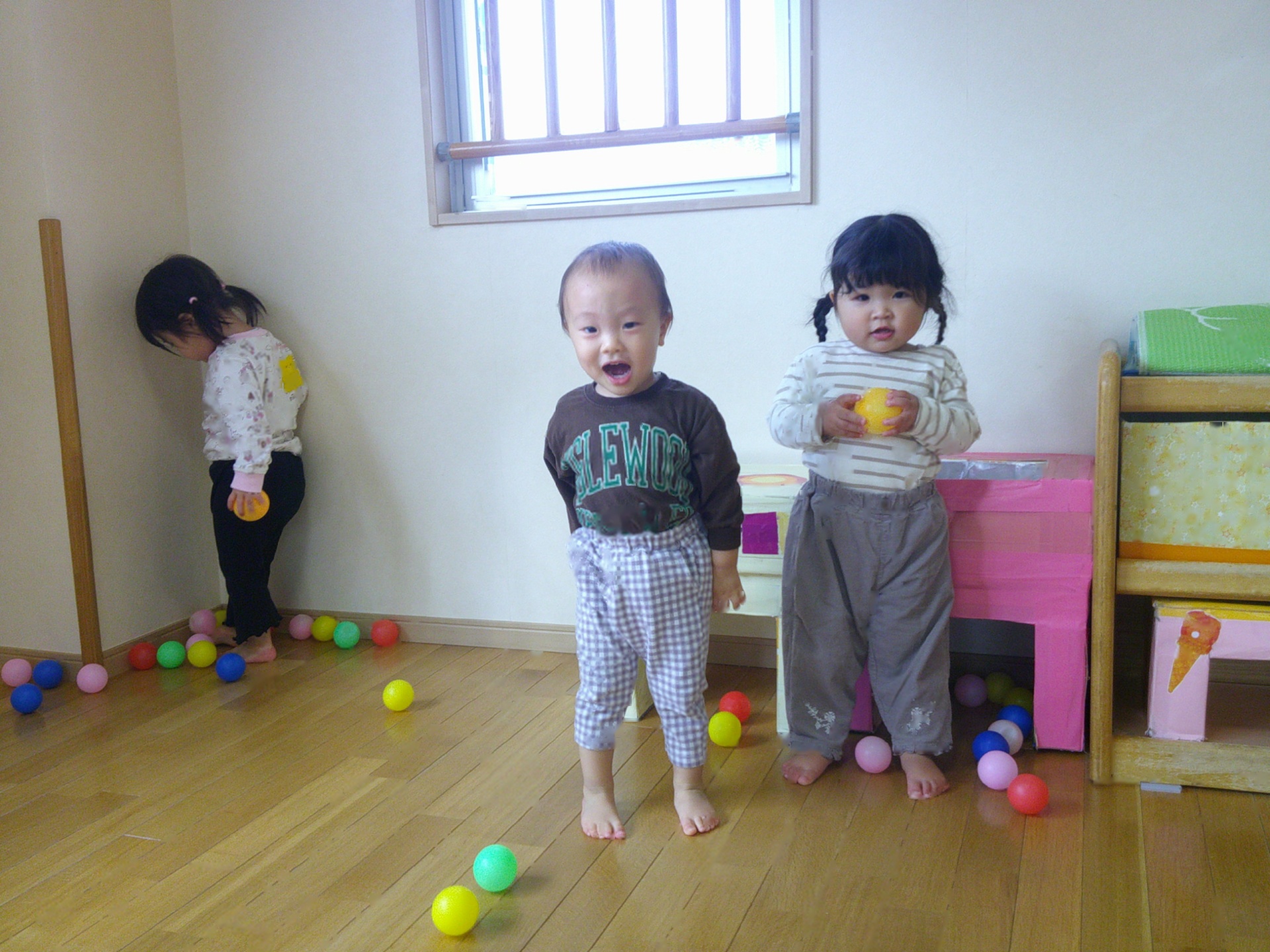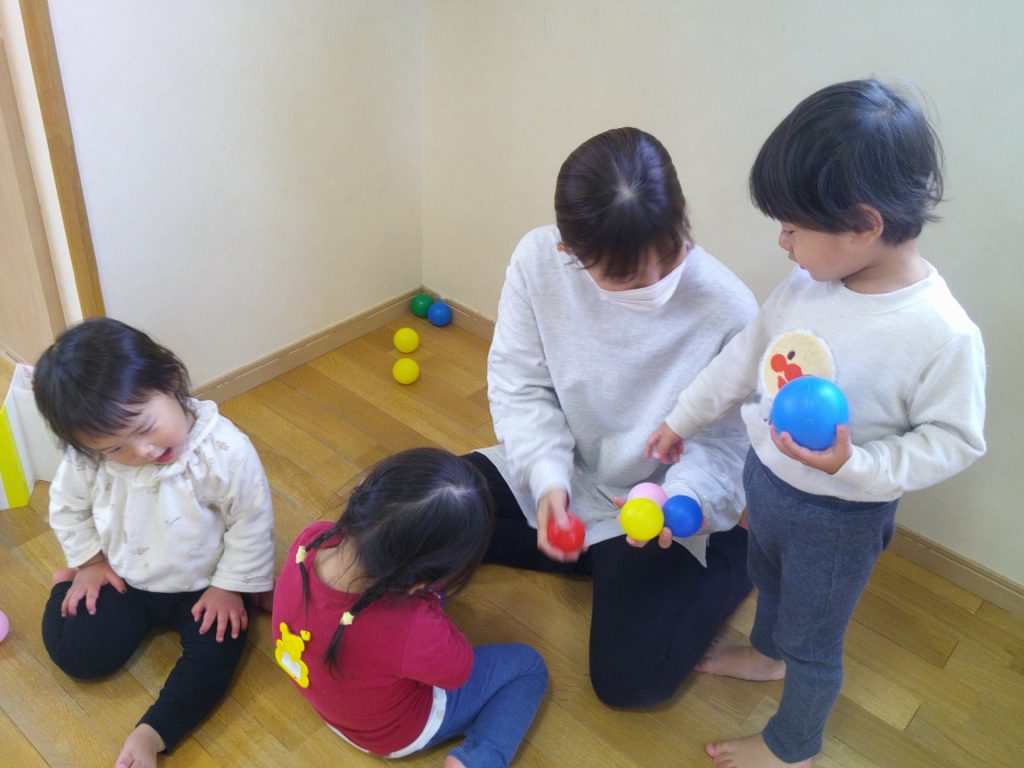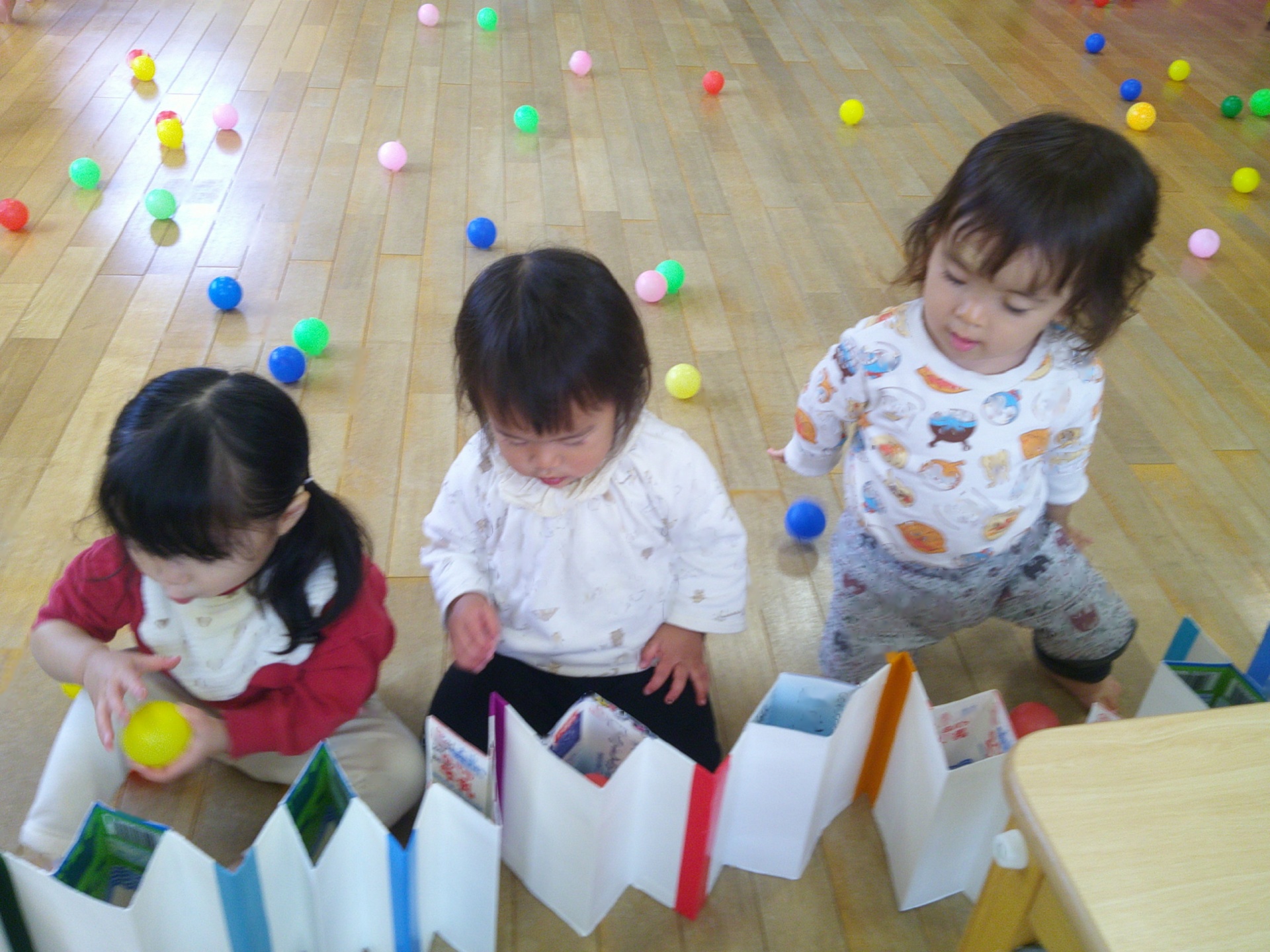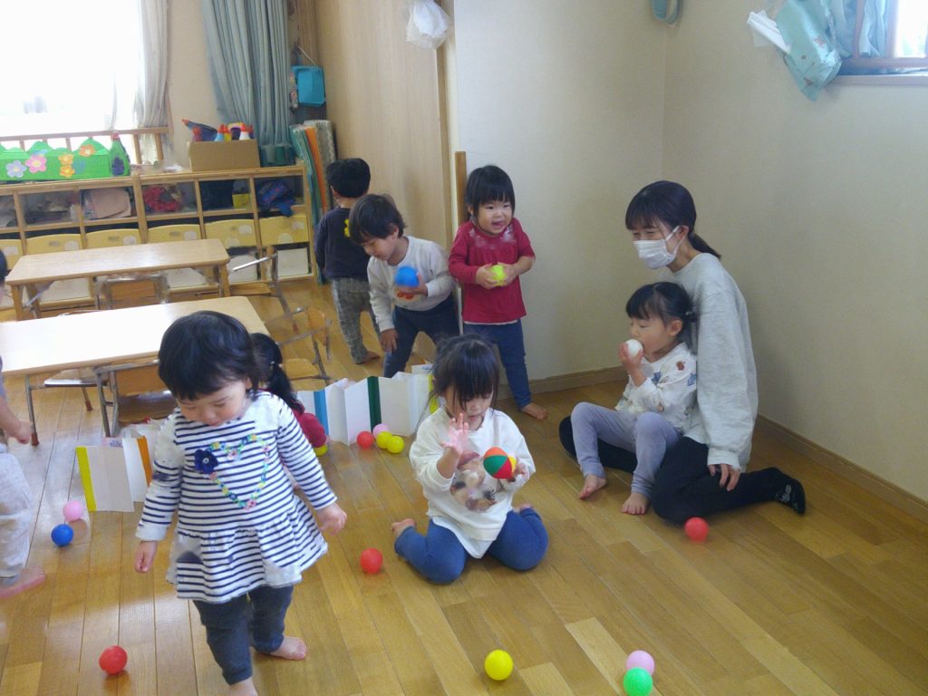 2025年11月12日 カラーボールで遊んだよ☆ 今日はカラーボールで遊びました。ボールを「ぽ~ん」と投げたり、服の中や牛乳パックの中に入れてみたり、職員と一緒に「どんな色がすき」の歌を口ずさみながらいろいろな色を探したりなど、それぞれが思い思いに楽しむ姿が見られました。カラーボールでの遊びは久しぶりでしたが、以前より上手に投げれたり、遠くに飛ばせるようになっていたりする子どもの姿も多く、改めて成長を感じ嬉しかったです♡今後の成長が今からますます楽しみです!